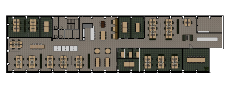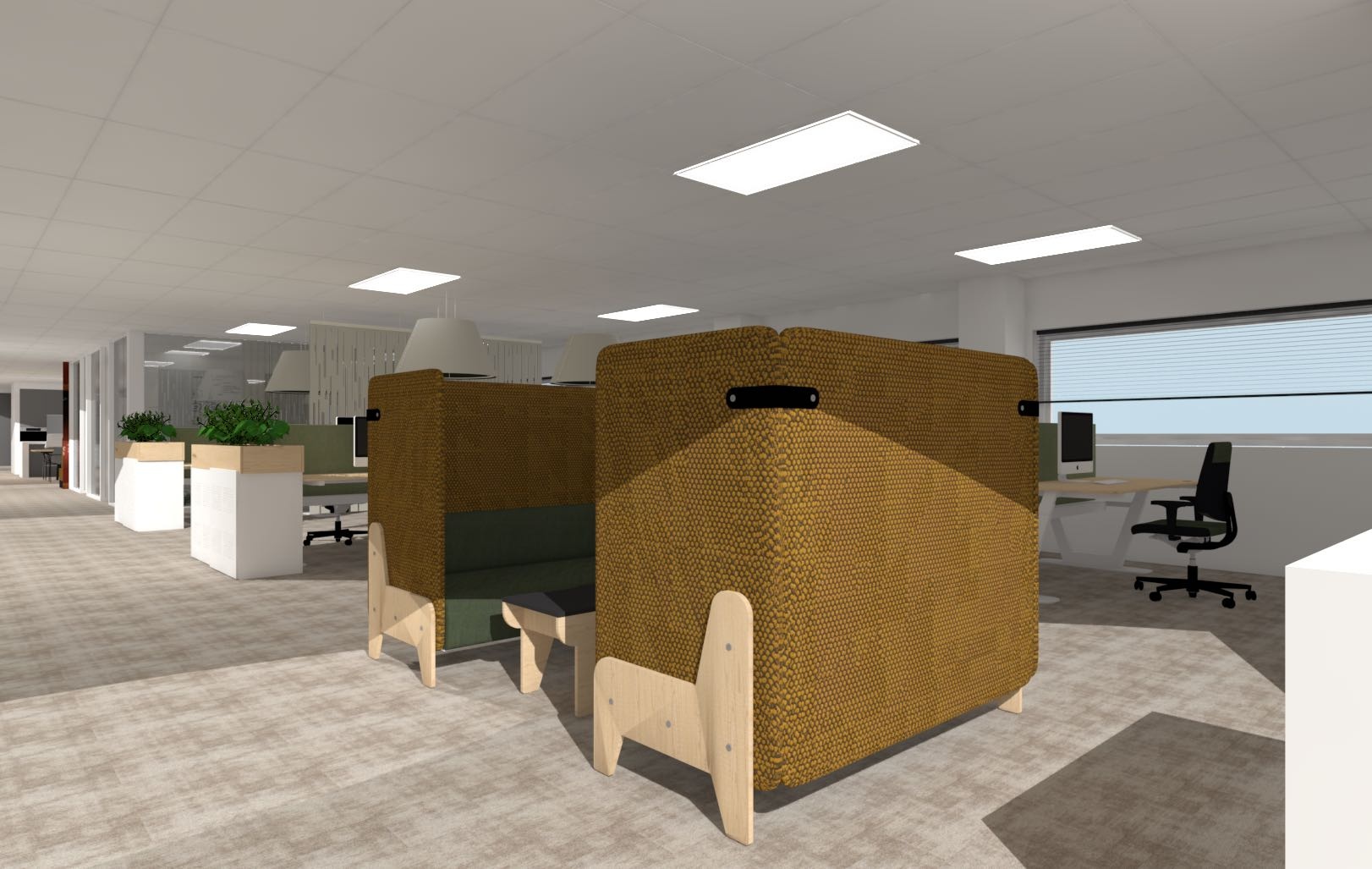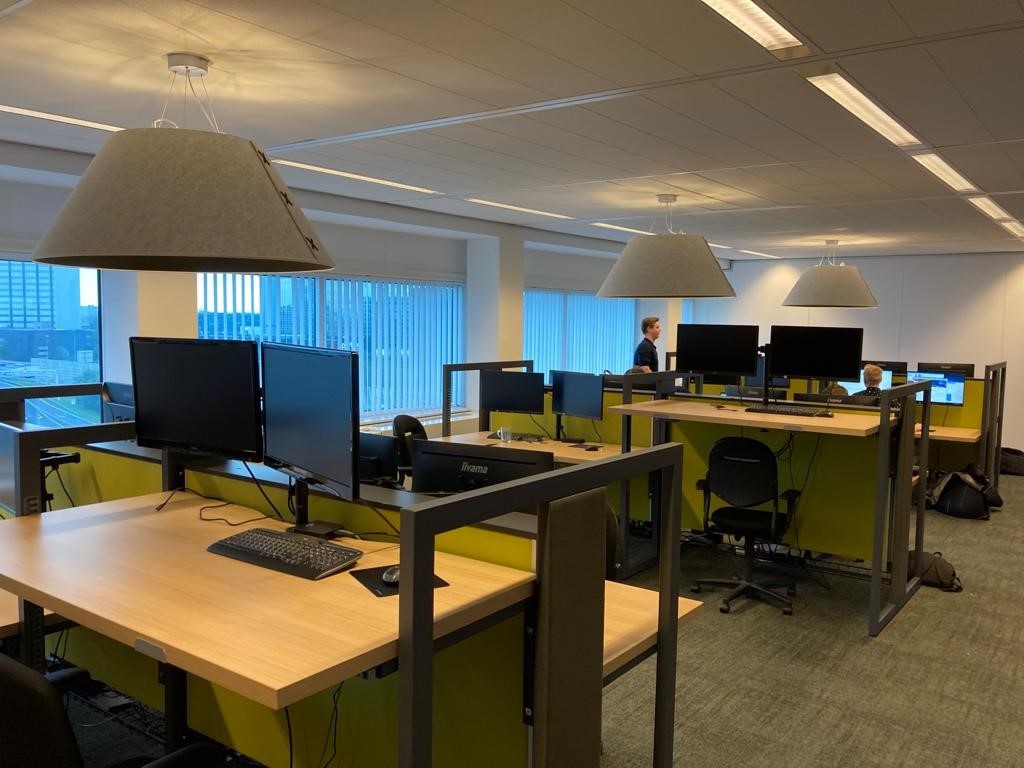 Totaalinrichting 60 werkplekken Interieurontwerp Zit-sta werkplekken Projectvloeren: PVC en tapijt Concentratieplekken Verlichting Vergaderruimtes Akoestische panelen