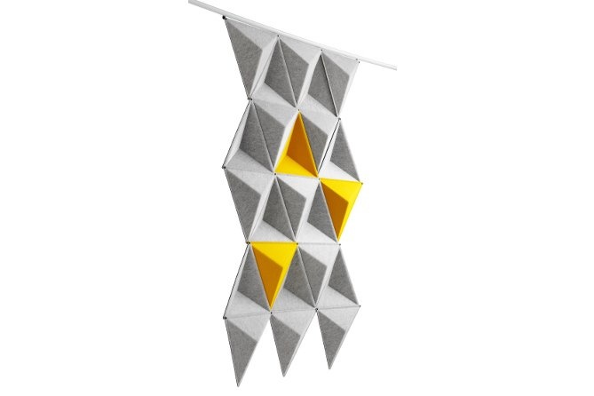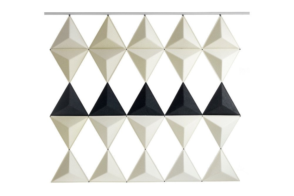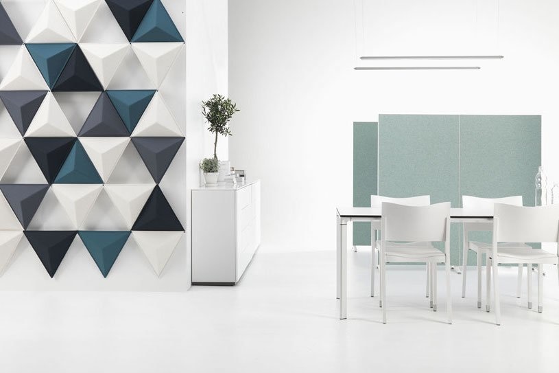 De hoeken verspreiden geluidsgolven gelijk waardoor het product voor een betere geluidsomgeving zorgt. U kunt de Abstracta Aircone opgehangen aan het plafond of tegen de muur op een aluminium rail. Hiermee kunt u in iedere kantoorruimte de juiste akoestische oplossing creëren bij geluidshinder.