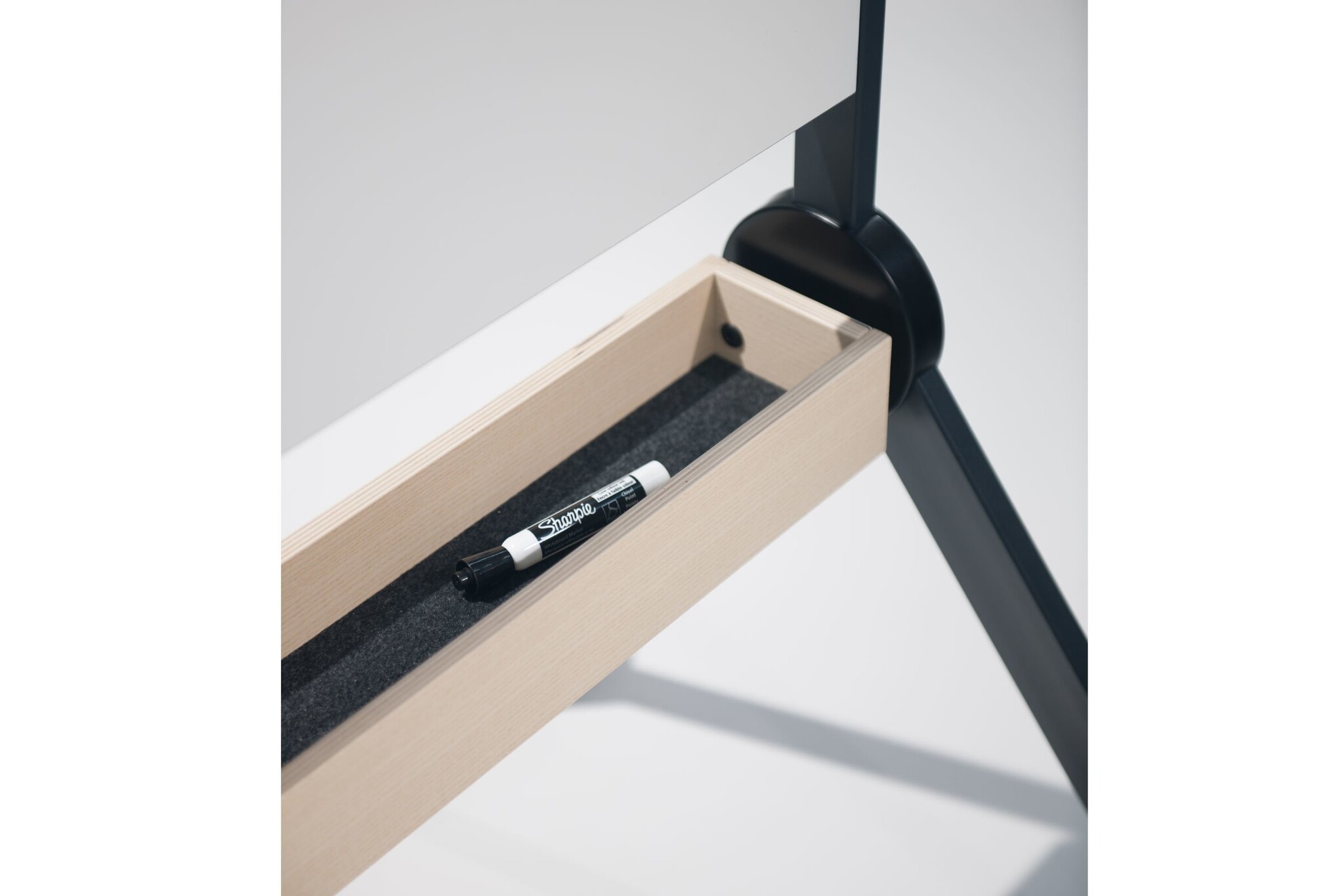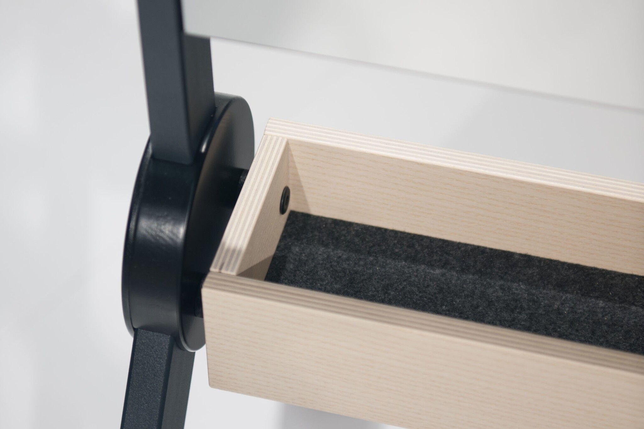 Het bord is mobiel, dubbelzijdig en heeft een antraciet grijs stalen frame met wielen. Onder het schrijfoppervlak van de Abstracta Draft is een houten eiken lade voor bijvoorbeeld markers, magneten en wissers. De houten lade geeft een moderne look aan het schrijfbord.