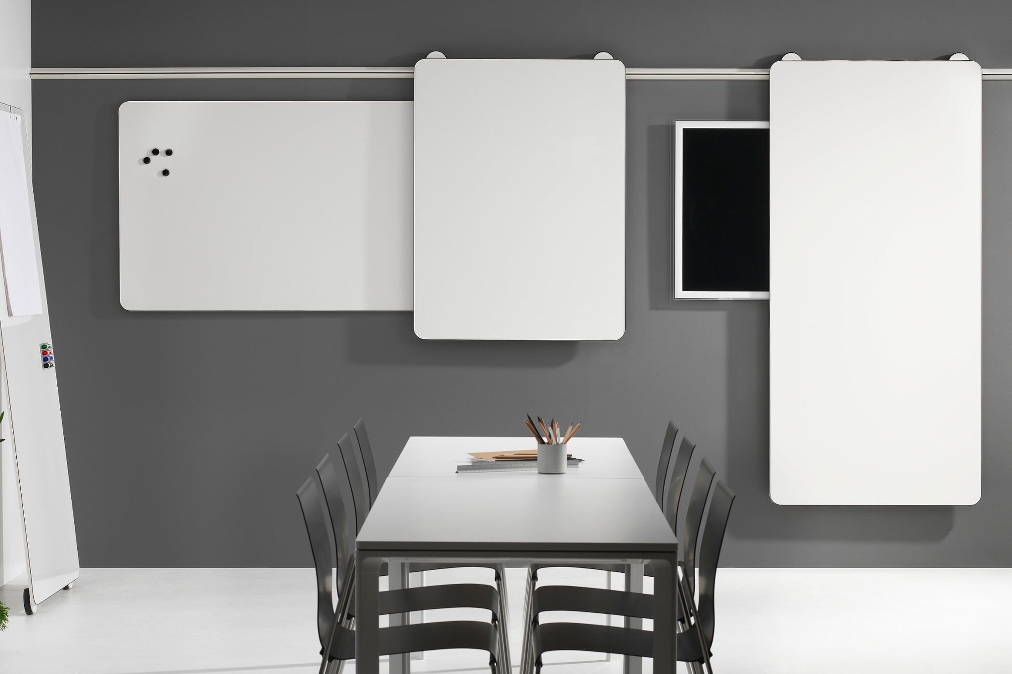 Door het unieke ontwerp kunnen meerdere schrijfborden naast elkaar hangen wat zorgt voor een speels effect op de muur. De whiteboards kunnen middels de rail worden verschoven over de gehele rail.