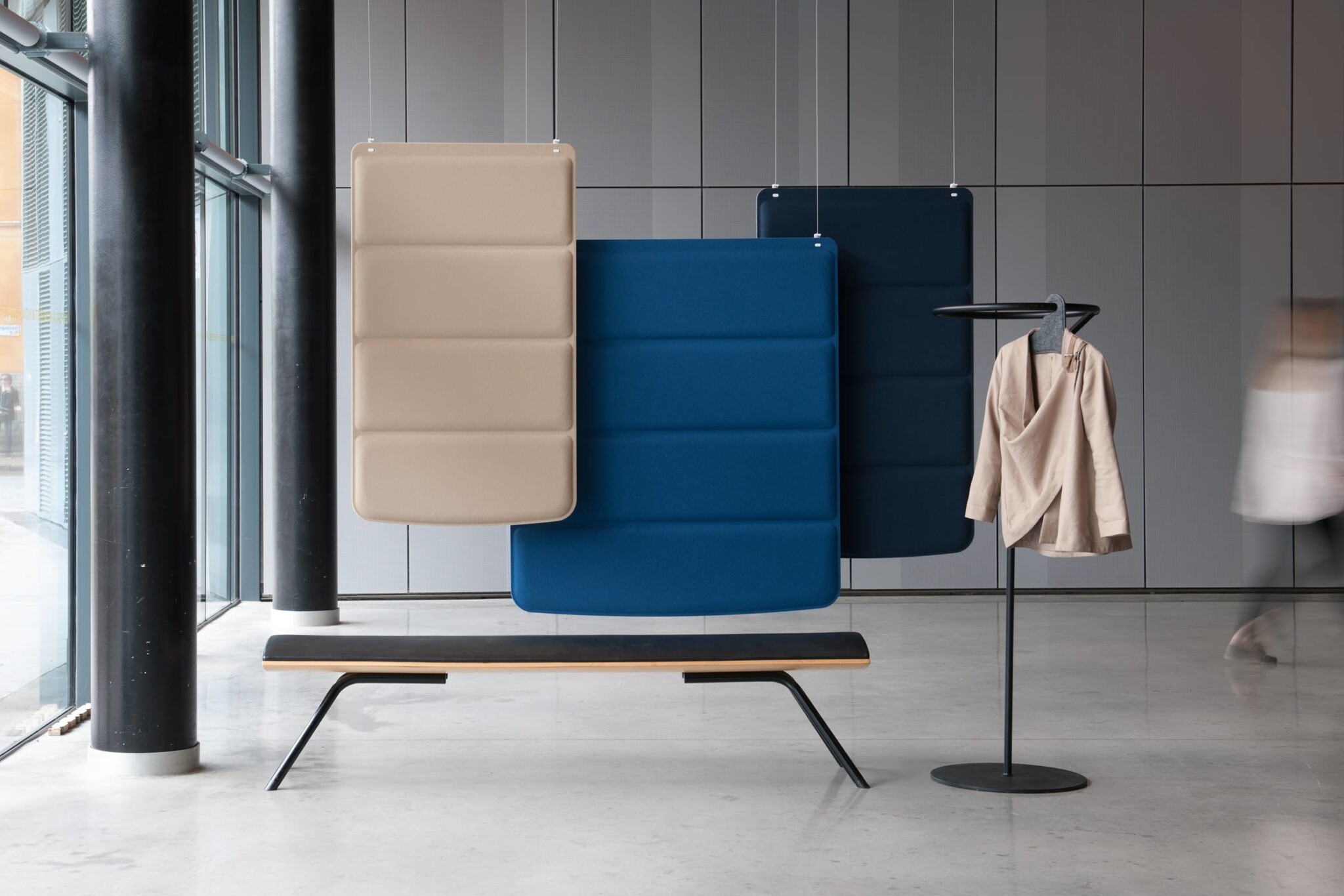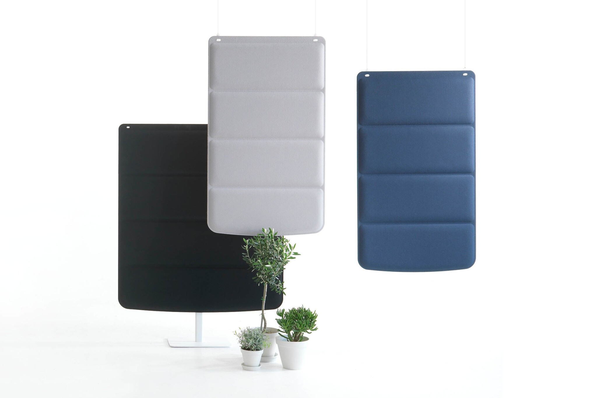 Plaid opgehangen aan het plafond werkt als een geluidsdemper zonder onnodige vloeroppervlak te gebruiken. De schermen zijn gemaakt van gelaagd vilt en worden opgehangen aan het plafond met behulp van flexibele draden. Het scherm is eenvoudig te monteren.