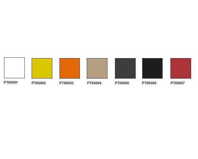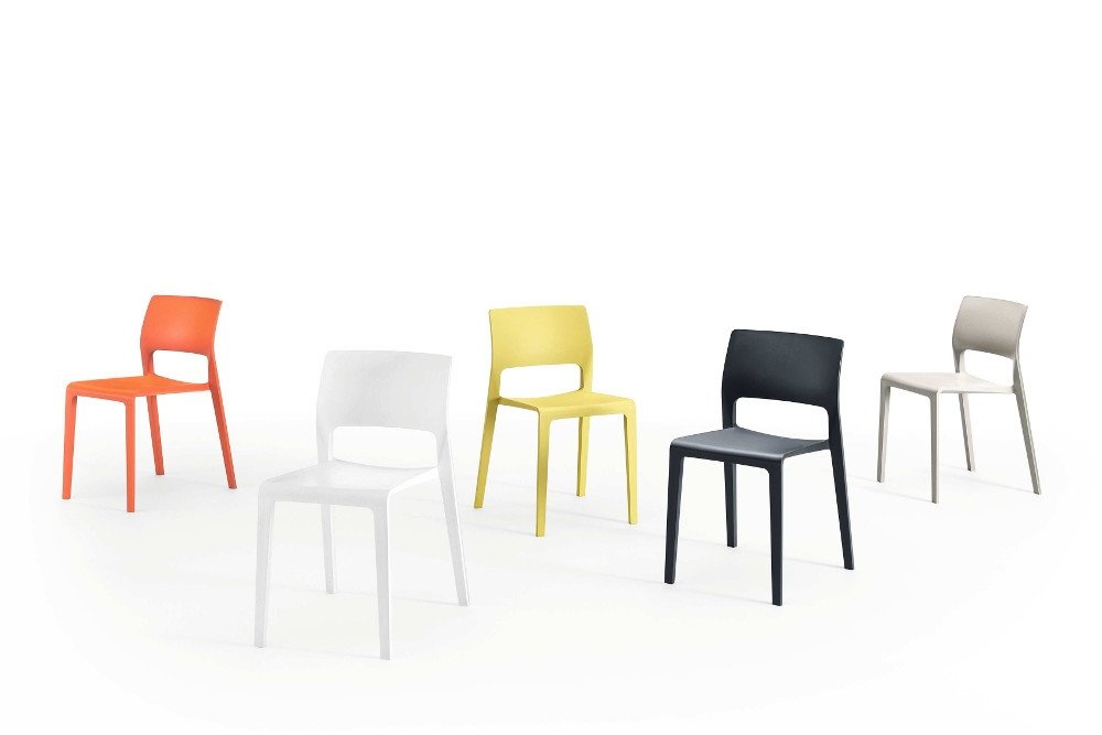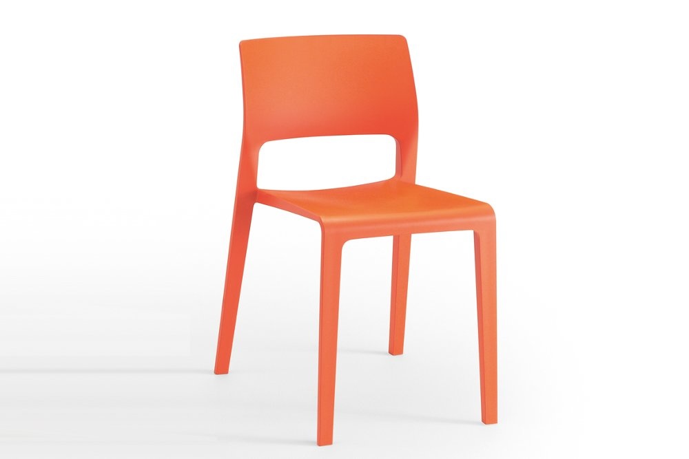 De stoel is leverbaar in 7 kleuren: wit, zwart, zand, antraciet, oranje, geel en rood.
