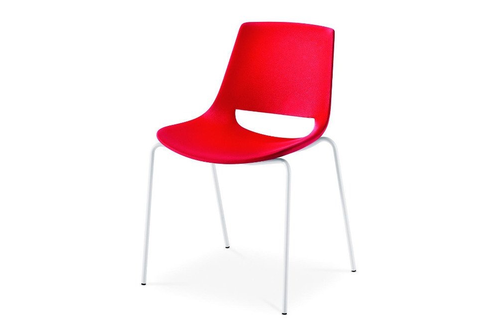 De vierpoot stoel met een zitschaal van polyethyleen is ook geschikt voor buiten en is bovendien stapelbaar.