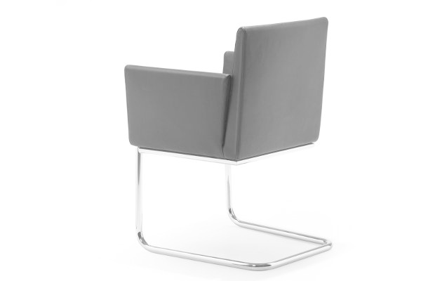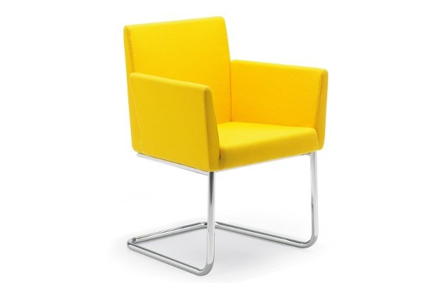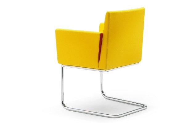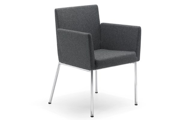 De stoel heeft een slank buisframe en de iets uitstaande armleuningen geven de stoel een open uitstraling.