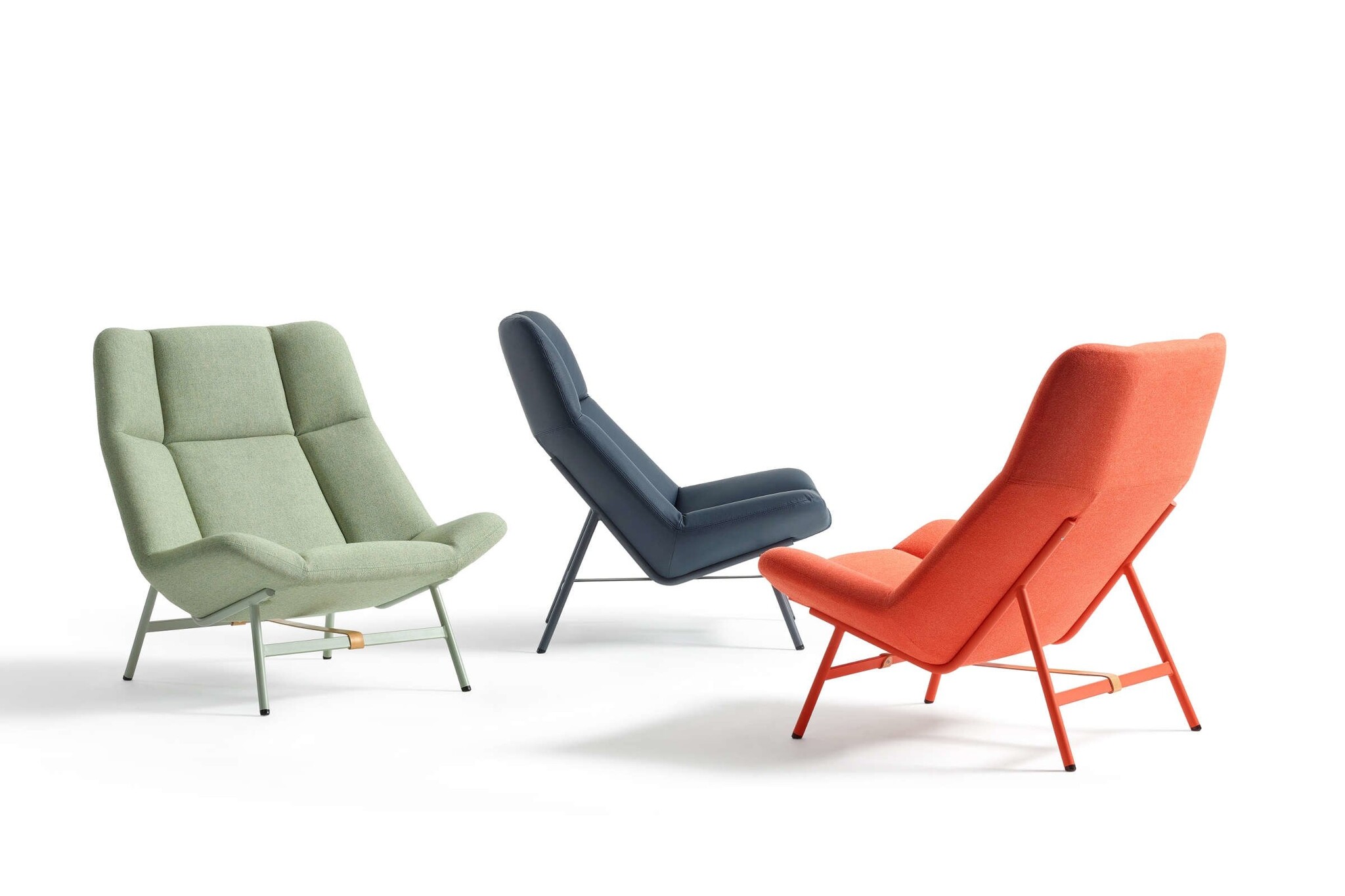 De fauteuil is te stofferen in diverse stof- en leersoorten.