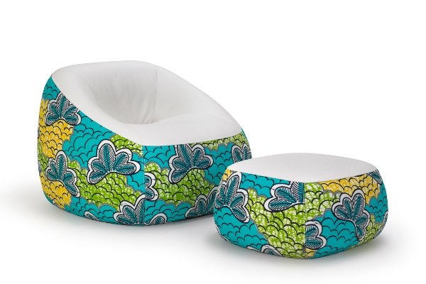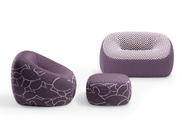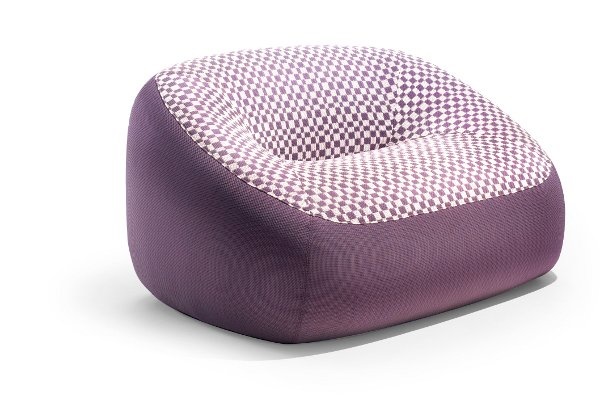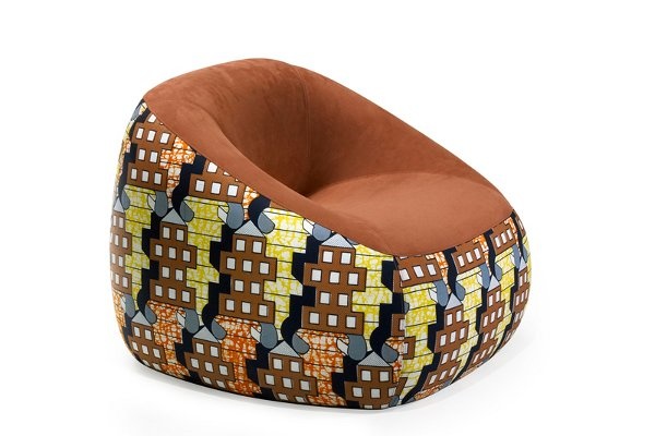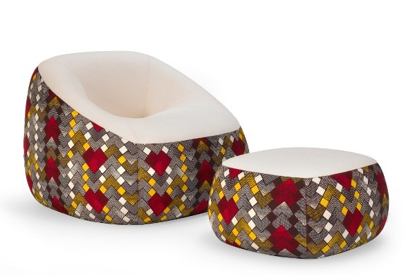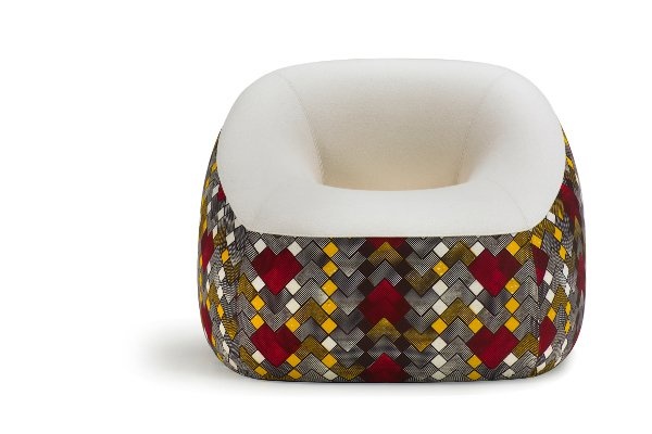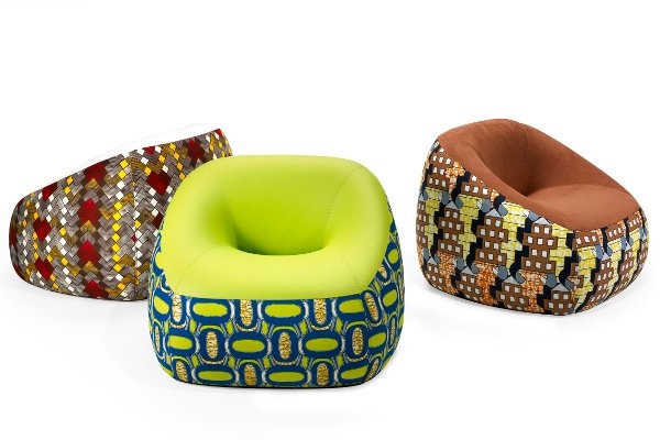 De fauteuil is verkrijgbaar in verschillende veelkleurige stoffen.