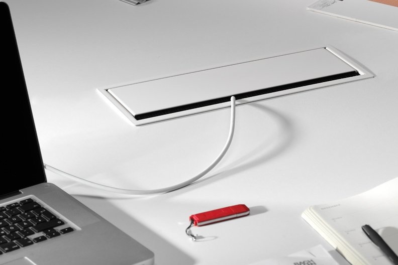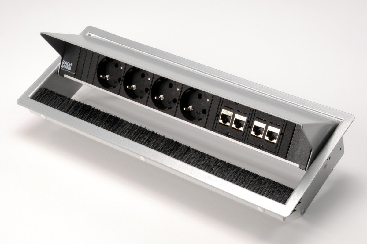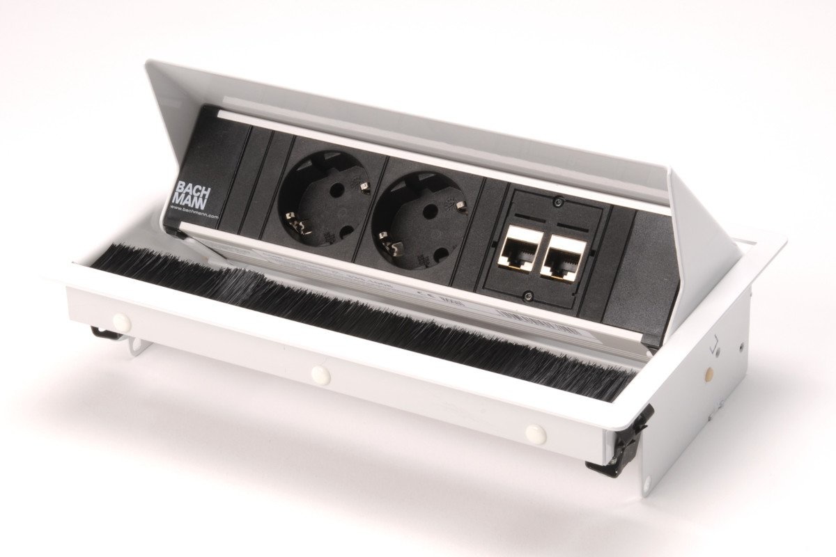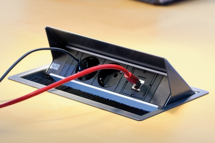 De Bachmann Coni zorgt voor uw kabelmanagement en geeft flexibiliteit rondom de werkplek op bijvoorbeeld bureaus of in een vergaderruimte. De Coni zit geïntegreerd in het tafelblad. Wanneer er stroom nodig is, is de deksel makkelijk open te schuiven.In de stekkerdoos is ook een borstelinzetstuk gemaakt daardoor kan de deksel makkelijk na het aansluiten van de kabels sluiten. De borstels zorgen daarmee ook dat de kabels niet vastlopen.