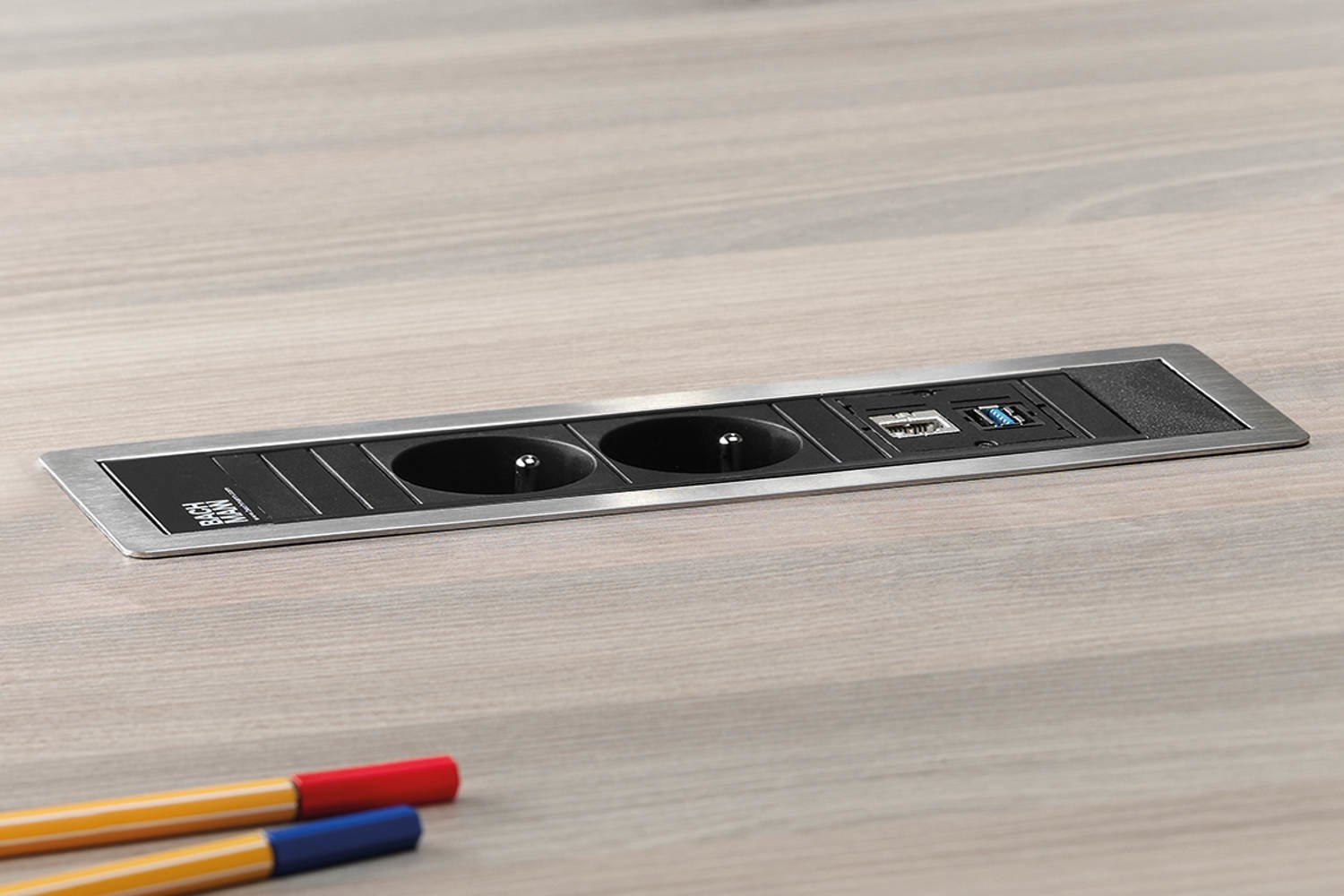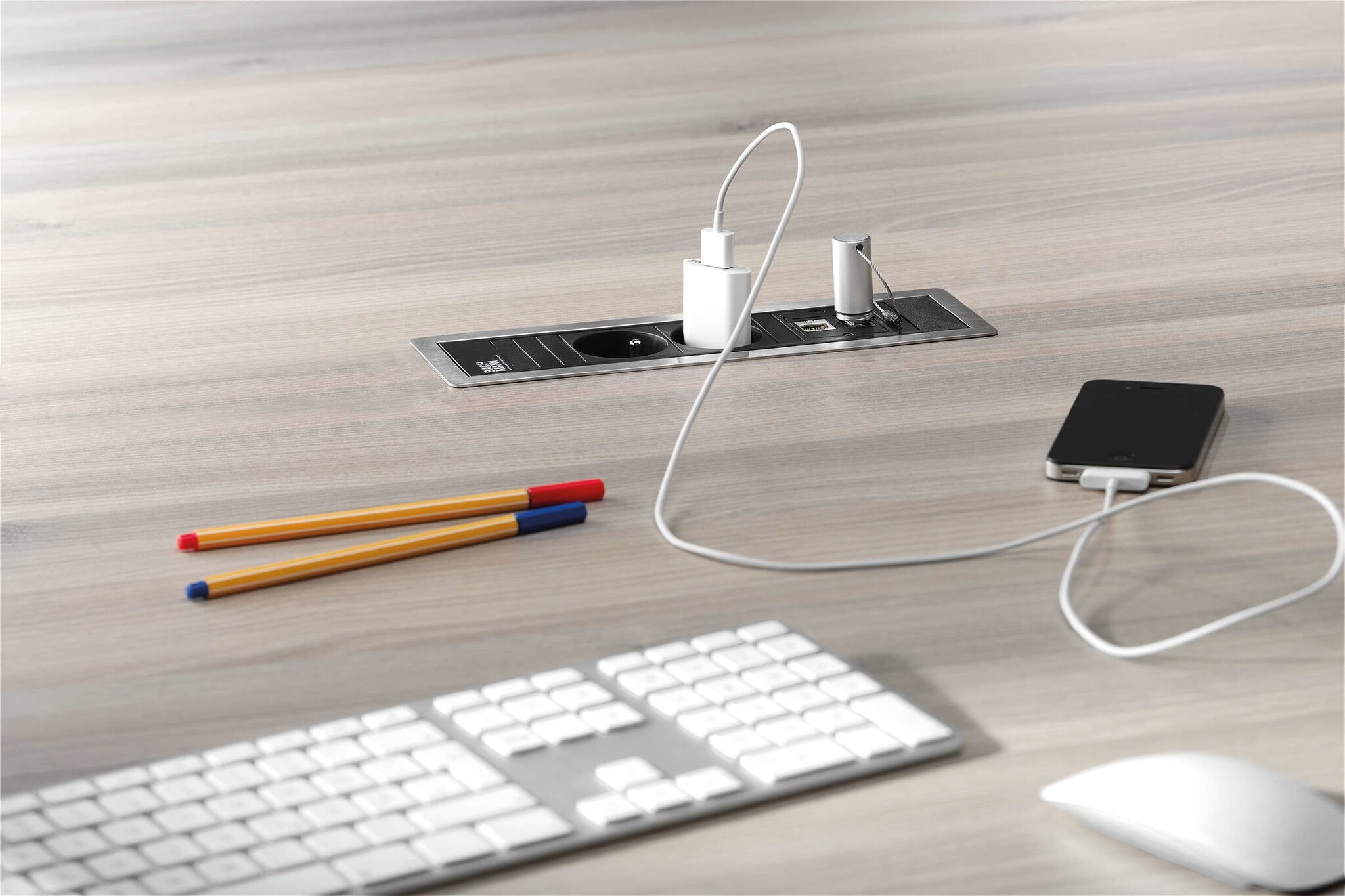 Bachmann kabelmanagement is een compacte oplossing voor energie en data aansluiting bij werkplekken. De Power Frame kan geïnstalleerd worden bij nieuwe werkplekken, maar ook achteraf is deze nog te monteren. Verder is het te leveren met cover. De Bachmann Power Frame is leverbaar in Edelstaal, zwart, silver of wit. Inbouwmaat: 224,5 mm x 60 mm, buitenbouw 241,5 mm x 73 mm. Snelle installatie van complete stekkerdozen. Er is ook een power frame cover leverbaar in aluminium, wit of zwart.