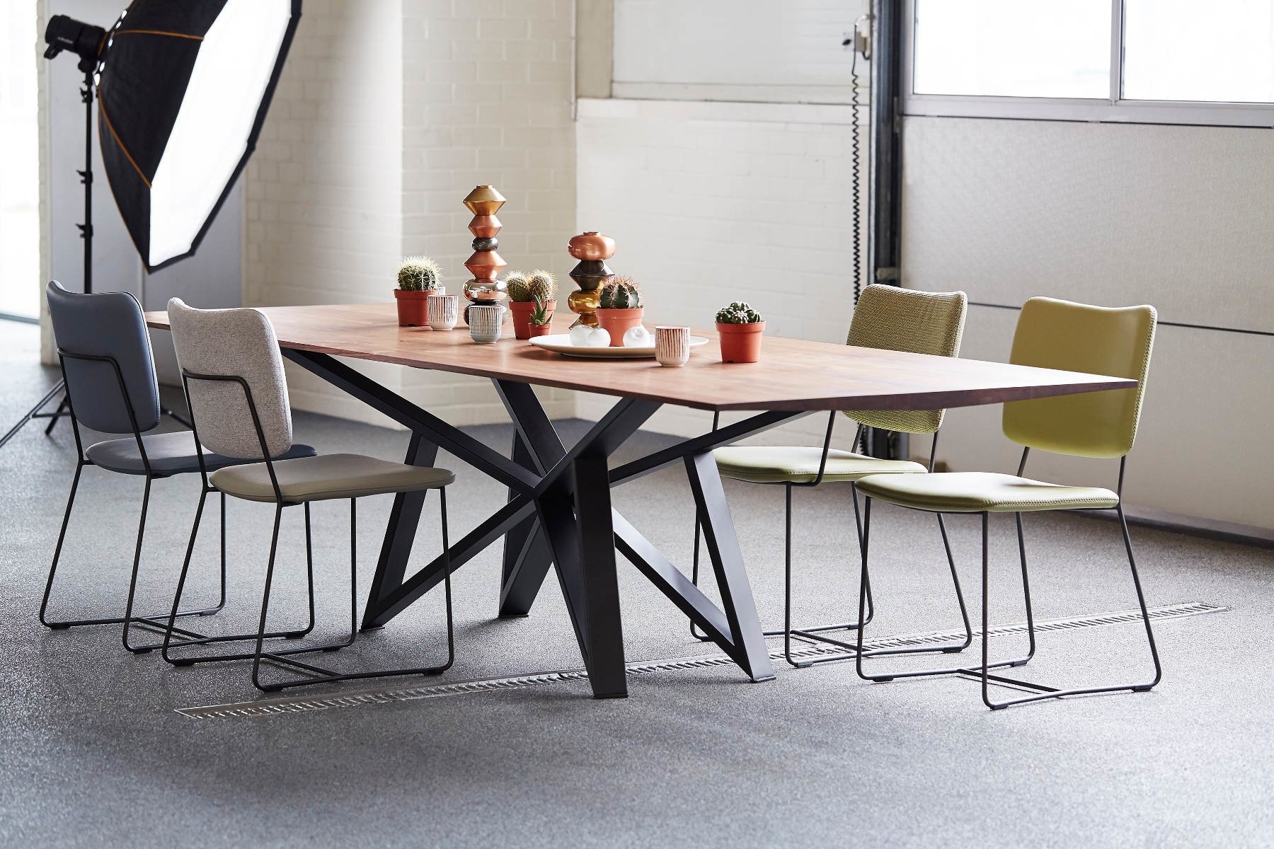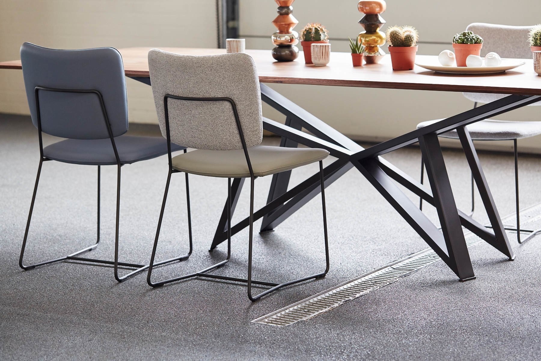 De opvallende pootconstructie is leverbaar in diverse kleuren.