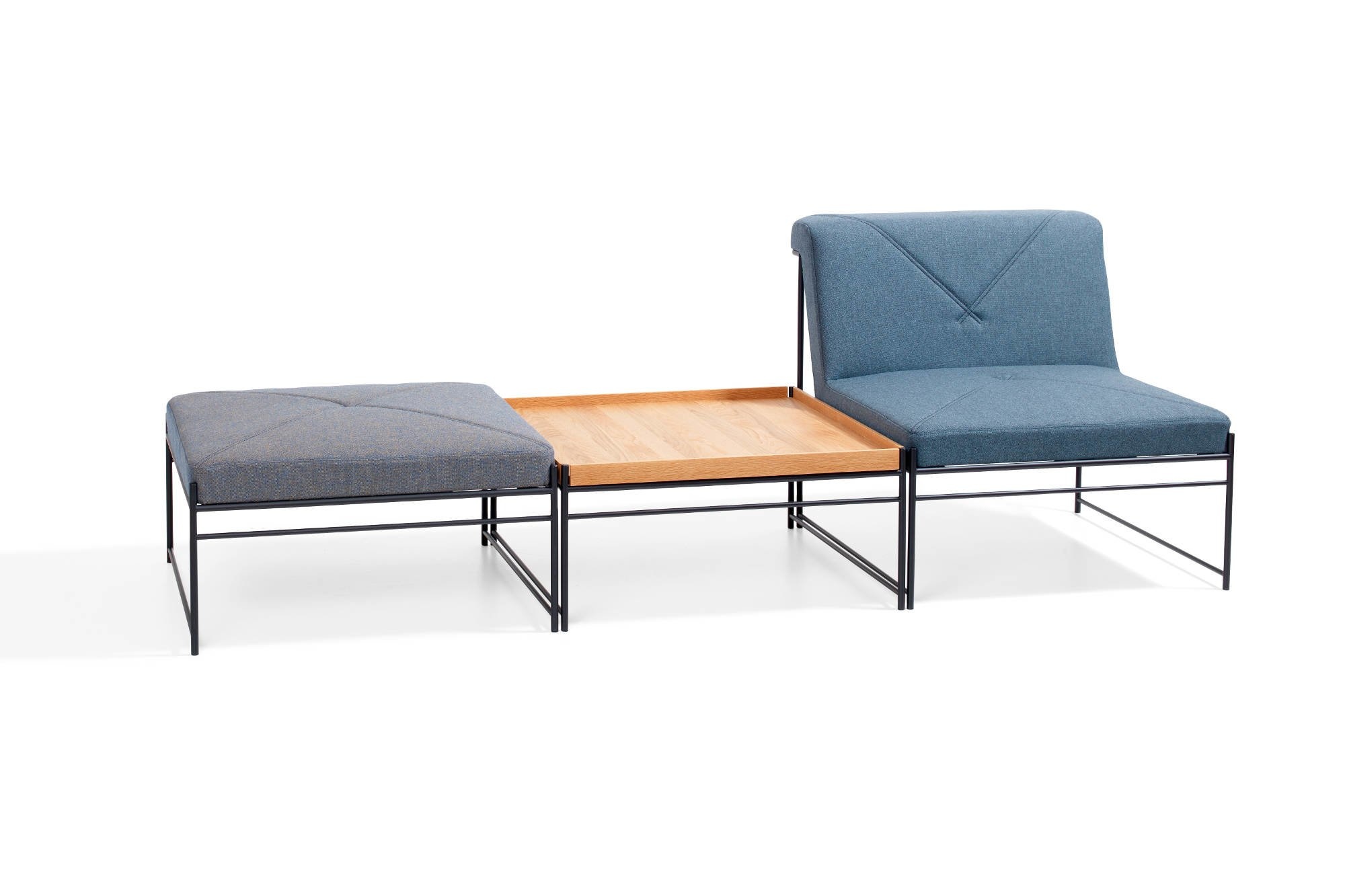 Bla Station Unit koppelbaar modulair zitsysteem en bestaat uit de volgende elementen: een kruk, een fauteuil (samen te vormen als bank) en een tafel. Door een frame in horizontale en verticale lijnen lijkt het alsof het zweeft boven de vloer. Kenmerken Blå Station Unit tafel