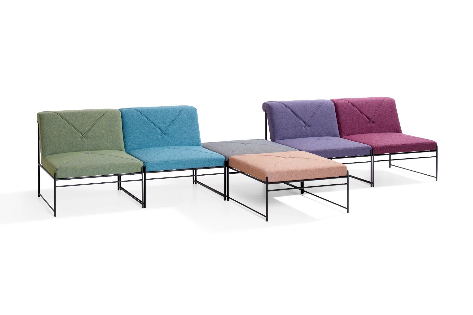 Modulair zitsyteem in combinatie met poefjes en tafels