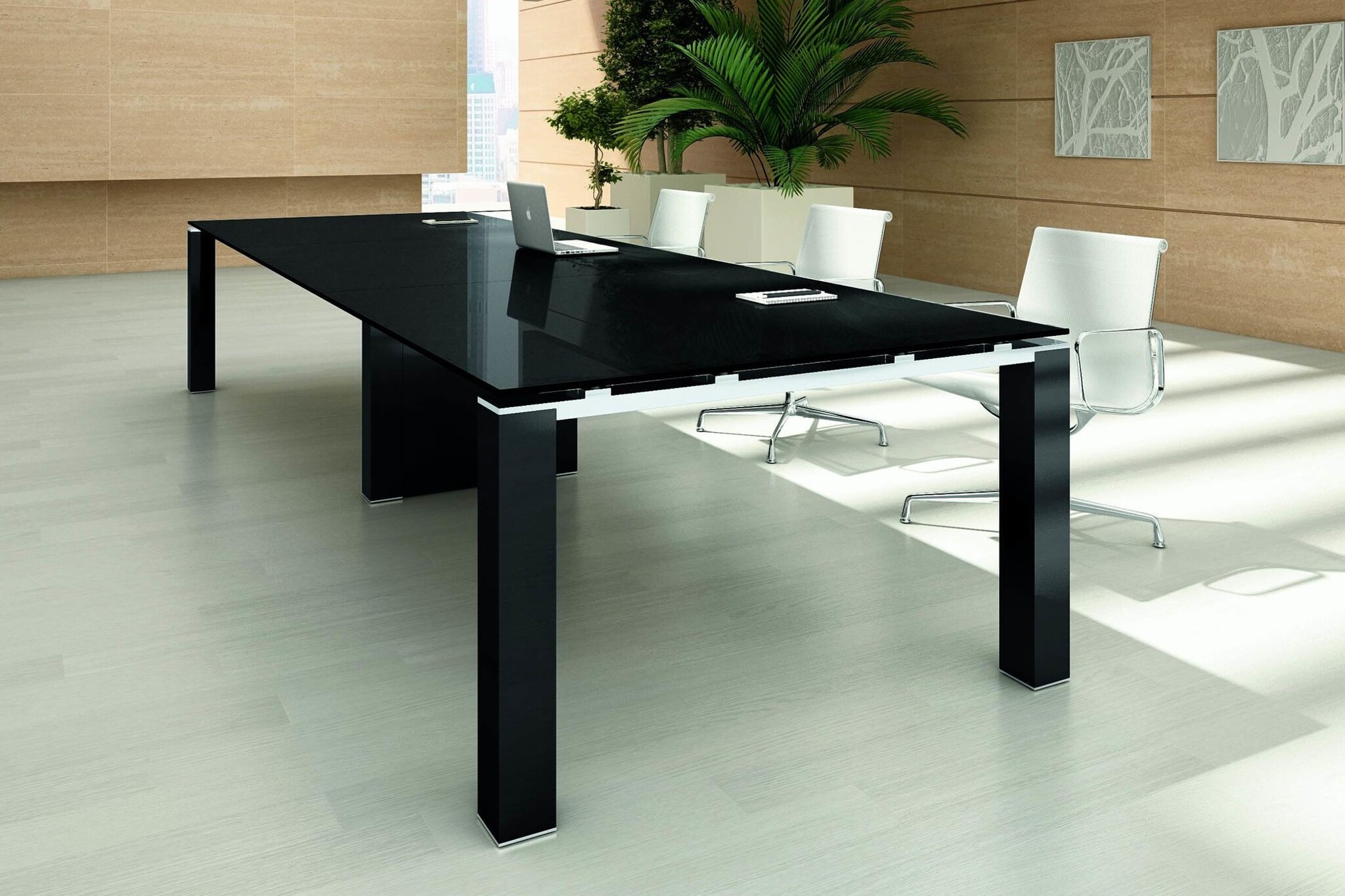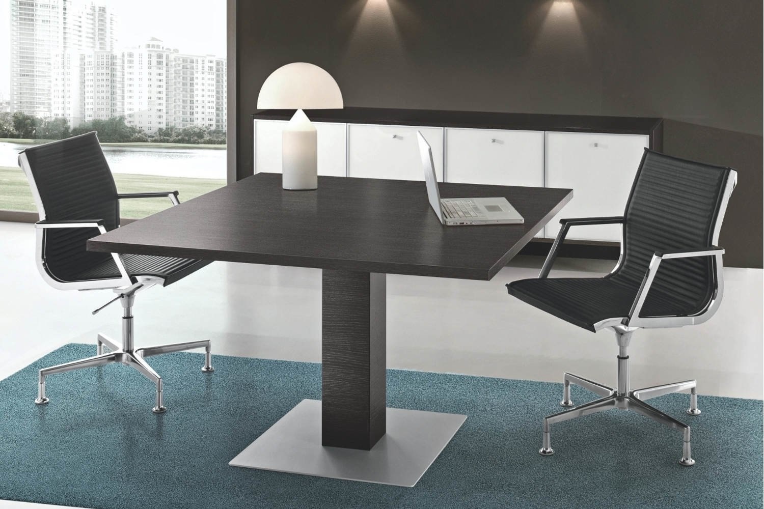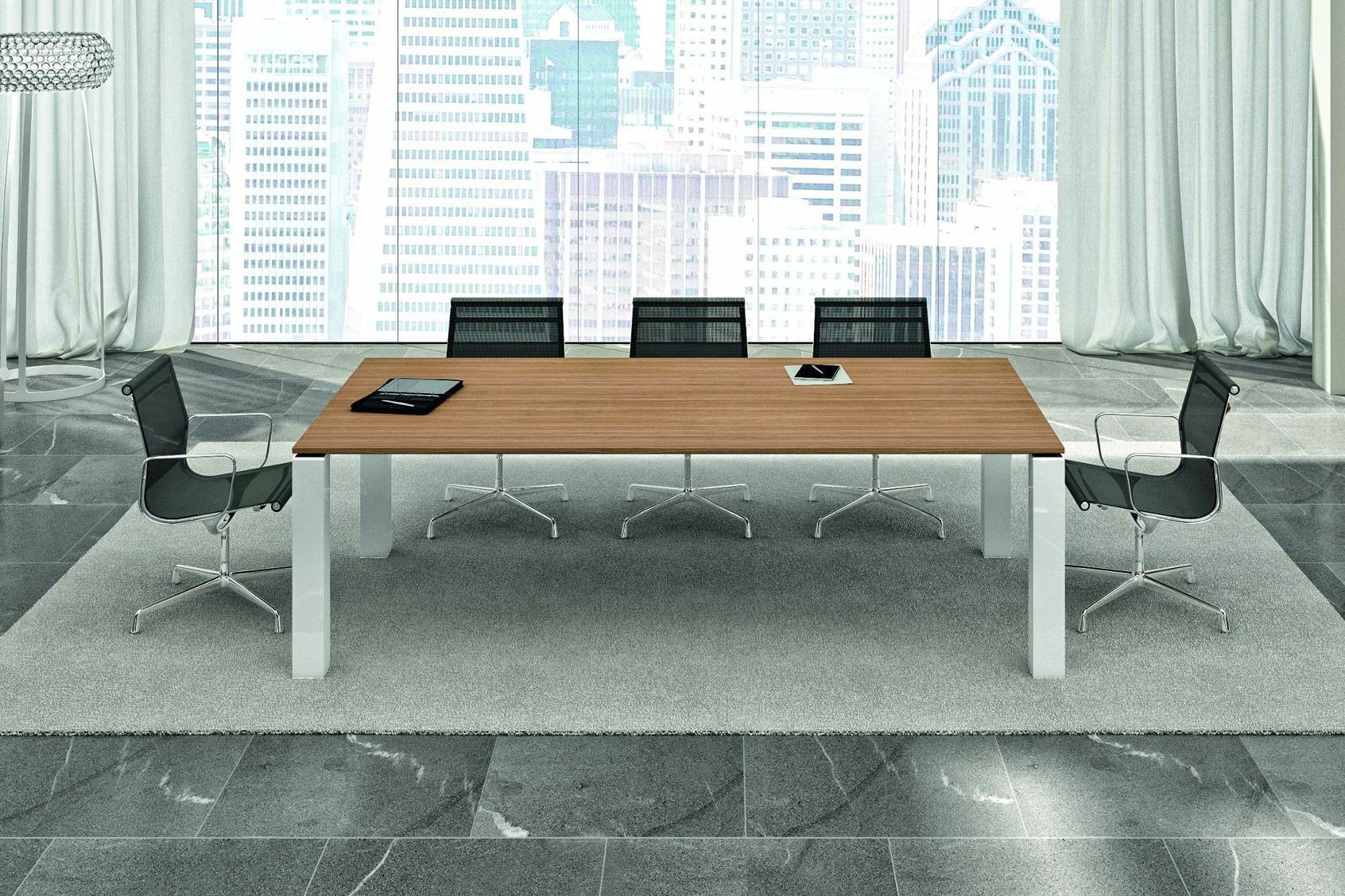 De structuur met portaal is gemaakt met een getrokken stalen buis met een doorsnede van 70 x 30 mm en een dikte van 2 mm waaraan twee poten zijn bevestigd met een vierkante doorsnede van 100 x 100 cm, gemaakt met een buisvormige coating van melamine-hout in de kleuren gecoördineerd met de bladen. De portaalpoten zijn geplaatst in het centrum van de samenstellingen van de vergadertafels, deze zijn gemaakt met ingetrokken poten om het correct gebruik van de werkbladen in hun volledige perimeter te vergemakkelijken. Alle poten hebben nivelleerpootjes van circa 1 cm.