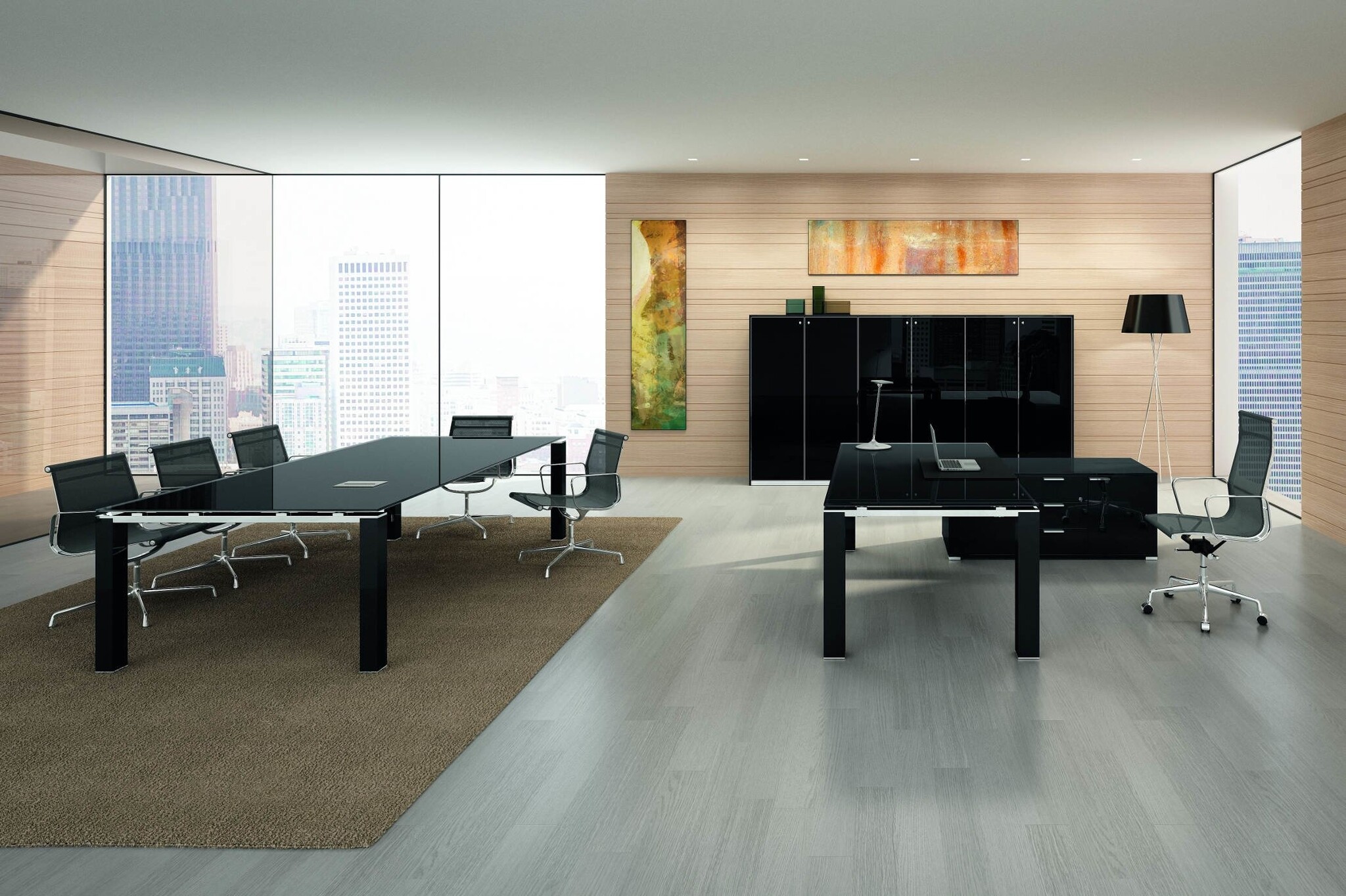 Gemaakt met spaanplaten met een dikte van 18 mm, bekleed met decoratief papier geïmpregneerd met melamine-harsen met massief ABS houten afgeronde randstroken met een dikte van 2 mm en een straal 2 van mm. In de versies vergadering hebben de houten bladen met een diepte van 60 of 80 cm, deze zijn gemonteerd op de portaalpoten van 124 cm of 164 cm aan de binnenkant een borstel-profiel om het buitenkomen van de elektrische kabels rechtstreeks op het werkblad mogelijk te maken. In de werkbladen kunnen, na het boren van een gat, toebehoren worden ingevoerd die nuttig zijn voor de doorgang van de elektrische kabels, zoals de eenvoudige stop in ABS met een diameter van 80 mm, het verzonken aftakkingstorentje of de stekkerdoos voorzien van een deksel en een kabelgoot. De bladen zijn bevestigd aan de nylon clips, geplaatst langs de telescopische balken van de structuur middels zelftappende schroeven en aan de metalen bussen geplaatst onder het blad. De hulpstukken zijn vastgehaakt aan de portaalpoten middels speciaal daartoe bestemde verankeringsbeugels geverfd met epoxypoeders kleur aluminium. De melamine bladen hebben een densiteit van 620 kg/m3, klasse E1 met lage uitstoten van formaldehyde volgens de normen ISO. De bladen hebben een reactie op brand van klasse 2.