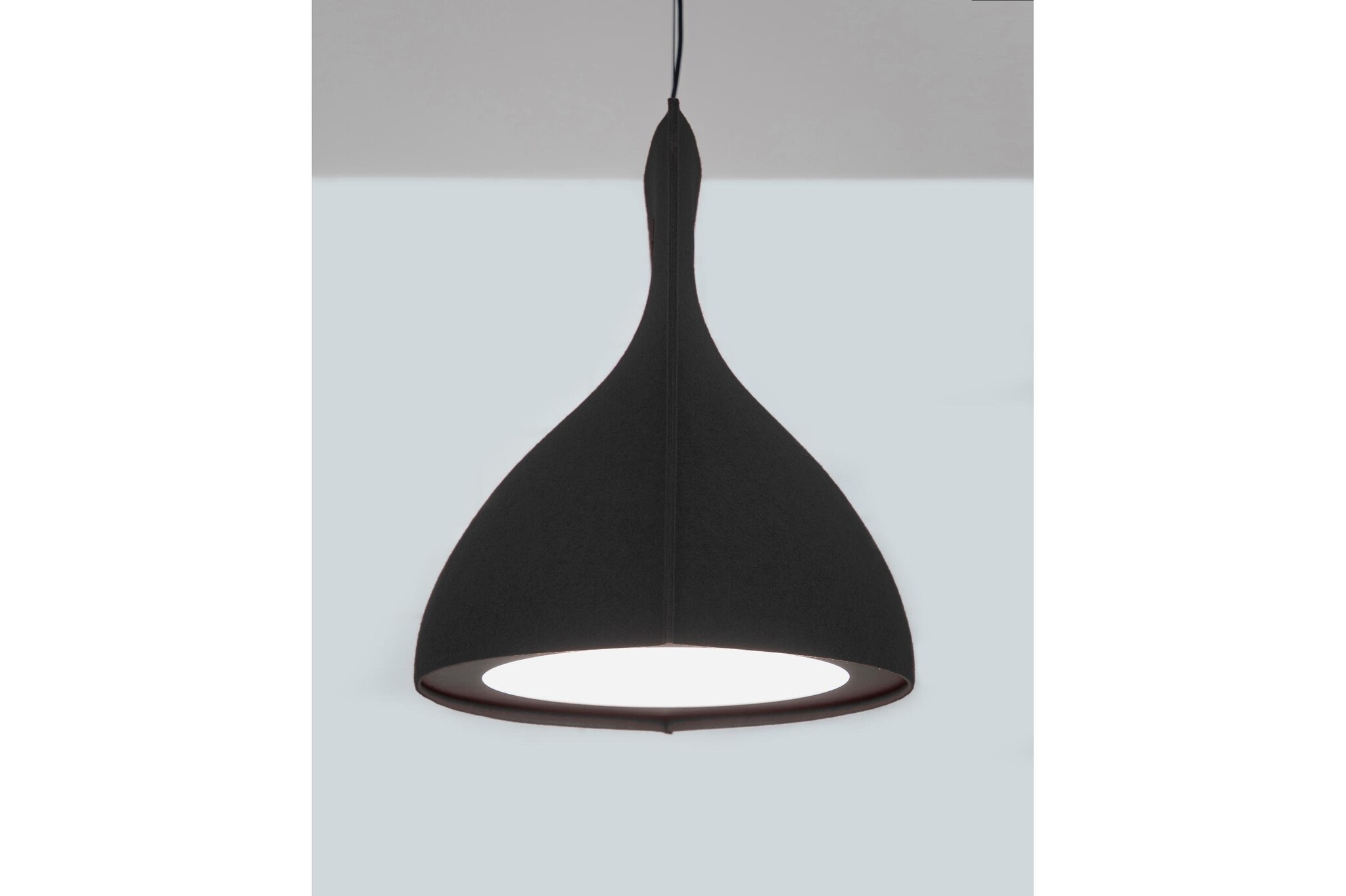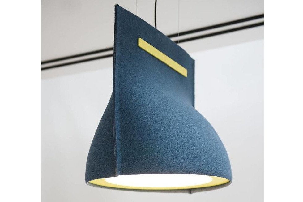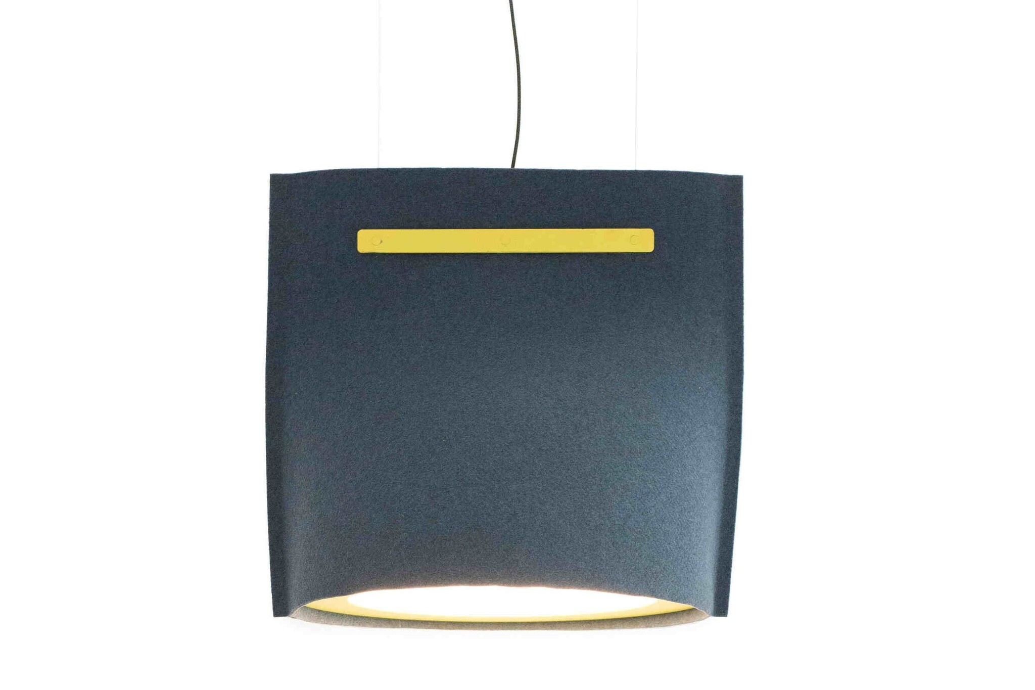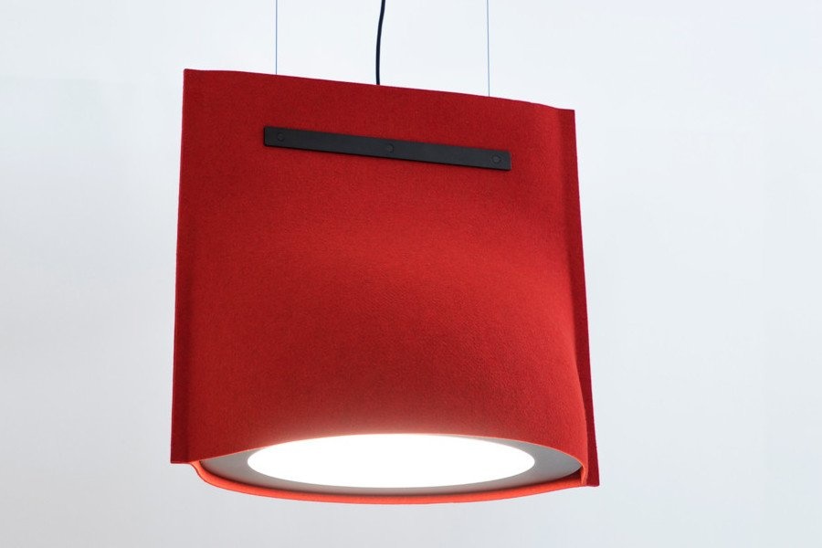 De buitenkant van de hanglamp is gestoffeerd in BuzziFelt (akoestisch materiaal) in 12 kleuren.