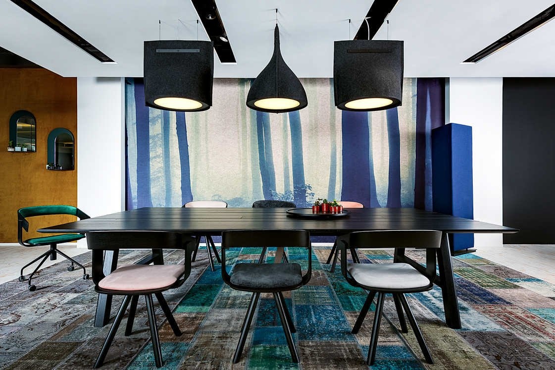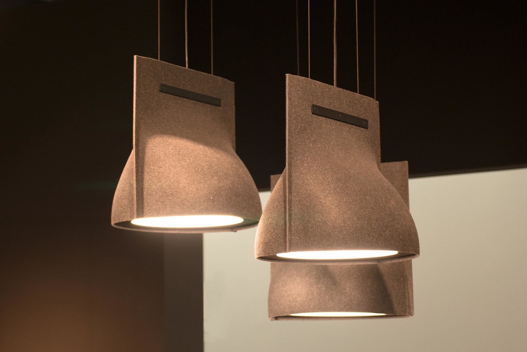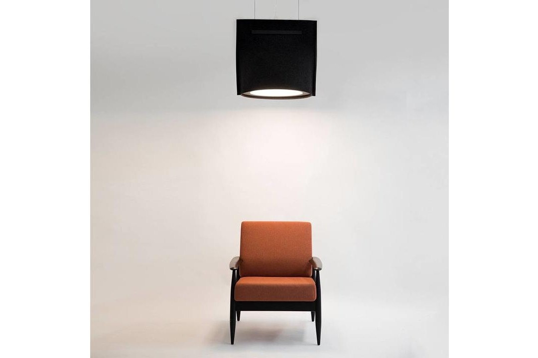 De buitenkant van de hanglamp is gestoffeerd in BuzziFelt (akoestisch materiaal) in 12 kleuren.