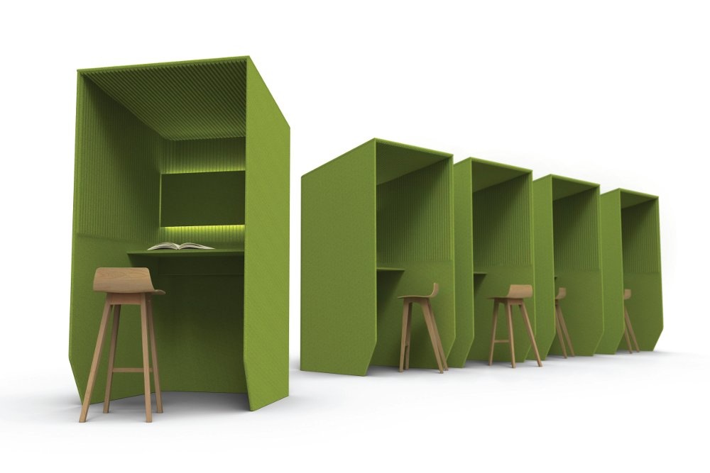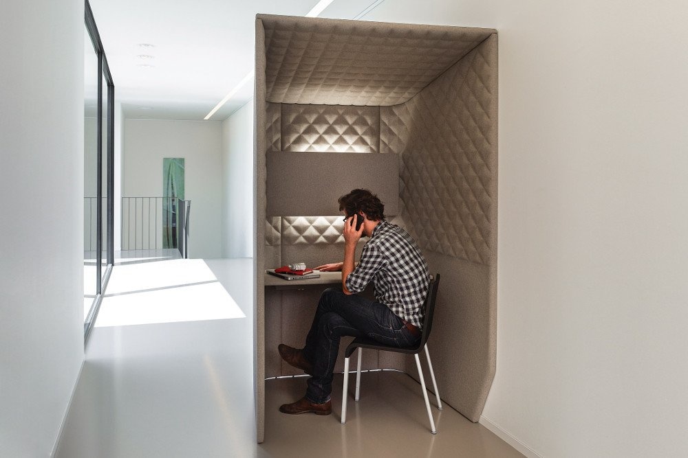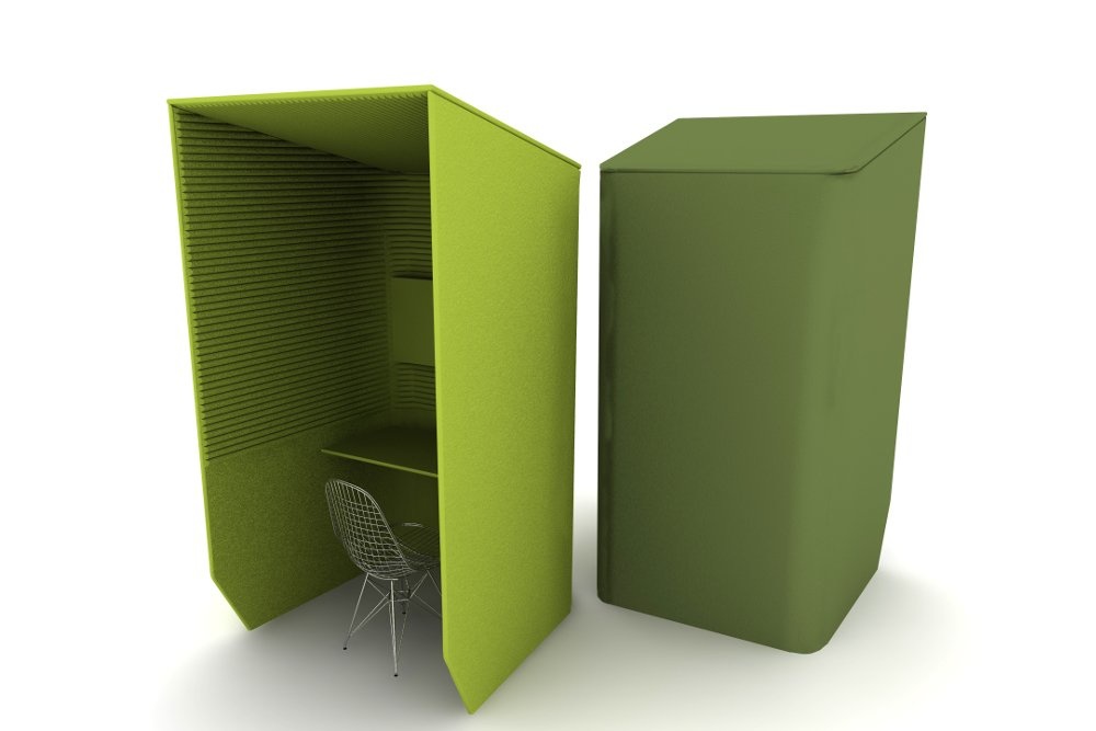 Deze akoestische telefoonstation is ontworpen met zachte randen en ronde vormen. Hiermee wordt geluid geleid en zorgt het ervoor dat de geluid zich beter verspreiden. Daarnaast zorgen de panelen die aan zijkant en boven geplaats zijn ervoor dat geluid de cabine niet kan verlaten. De telefooncel is voorzien van akoestische schuim, bekleed met stof welke tevens ook geluidsgolven opneemt.