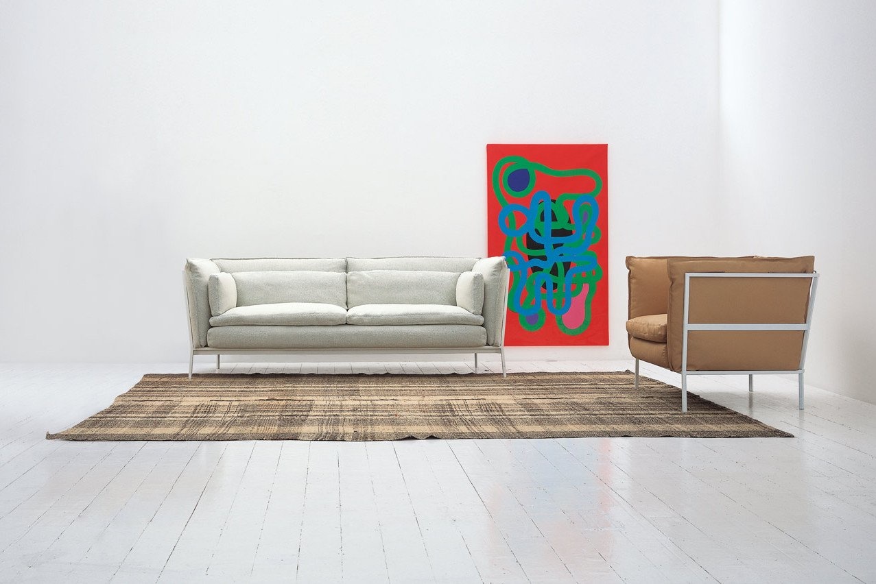 Cappellini Basket, een mooie zitcollectie bestaande uit een tweezitsbank, een driezitsbank en een grote fauteuil. De metalen basis die gezien wordt, is geschilderd in mat wat, rood, grijs of zwart. Ook de kussens zijn verkrijgbaar in verschillende kleuren stof en leder uit de collectie. De afneembare hoes is los verkrijgbaar en daarom kunt u gemakkelijk verschillenden kleuren en stoffen combineren.
