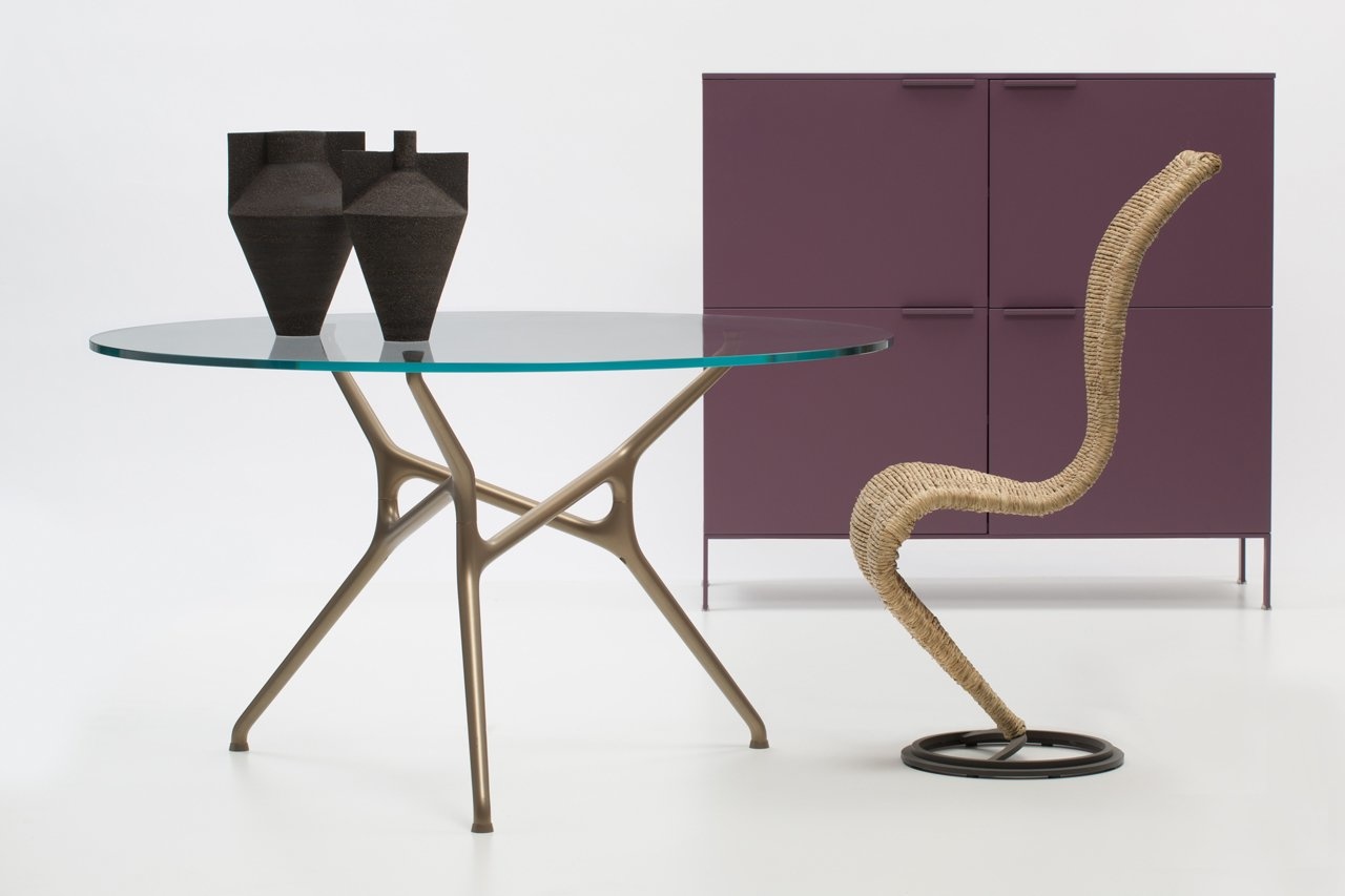 Cappellini Branch Table, een unieke samenstelling van identieke alluminium elementen. De elementen zijn onderling verbonden zonder voegen, en vormen dus een continue beweging. De tafel is lichtgewicht geproduceerd. De branch is gemakkelijk te monteren en neemt weinig ruimte in wat transport of berging betreft. Verkrijgbaar met een glazen topblad, een MDF wit, antreciet of modder gelakt topblad of een natuurlijk houten blad.