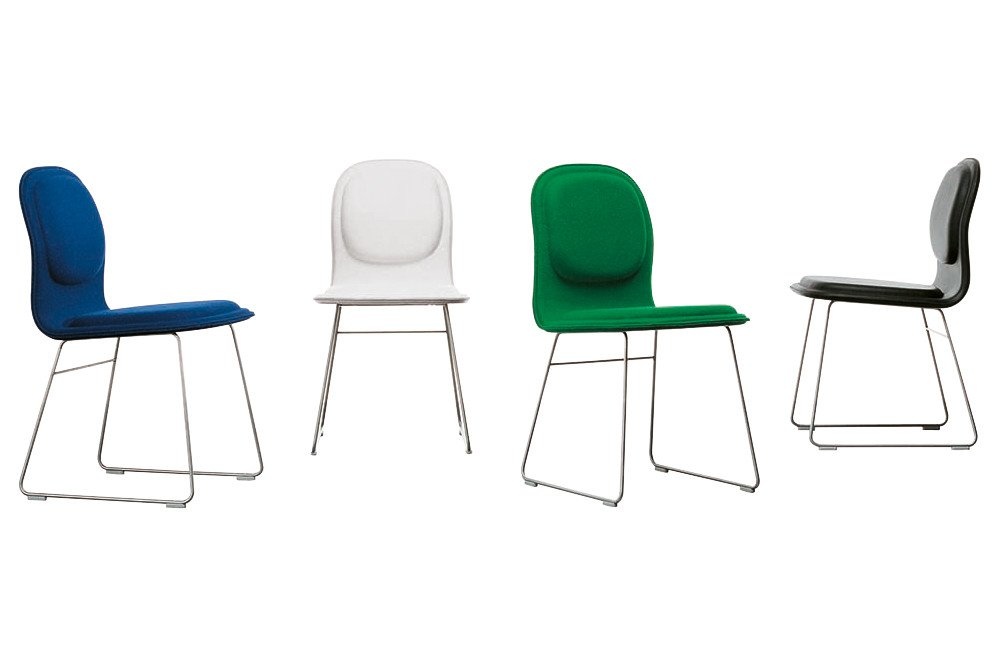 Stoel met beuken multiplex en berken, opgevuld met polyurethaanschuim. Vaste hoes in stof en leder uit de collectie. Basis van geborsteld roestvrij staal, polypropyleen voeten.