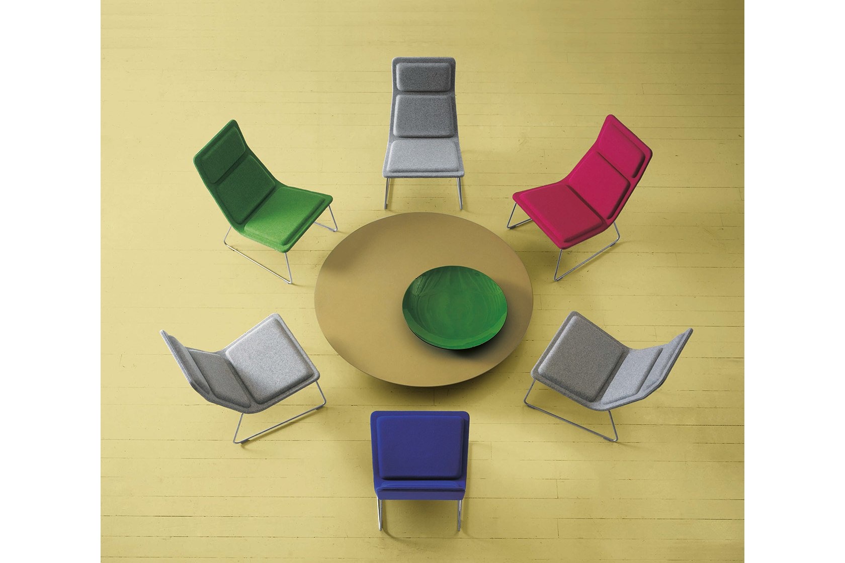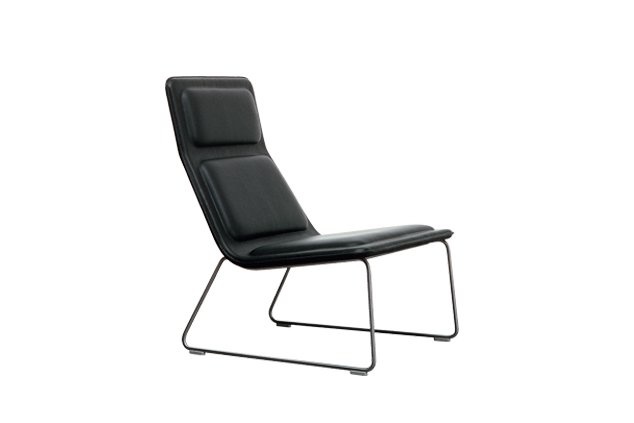 Cappellini Low Pad, een stoel gemaakt van gebogen multiplex en plyurethaanschuim van verschillende dichtheden. Om de stoel zit een hoes, welke gemaakt is van stof of leder. De poten van de Low Pad zijn gemaakt van geborsteld roestvrij staal, en hebben rubberen voetjes.