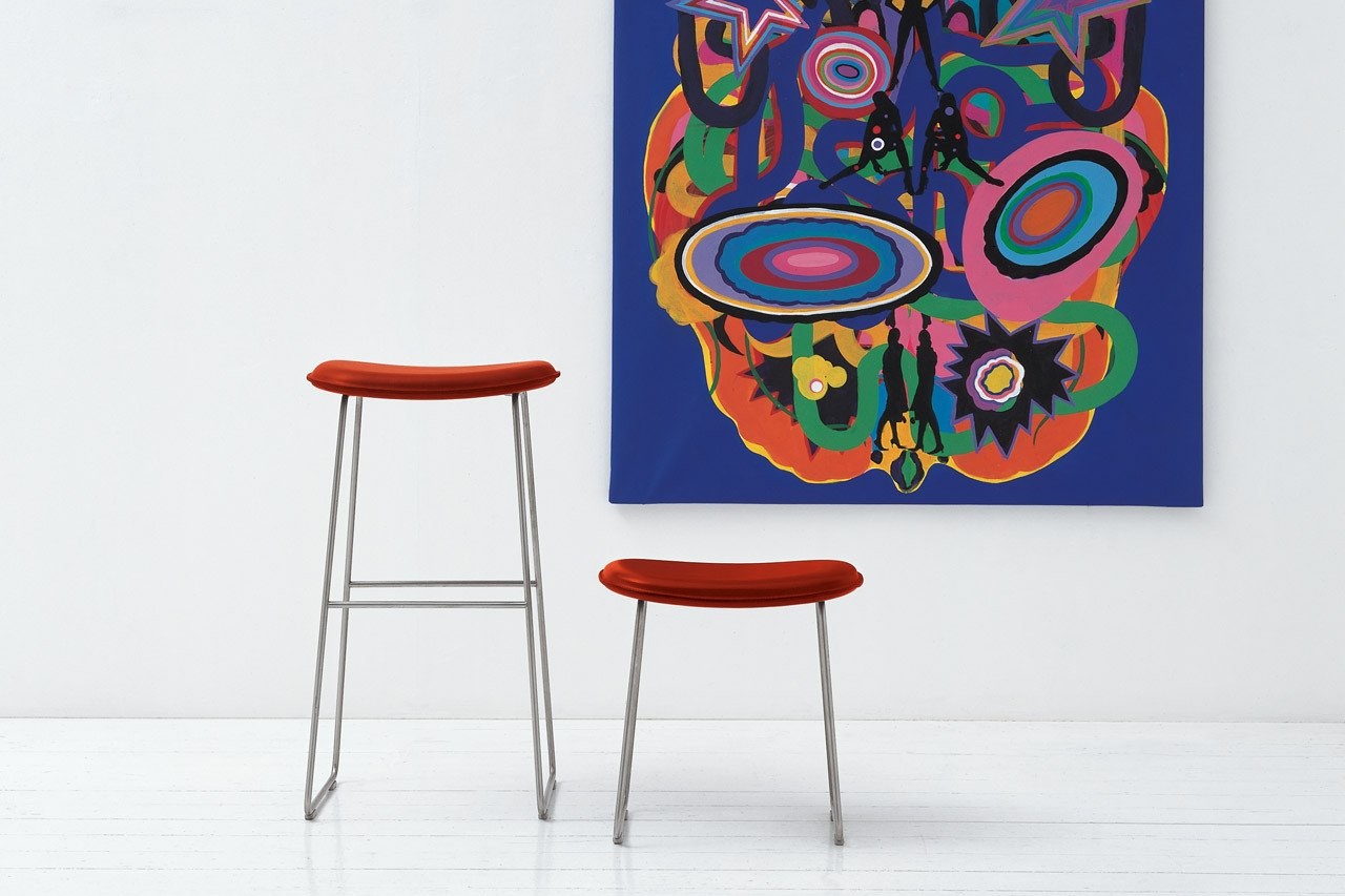Cappellini Morrison, een collectie krukken in drie verschillende hoogtes. De zetes is gemaakt van gebleekt essen, walnoot of wengé. Ook kan er gekozen worden voor een bekleding met polyurethaanschuim met vaste hoes van stof of leder uit de collectie. De basis is gemaakt van geborsteld roesvrij staal en de kruk bevat polypropyleen voeten.