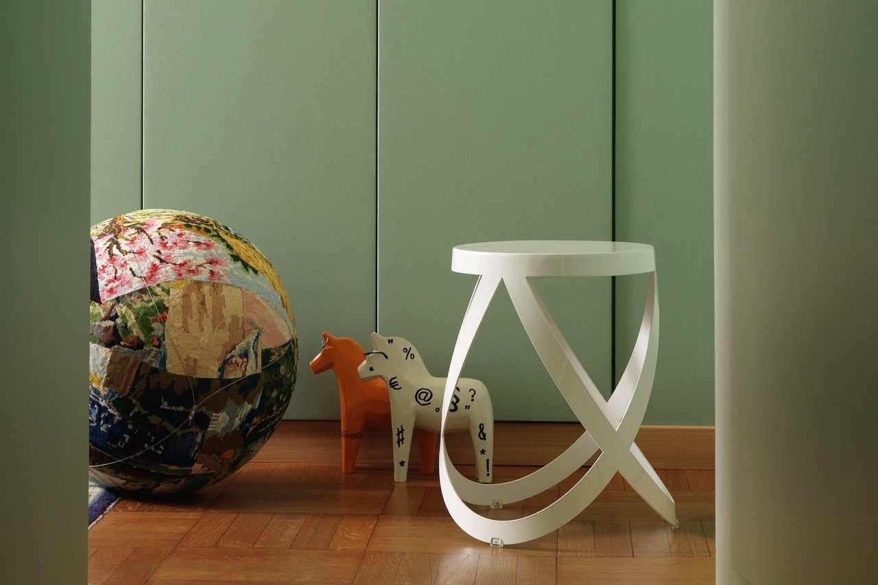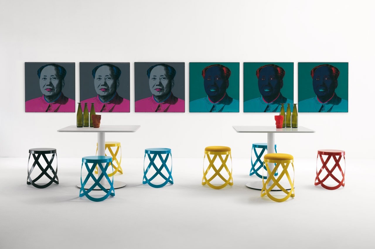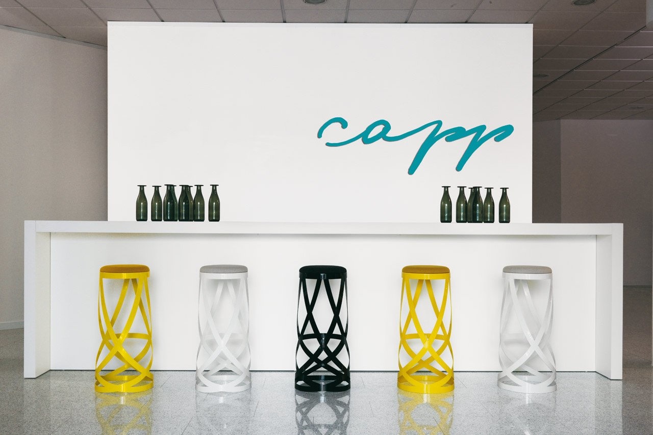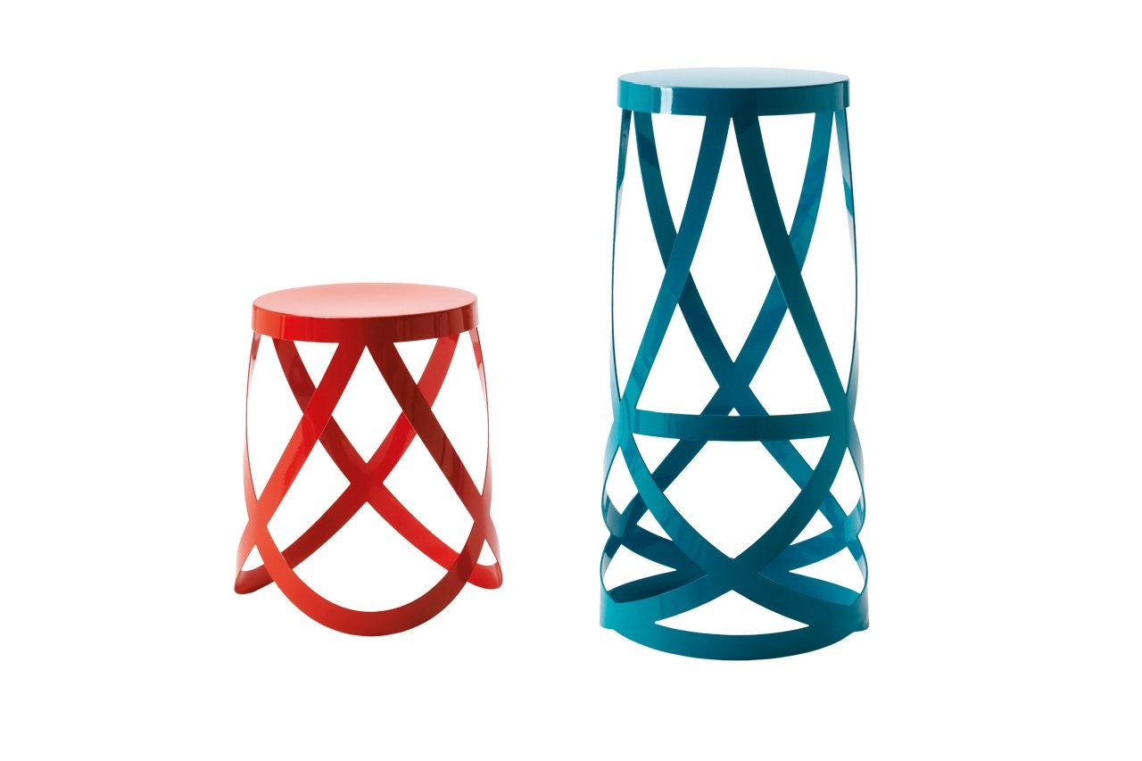 Cappellini Ribbon, een serie van hoge en lage krukken die gemaakt zijn van gesneden en gevouwen plaatwerk. De krukken zijn verkrijgbaar in mat gelakt wit, zwart, rood, geel en blauw. Extra beschikbaar is een magnetisch kussen voor op de zitting van de Cappellini Ribbon kruk. Dit kussen is beschikbaar in de selectie stoffen en leder uit de collectie van Cappellini.