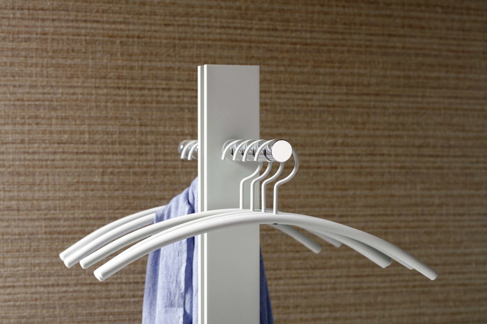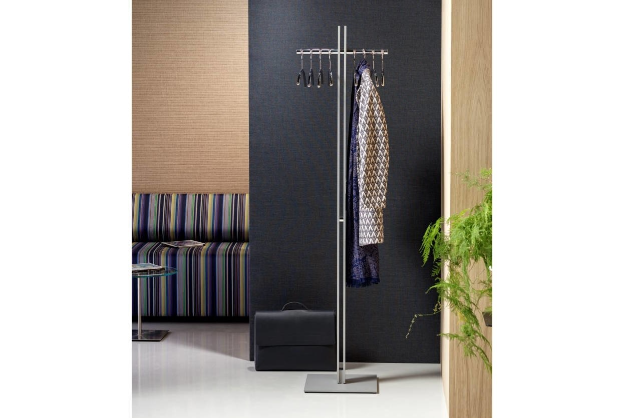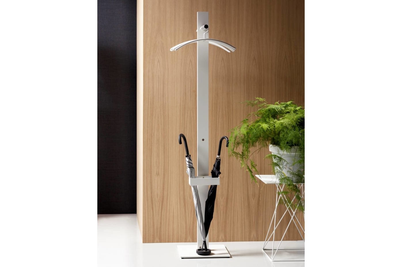 Cascando Standfree een representatieve kapstok met gepolijste aluminium accenten. De garderobestang is voorzien van rillen. Hierdoor hangen jassen altijd op een gepaste afstand van elkaar. Naast aluminiumgrijs is de Standfree nu ook leverbaar in het wit en antraciet. Het standfree-programma groeit. Er is een nieuwe uitvoering voorzien van geïntegreerde paraplustandaard met magnetische druppelschaal. Daarnaast zijn er ook garderobestandaard en brochurestandaard gecombineerd in een uniek product.