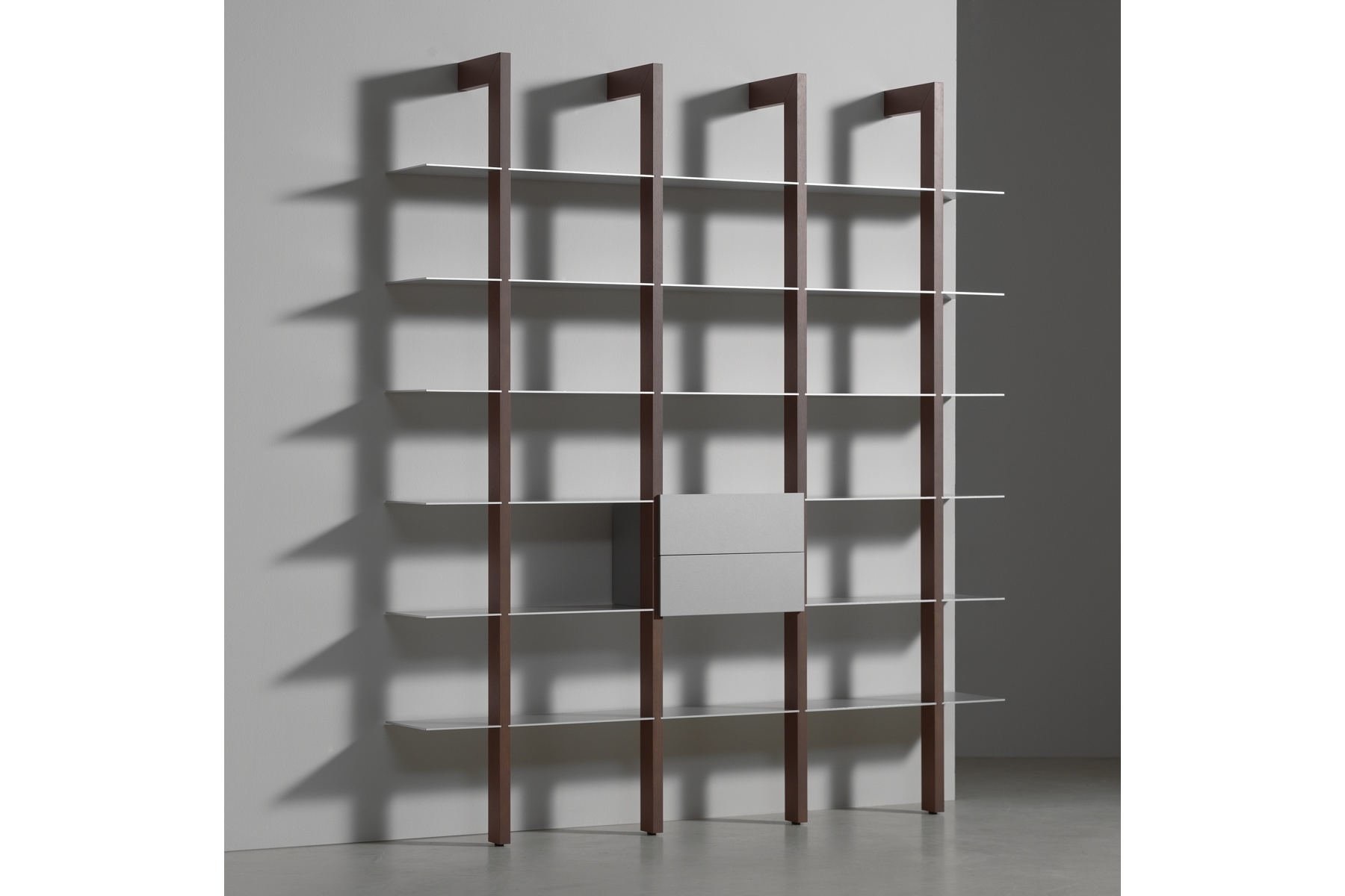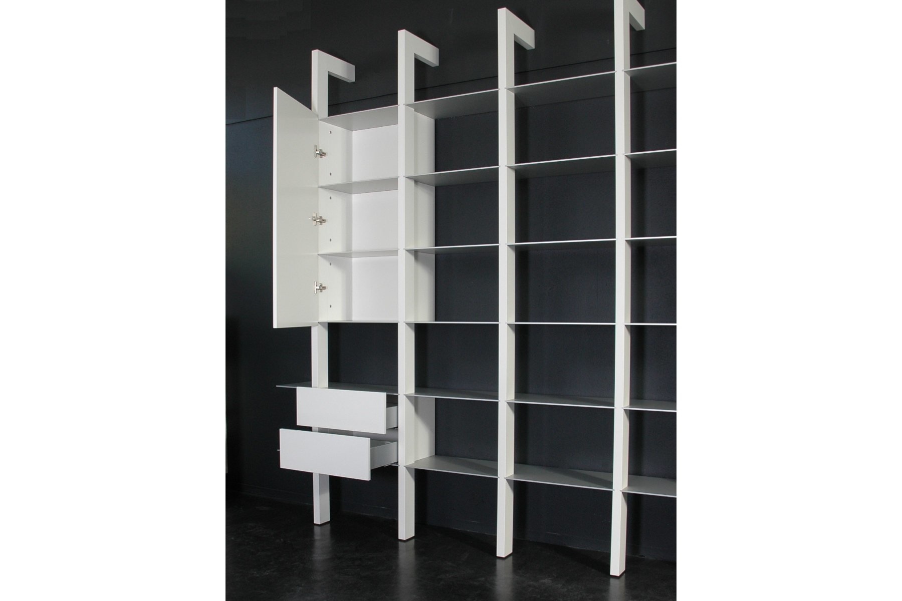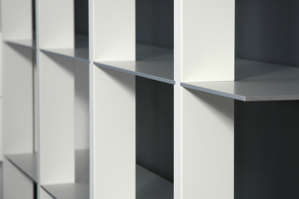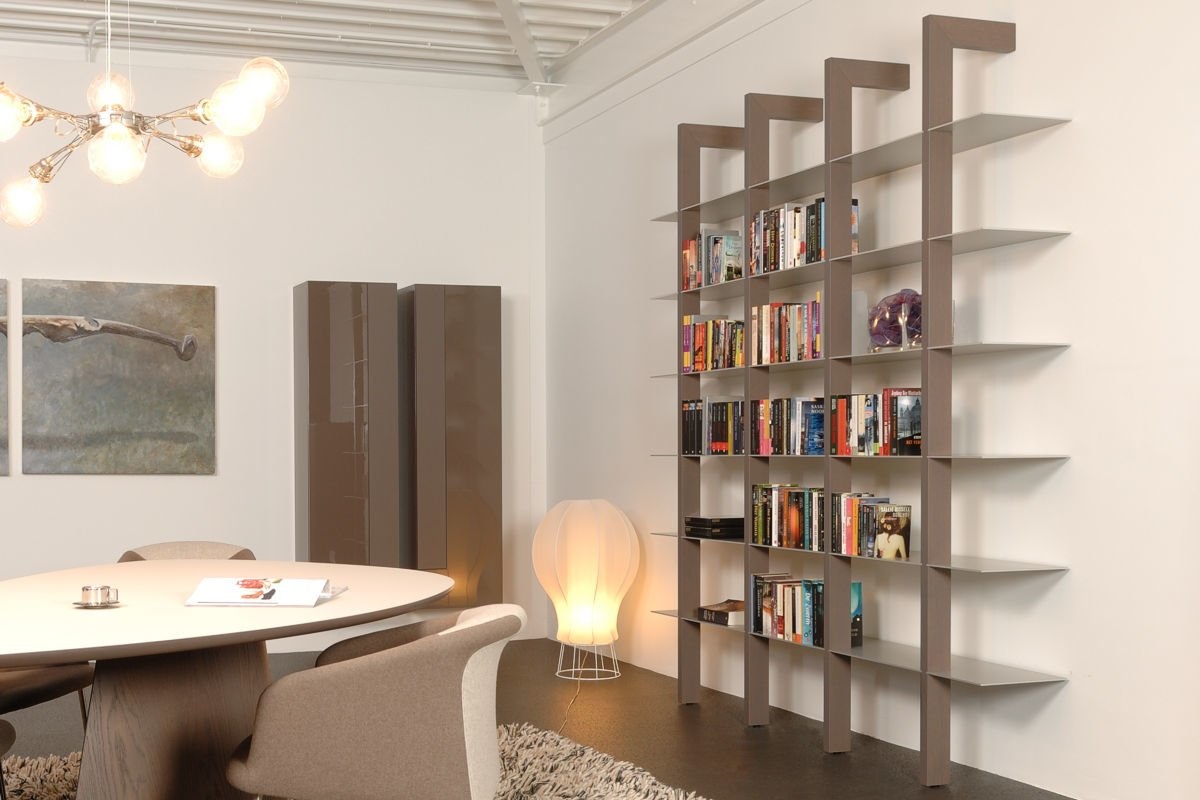 De staanders van Castelijn Groove-XS worden aan de wand bevestigd en zijn in de hoogte van 180, 216 en 251 cm leverbaar in zowel hout als lak. De aluminium boekenplanken bepalen de breedte, die varieert van 108, 161, 215 tot 269 cm. Naar wens kan een deel van de openheid getemperd worden met ladesets en/of deuren.