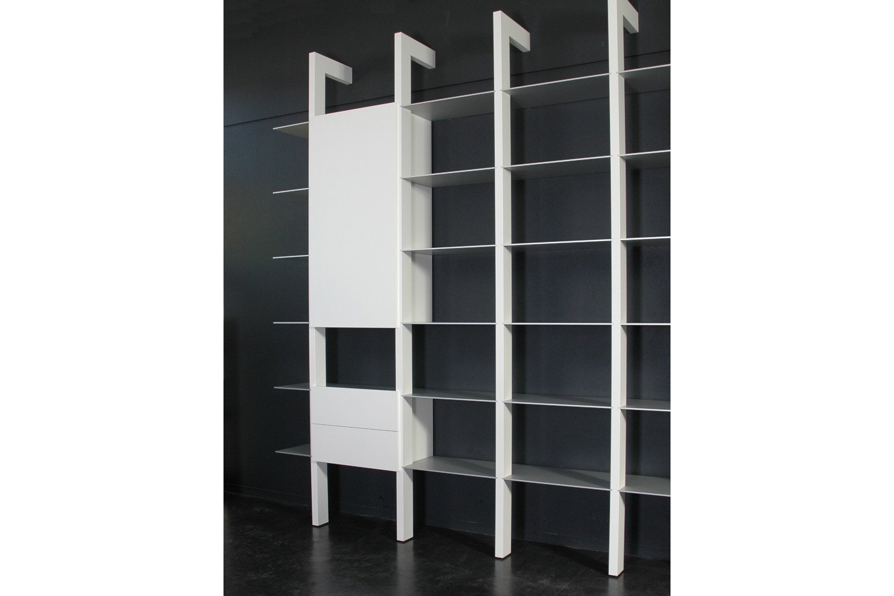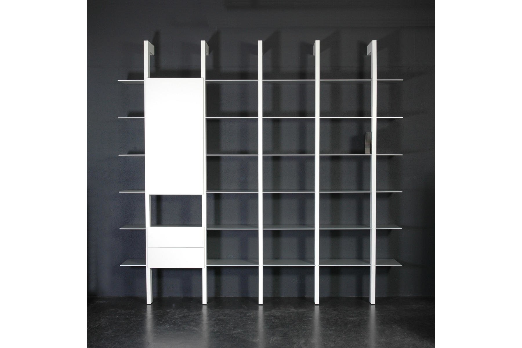 Castelijn Groove XS een design waarmee de ontwerper de uitdaging met de zwaartekracht aan ging. Ranke staanders tot 251 cm hoog met ingeschoven aluminium boekenplanken tot wel 269 cm lang en slechts 6 mm dik! Het resultaat is een aan Groove gerelateerde boekenkast met een zo open en luchtig karakter, dat enkel de staanders het krachtige stramien lijken te vormen.