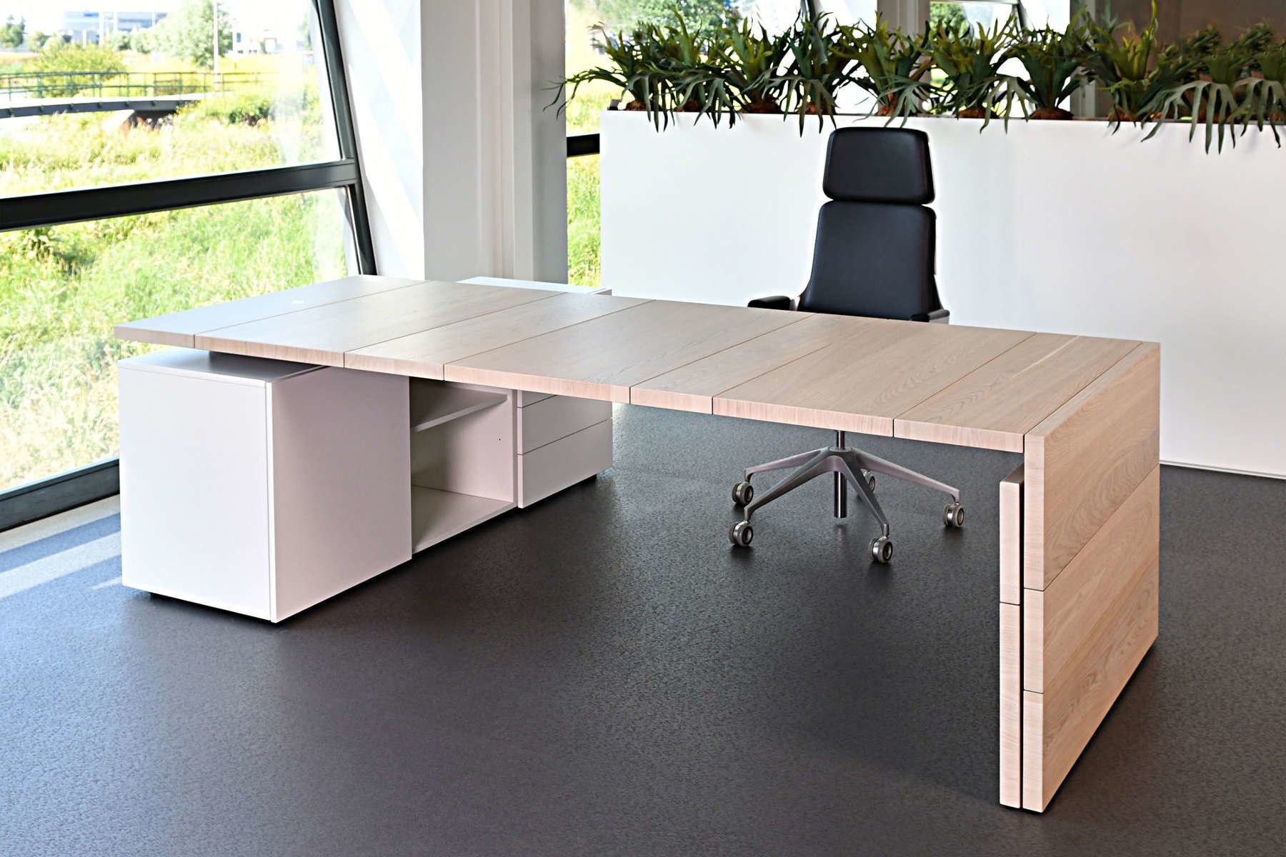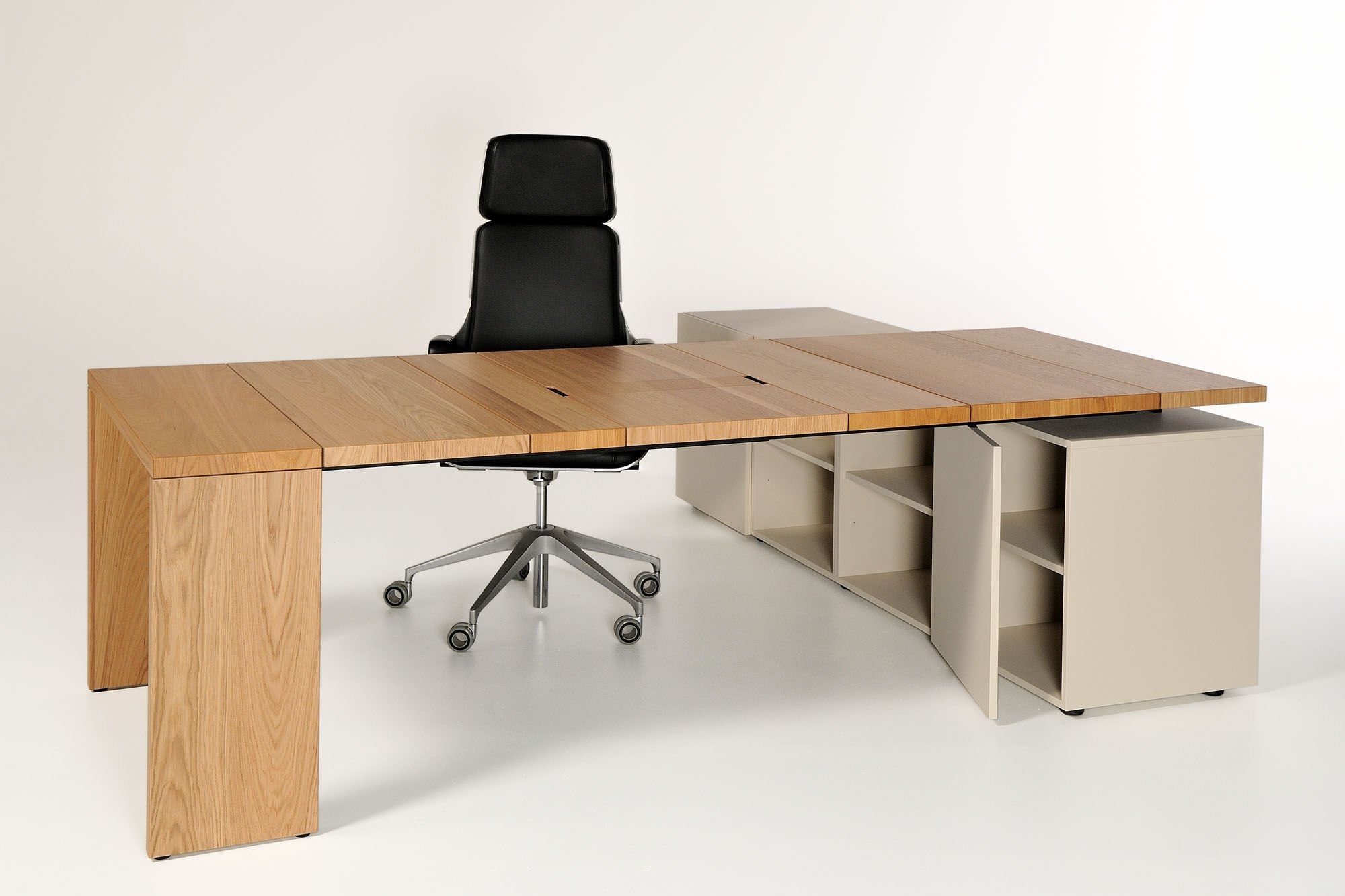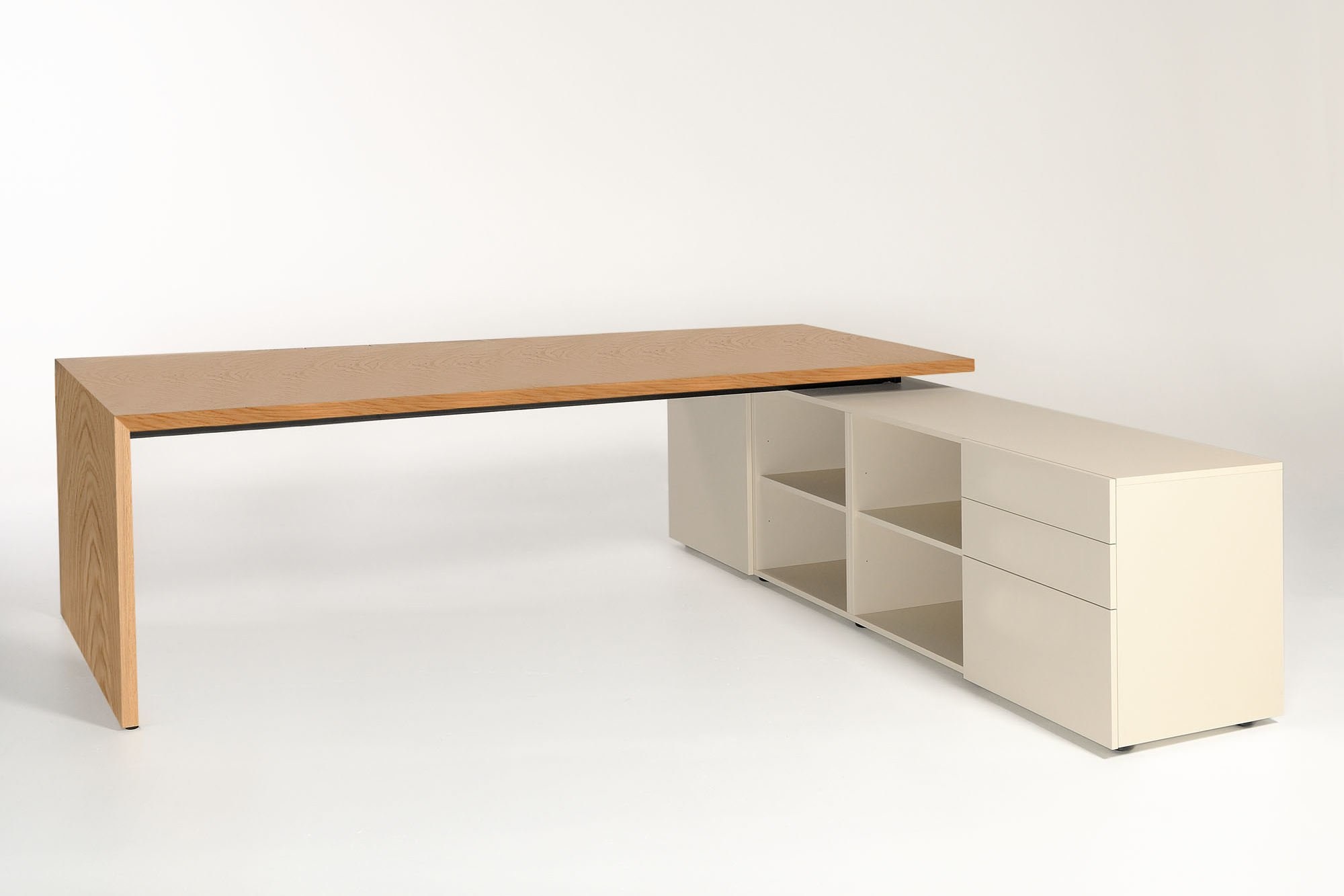 De Castelijn LV bureau kunt u met aparte bladstroken van 20, 30, 40 en 50 cm breed zelf samenvoegen. Zo beslist u niet alleen de lengte, maar ook de vorm van de naden in het blad: effen in stramien of juist een nonchalante samenstelling van breedtematen, de keus is aan u. Tevens bepaalt u of uw blad uit een houtsoort bestaat of verrassend te mixen is met frisse lakkleuren. De aparte bladstroken maken kleurverandering, vernieuwing of aanpassingen in de toekomst mogelijk.