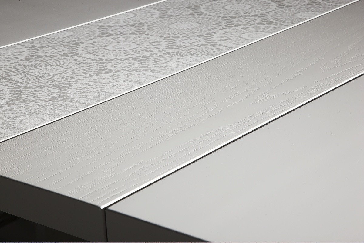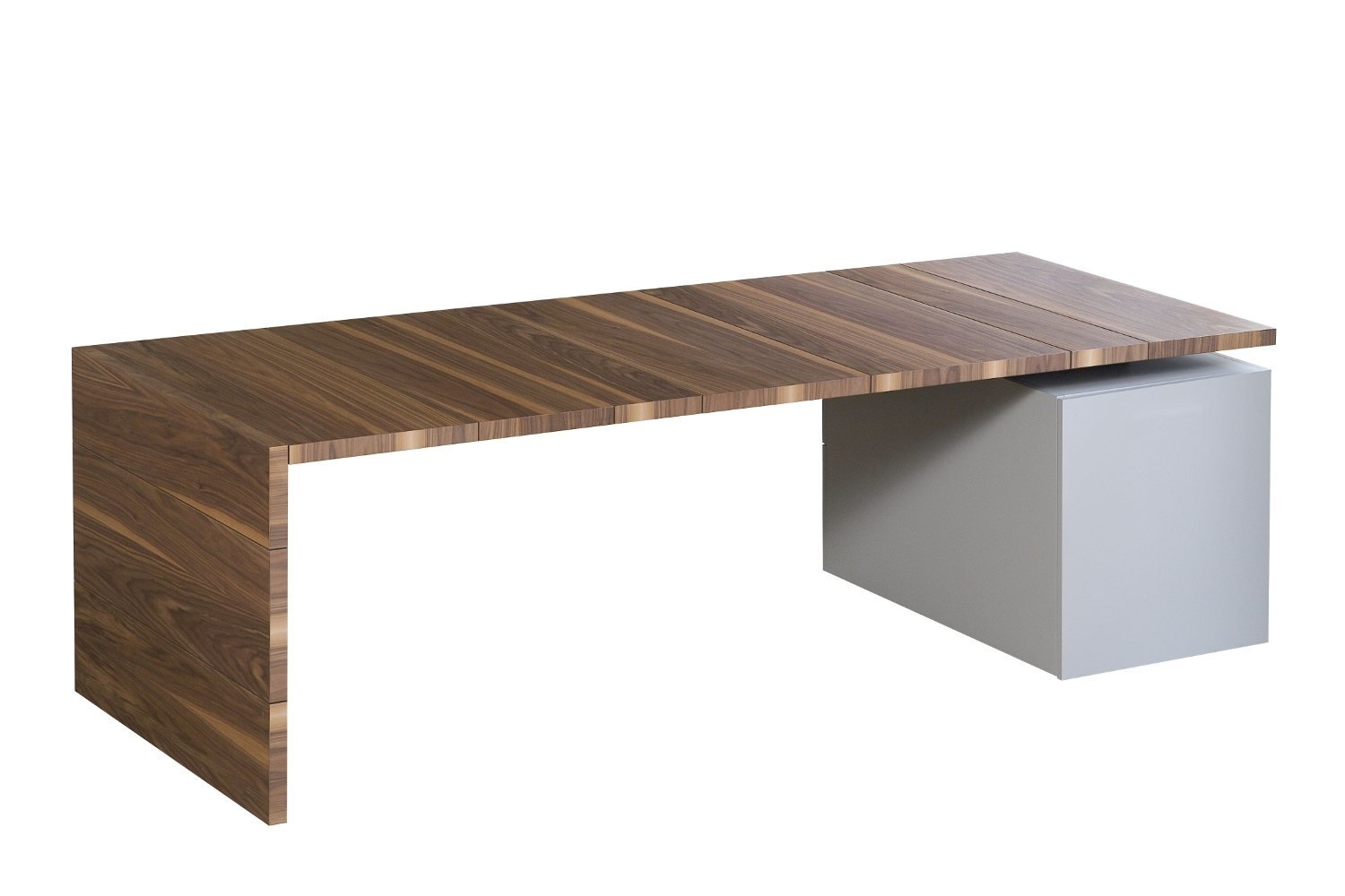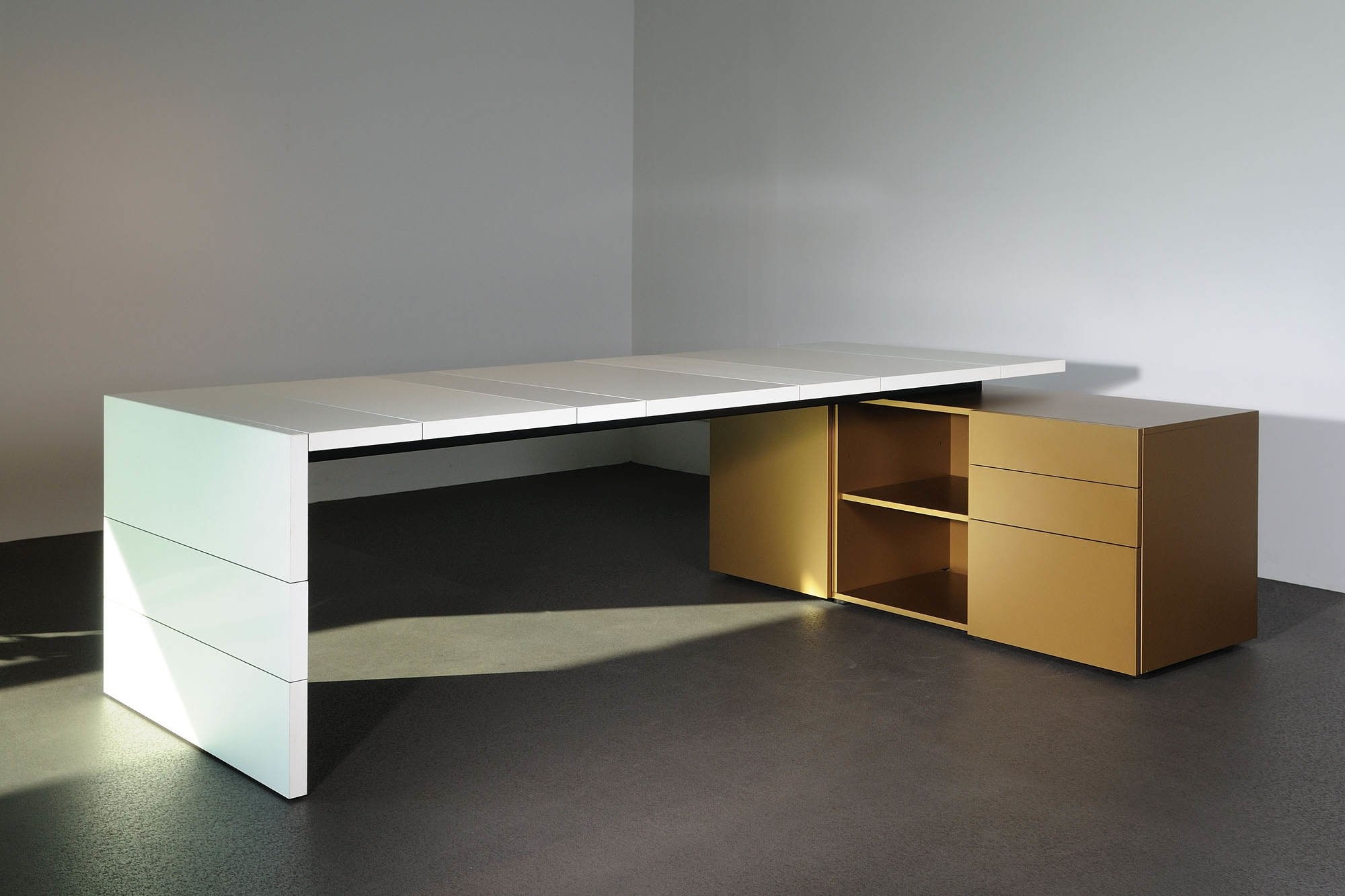 De Castelijn LV bureau kunt u met aparte bladstroken van 20, 30, 40 en 50 cm breed zelf samenvoegen. Zo beslist u niet alleen de lengte, maar ook de vorm van de naden in het blad: effen in stramien of juist een nonchalante samenstelling van breedtematen, de keus is aan u. Tevens bepaalt u of uw blad uit een houtsoort bestaat of verrassend te mixen is met frisse lakkleuren. De aparte bladstroken maken kleurverandering, vernieuwing of aanpassingen in de toekomst mogelijk.