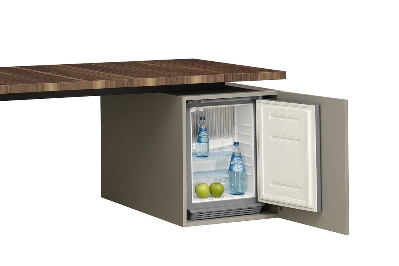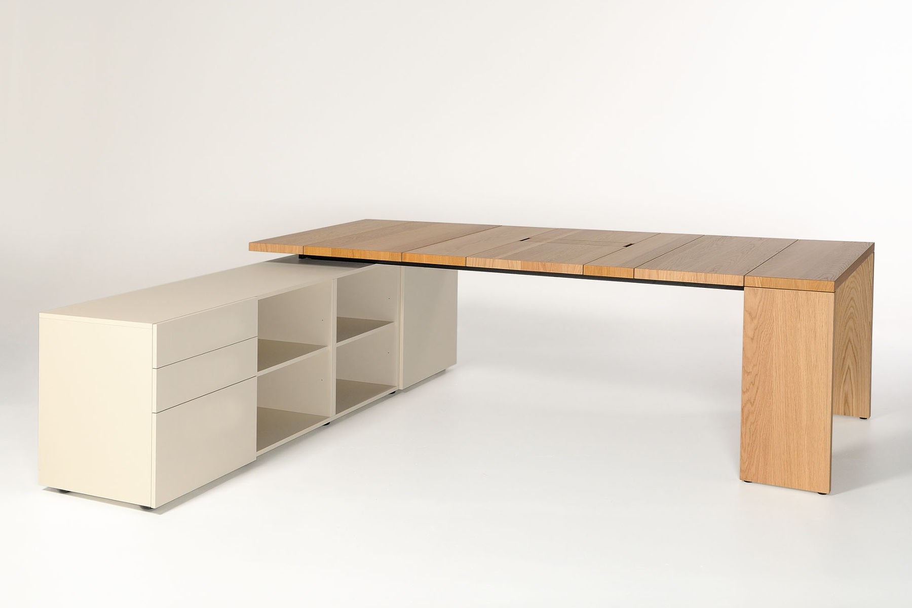 Het strokeneffect komt op de kasten terug in het afdekblad, dat links of rechts tot op de grond doorloopt. Zowel de bureaus van 100cm diep als de benchtafels van 160cm rusten op geheel gelakte kastjes, met rondom bergruimte. Nieuw: Push-to-open!