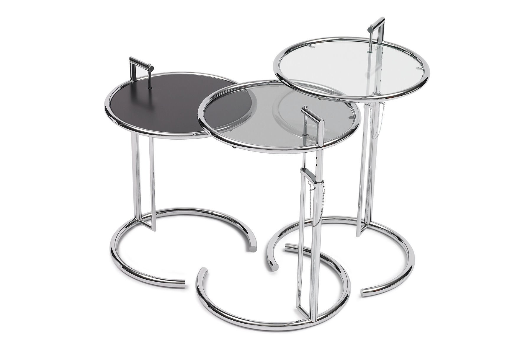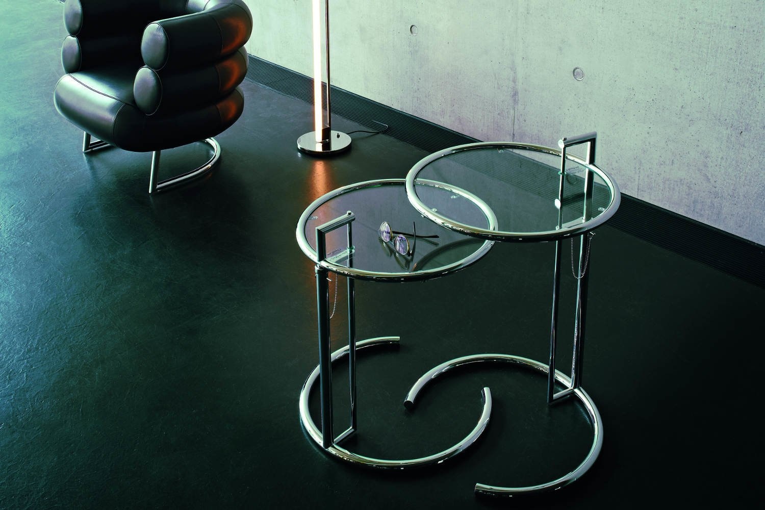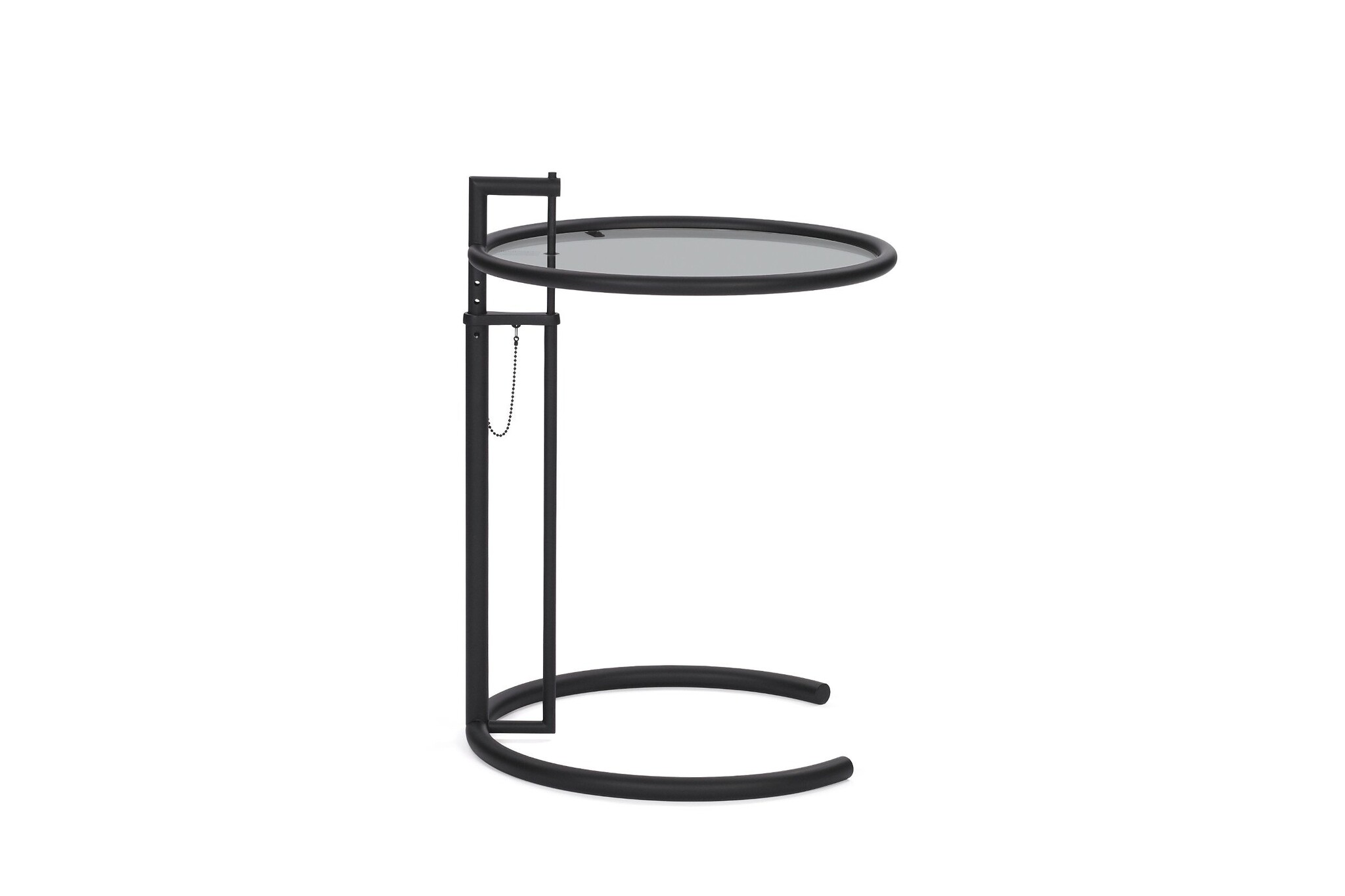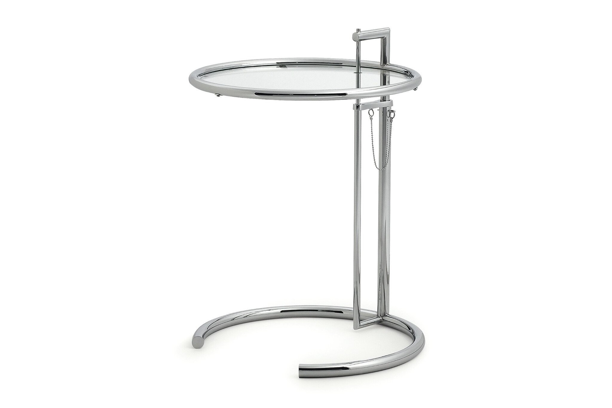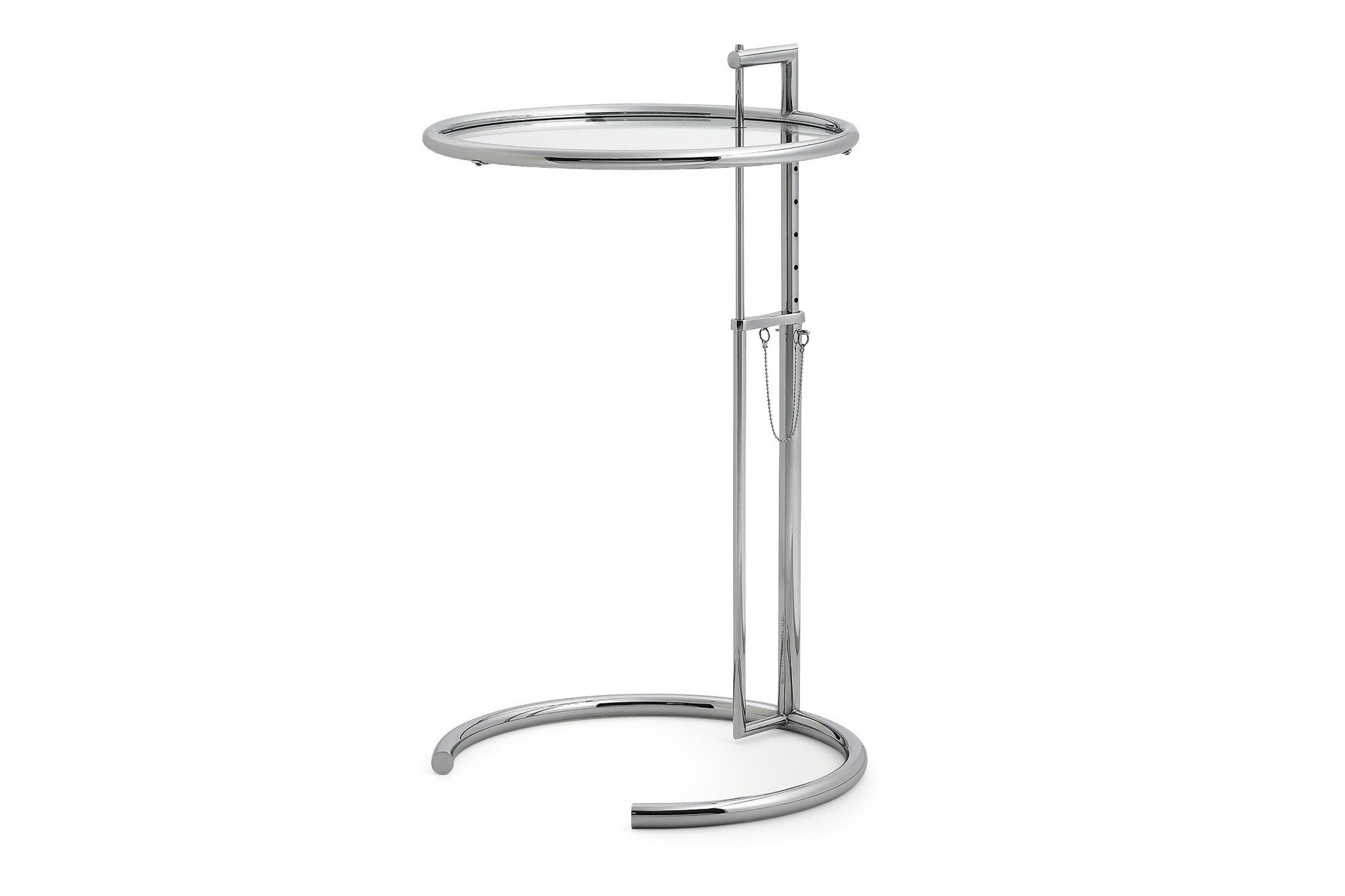 De ClassiCon Adjustable Table E 1027 is een bijzettafel met een in hoogte verstelbaar frame, met gepoedercoat stalen buis in zwart of verchroomd. Het tafelblad van de E 1027 is van helder kristal glas of grijs gerookt glas, of zwart gelakt metaal.