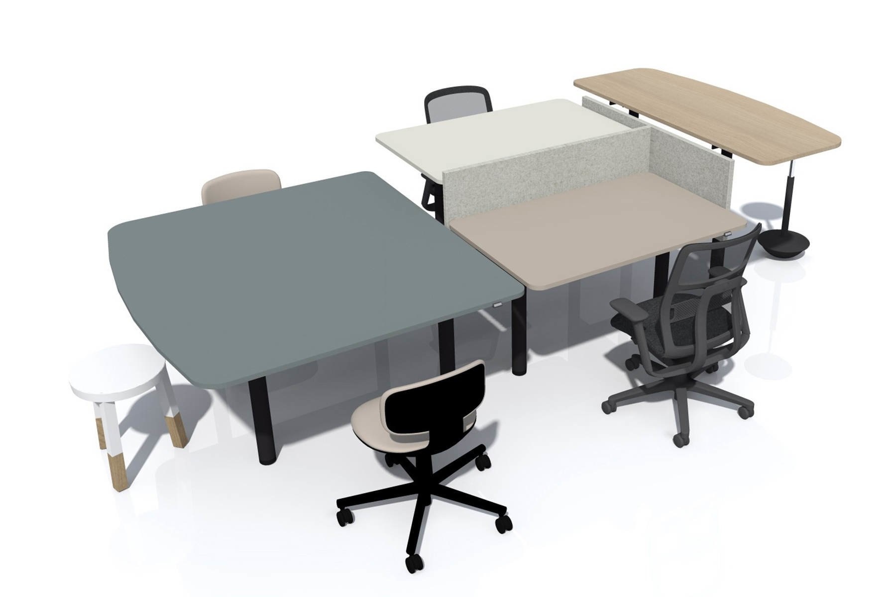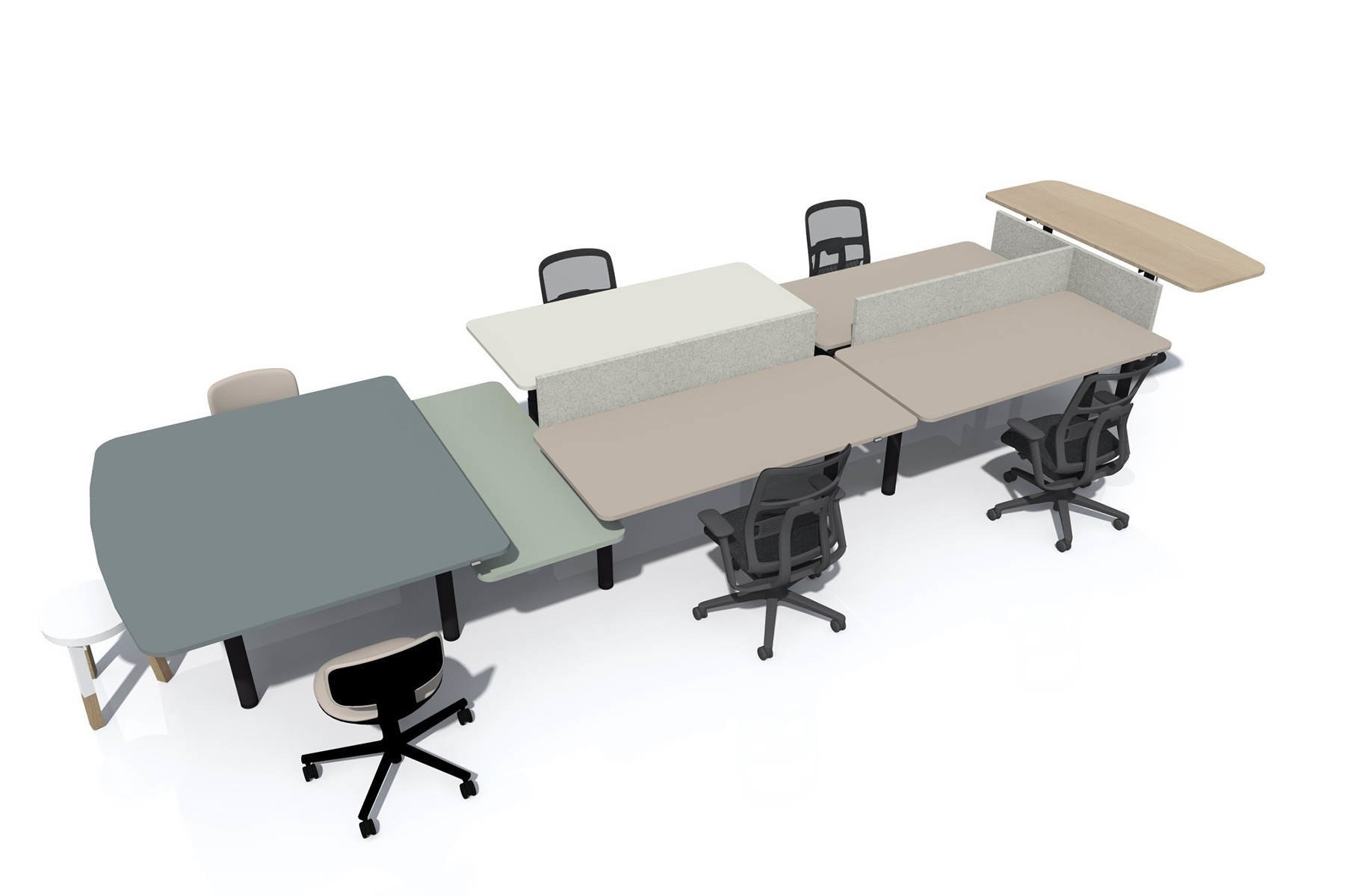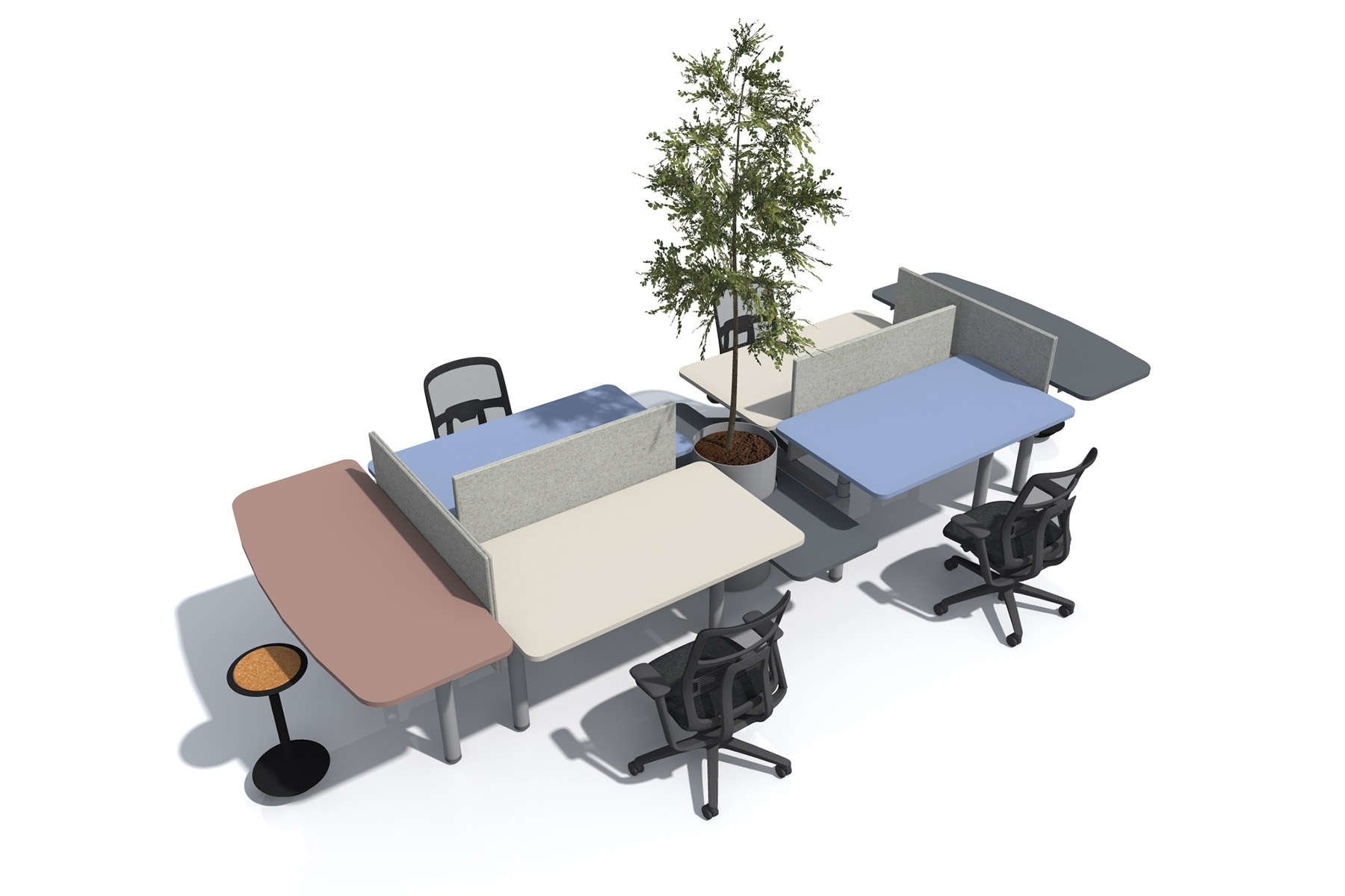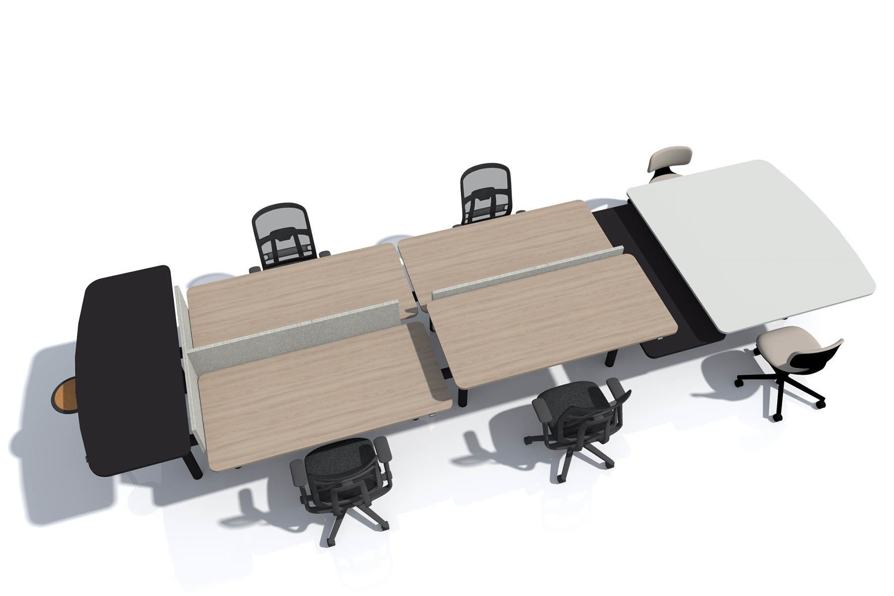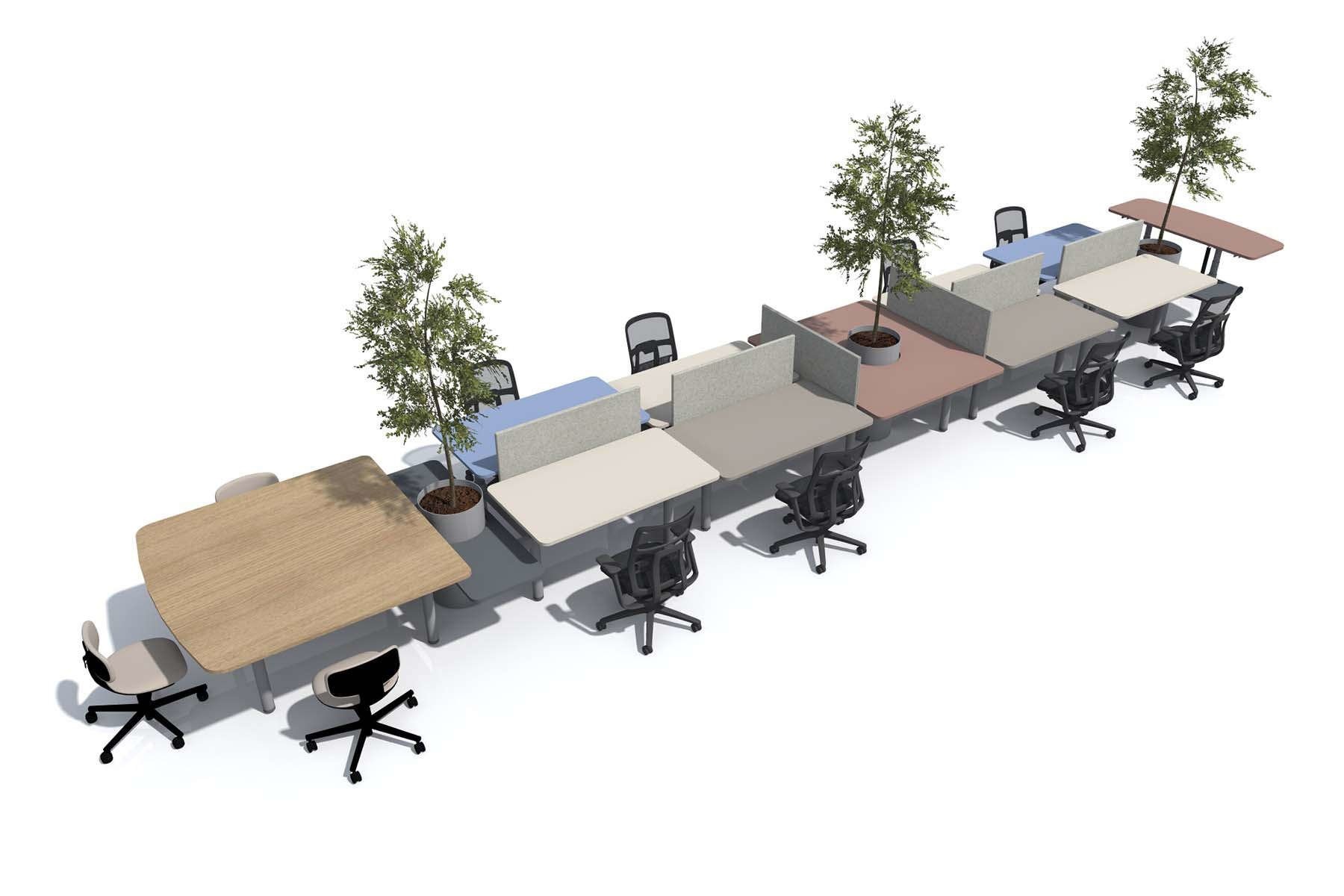 Het grote voordeel van deze COwerk FreeFlow tafels is dat deze uit meerdere losse bladen bestaat en deze zijn onafhankelijk van elkaar omhoog en omlaag te plaatsen. Om geluidsoverlast te voorkomen kunt u tussen de werkbladen akoestische schermen plaatsen.