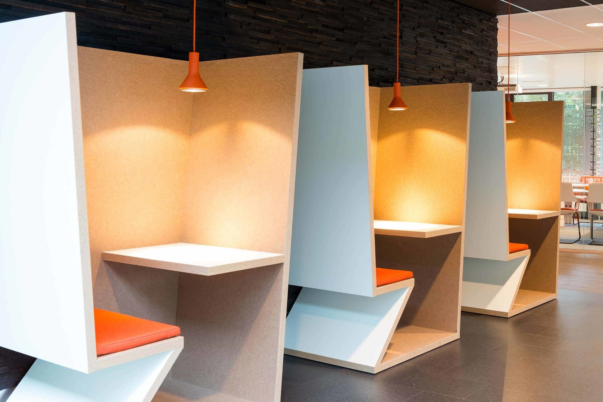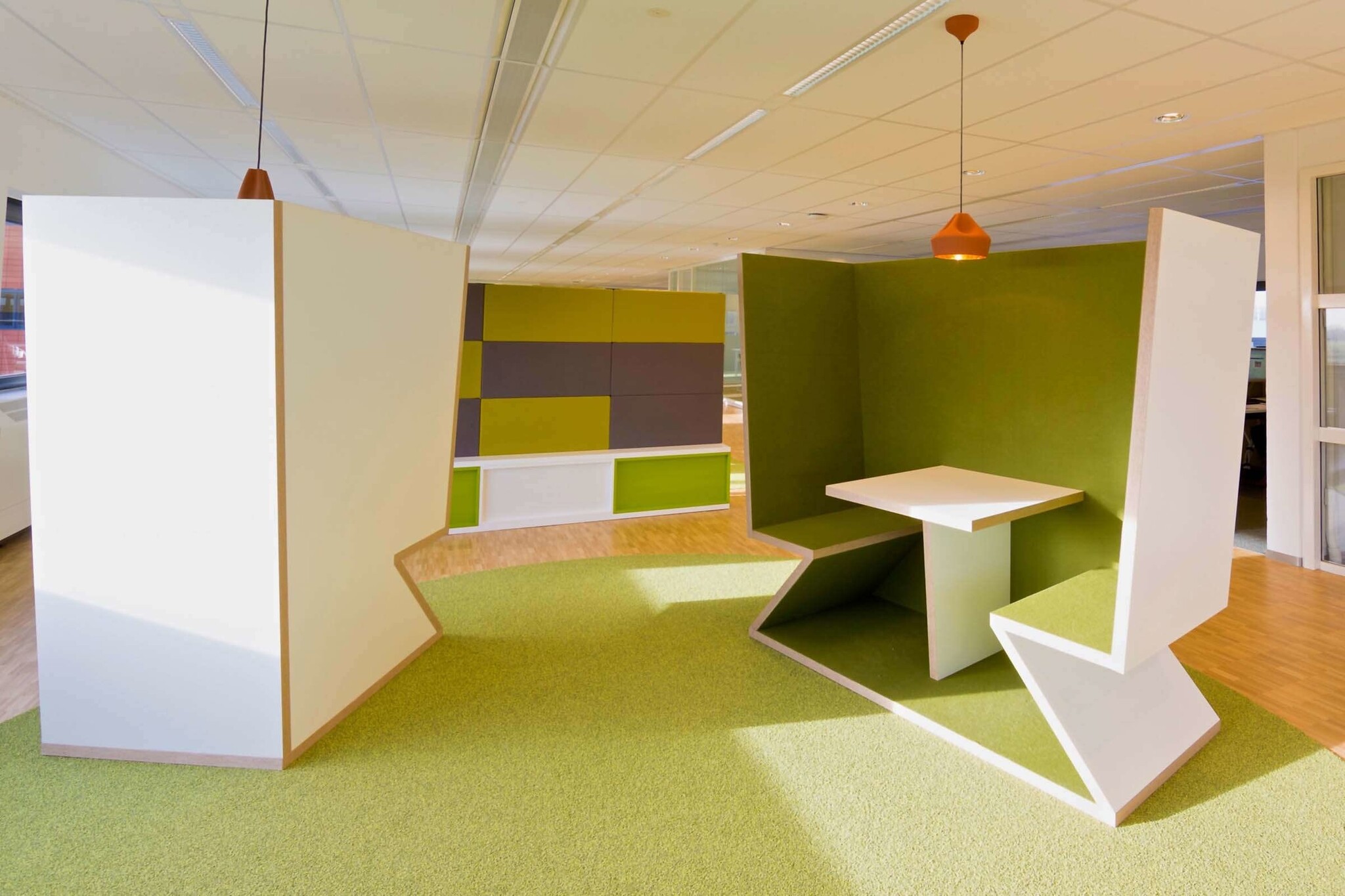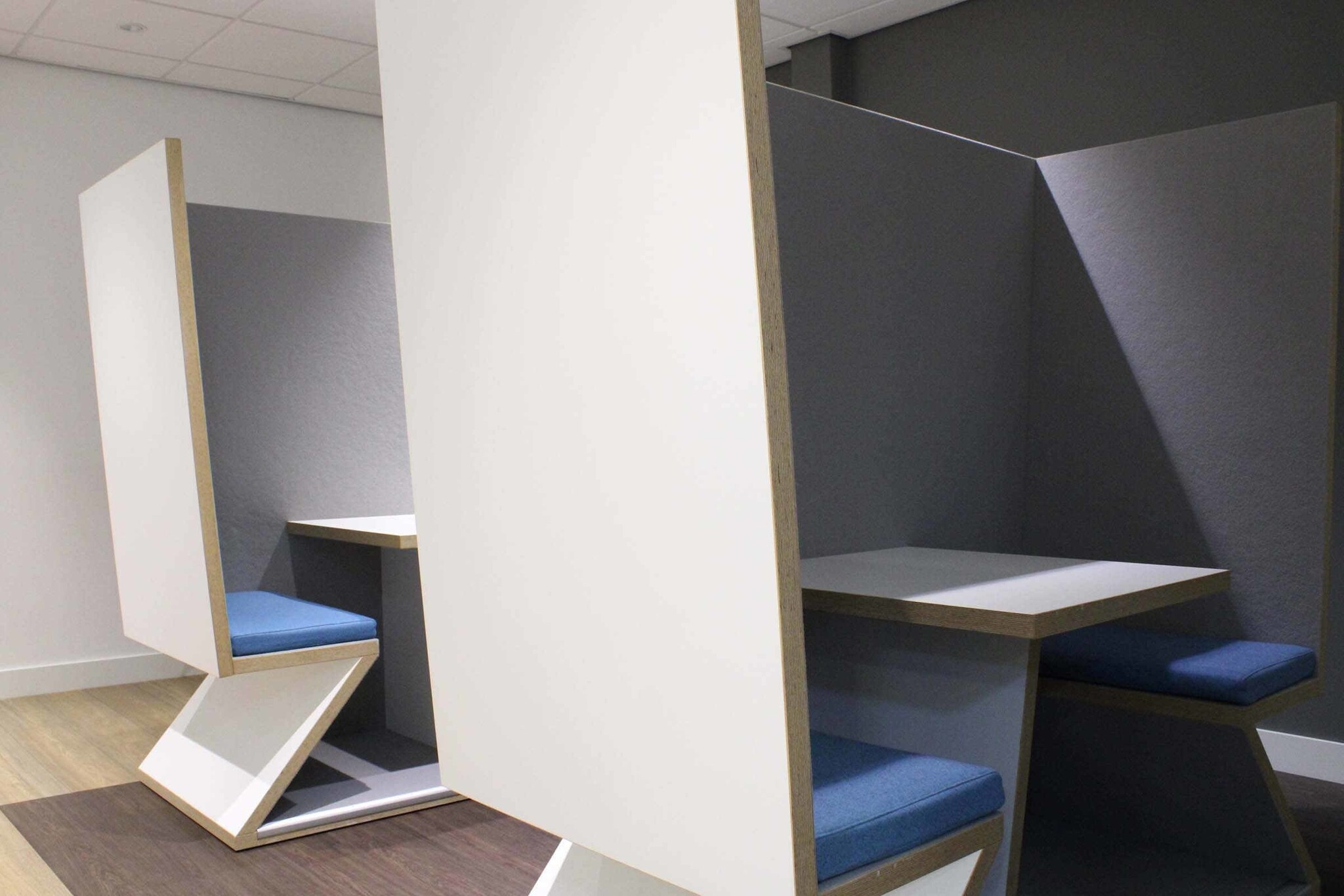 De akoestische werkplek is voorzien van vilten panelen gemaakt van 100 procent schapenwol en zijn 12 mm dik.