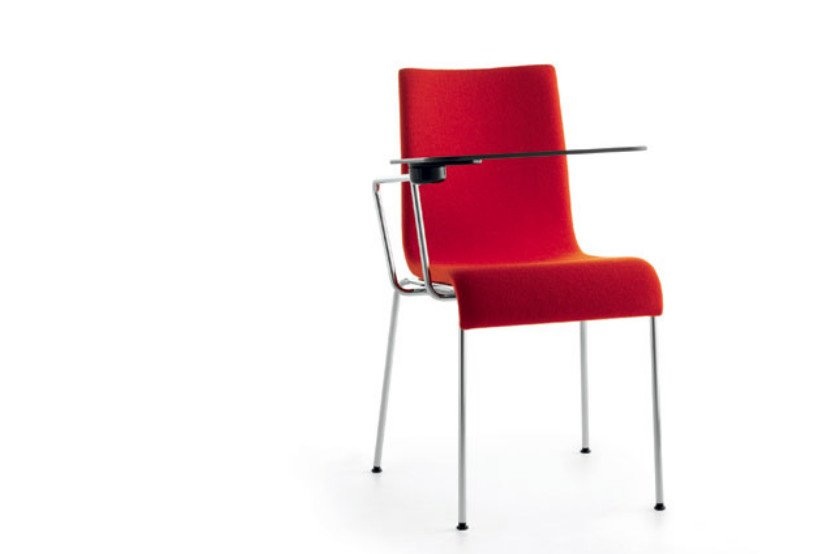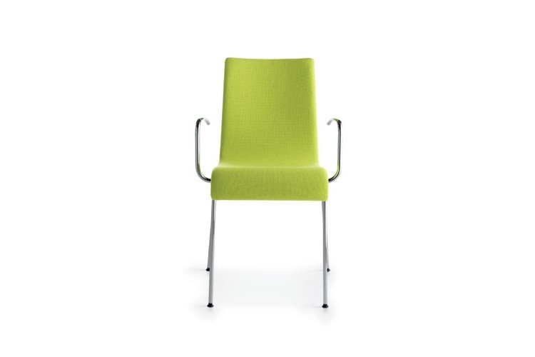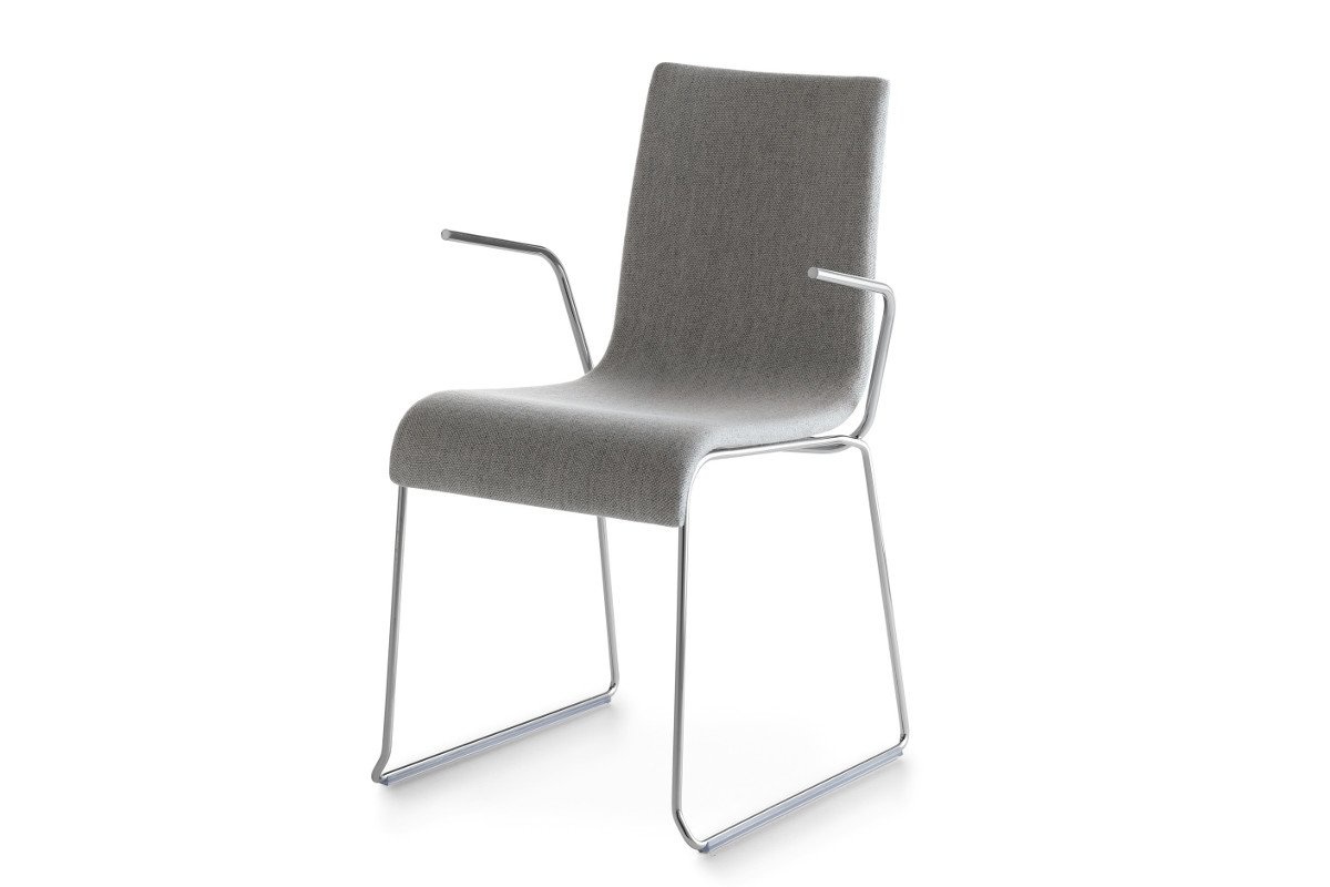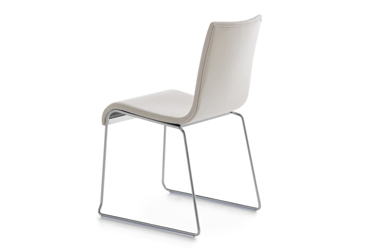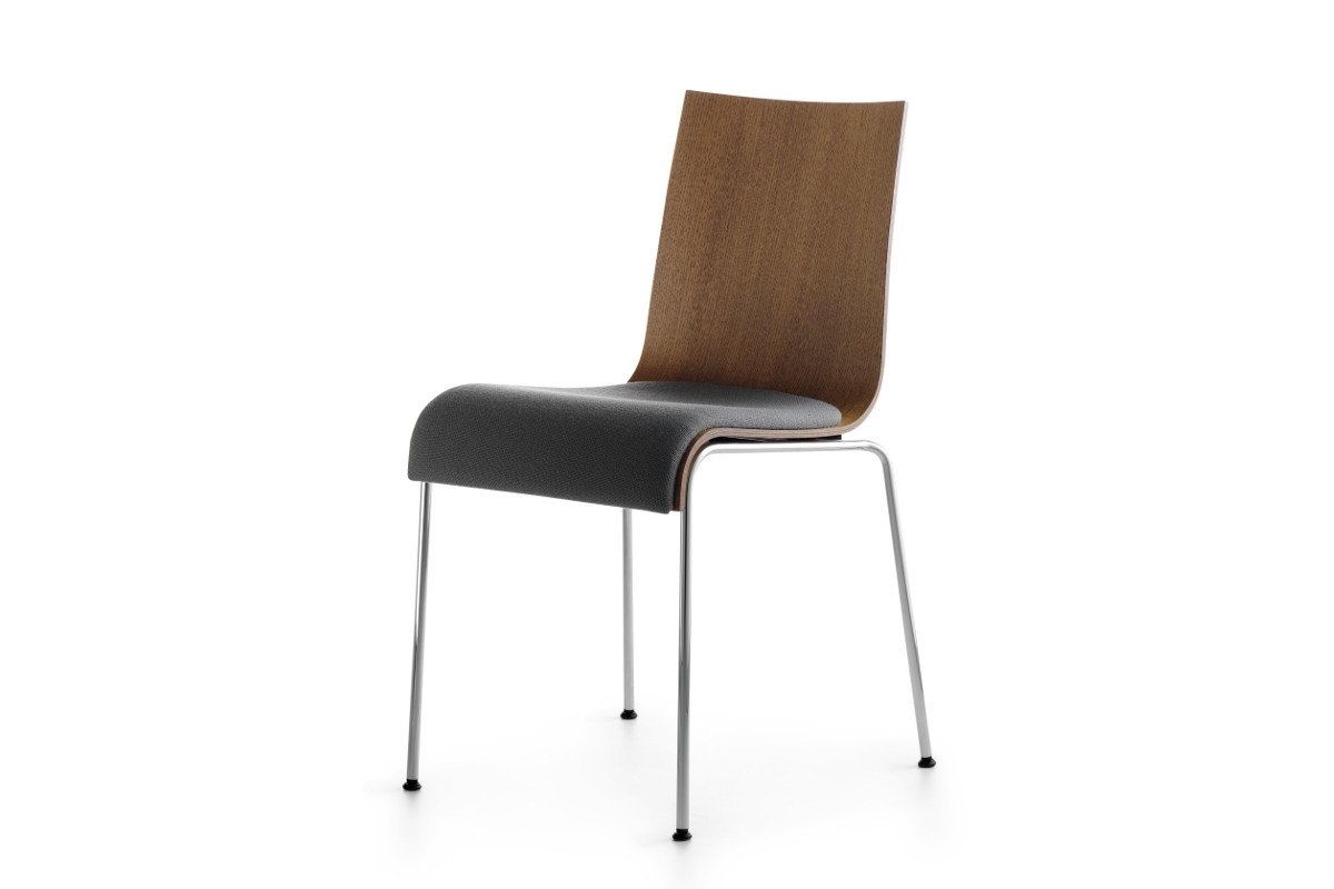 Asia R/SB; stapelbare stoel met slede stalen frame. De schaal van de stoel kan in laminaat, houtfineer of volledig gestoffeerd worden afgewerkt.