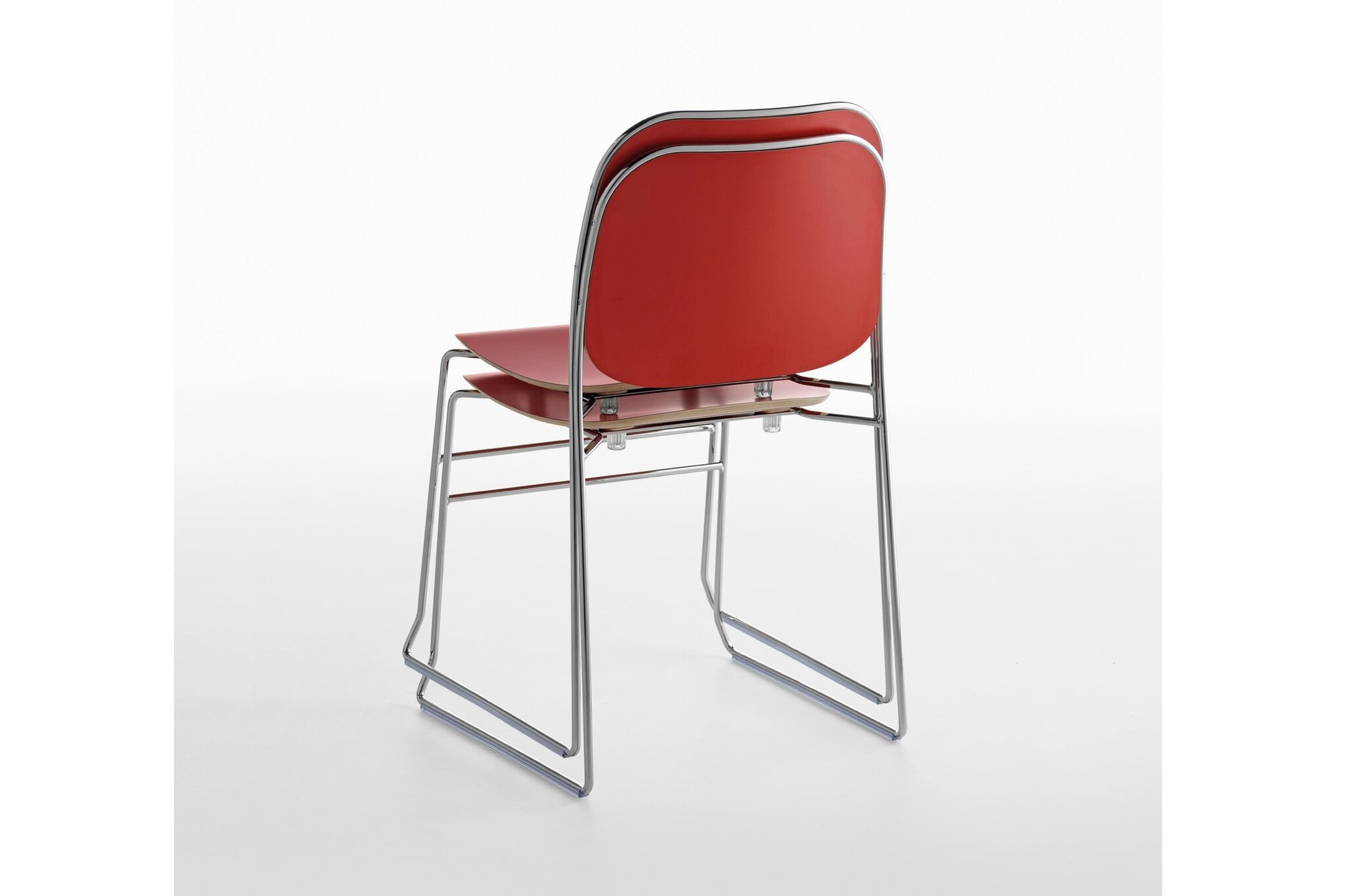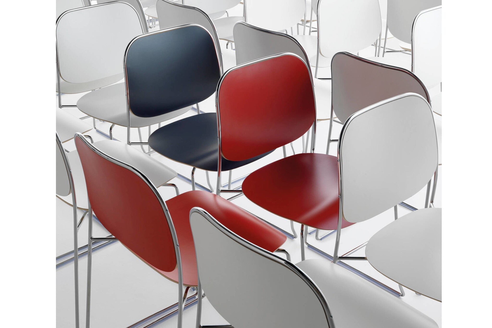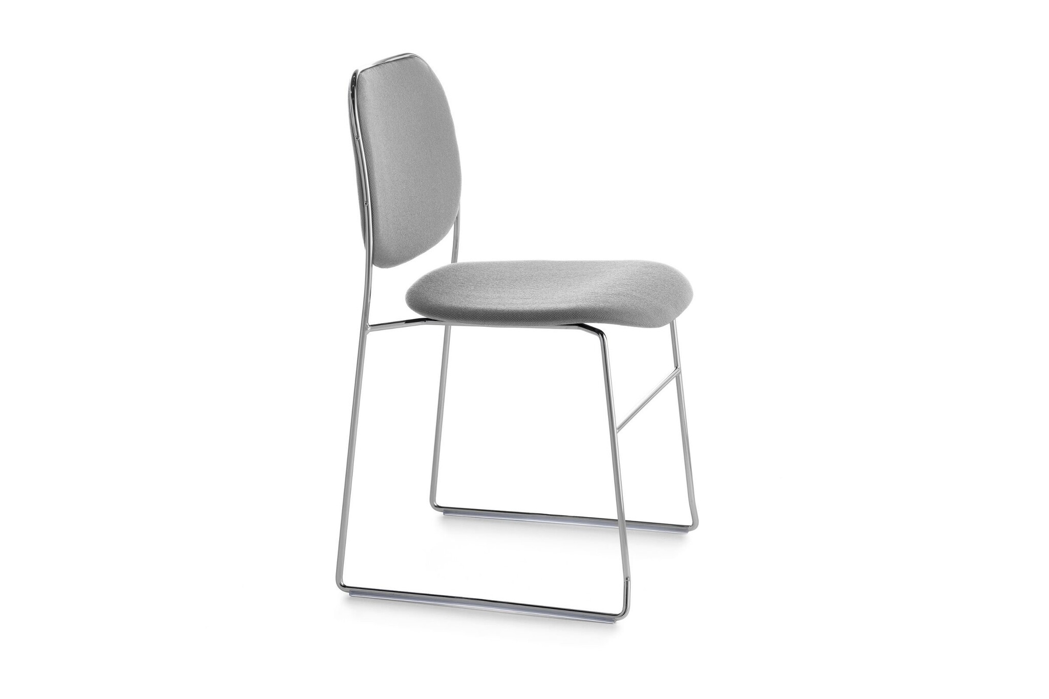 De stoelen hebben een frame in verchroomd staal van 11 mm. Poedercoating is op aanvraag. De zitting en rug is gemaakt van 10 mm multiple en heeft FU bekleding met brandwerend schuim. Stapelbaar tot maximaal 8 stuks en de stoelen zijn is getest op intensief gebruik. Optioneel zijn armleggers en een sterpoot onderstel mogelijk.
