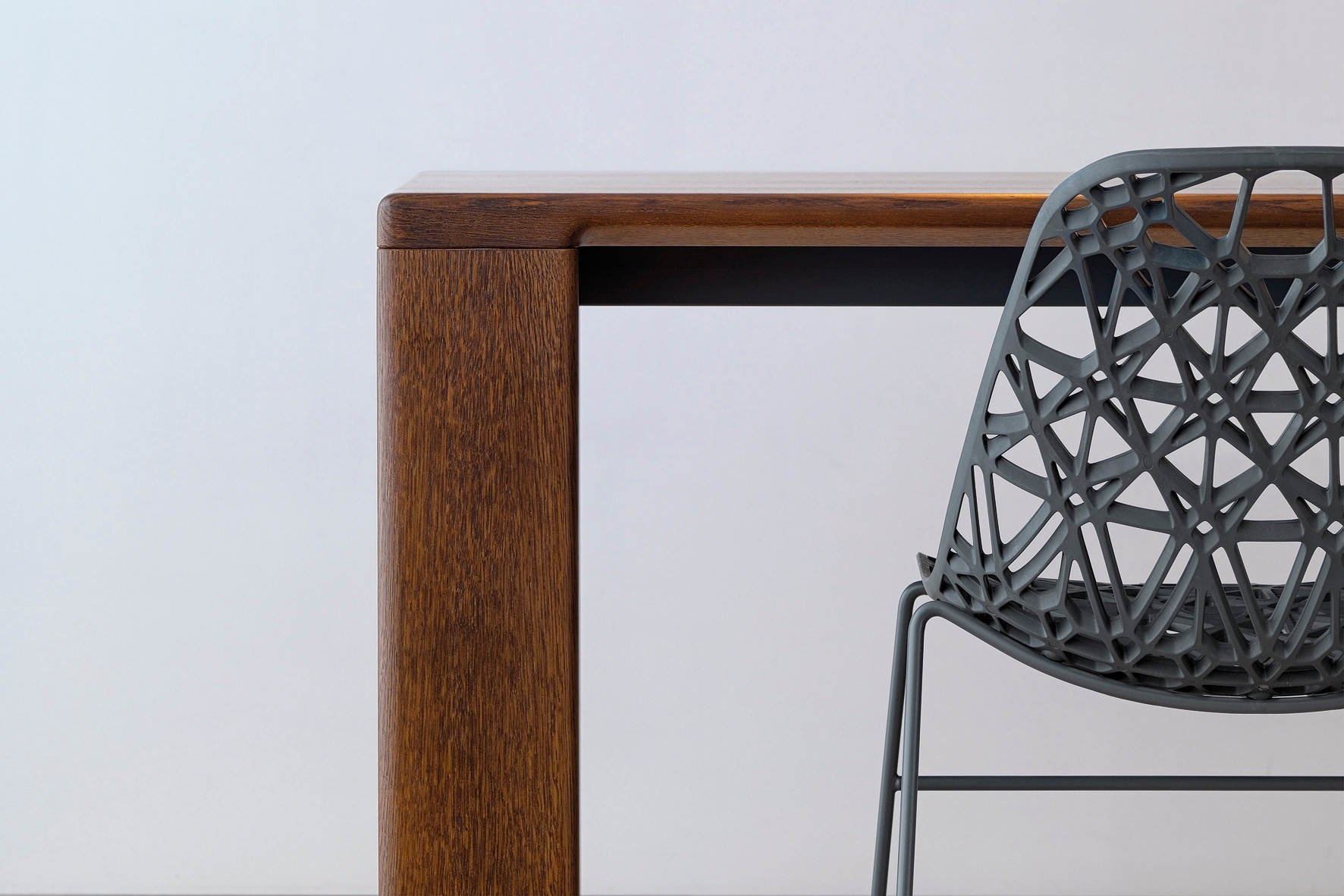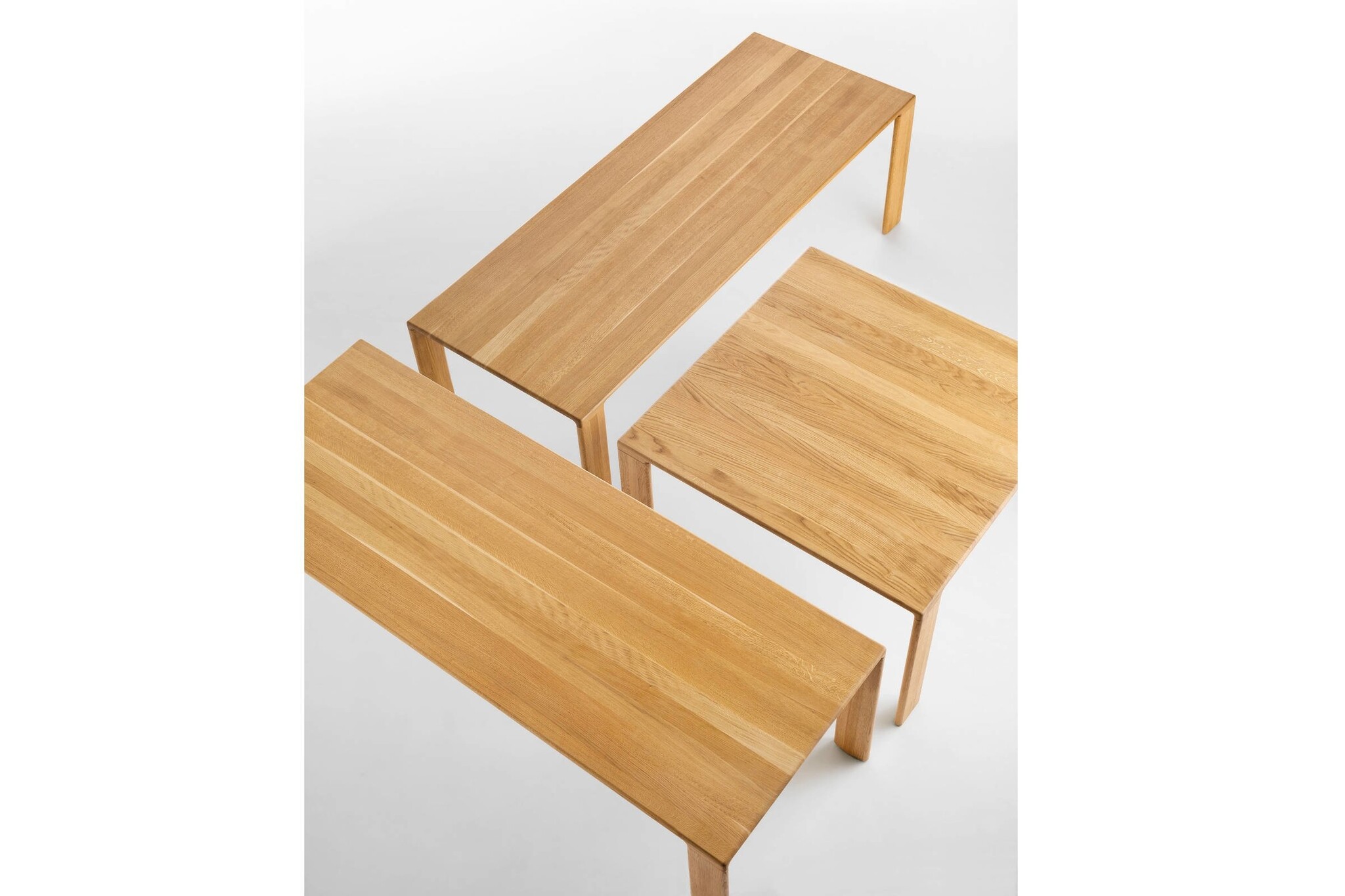 De tafelbladen en poten zijn gemaakt van massief Europees eiken hout met een 50 mm dikte met de hand afgewerkt. De leverbaren kleuren zijn: