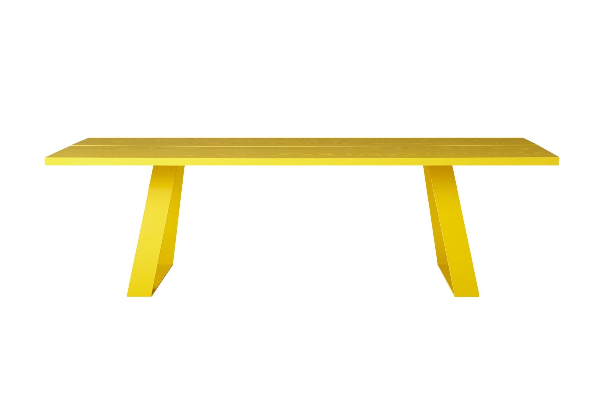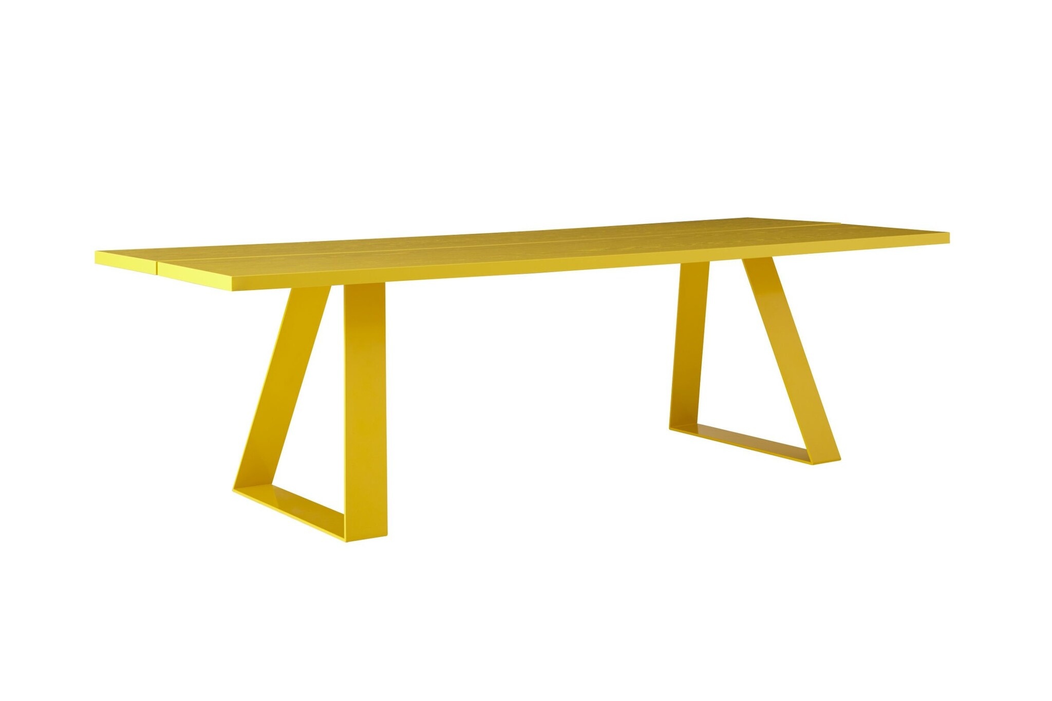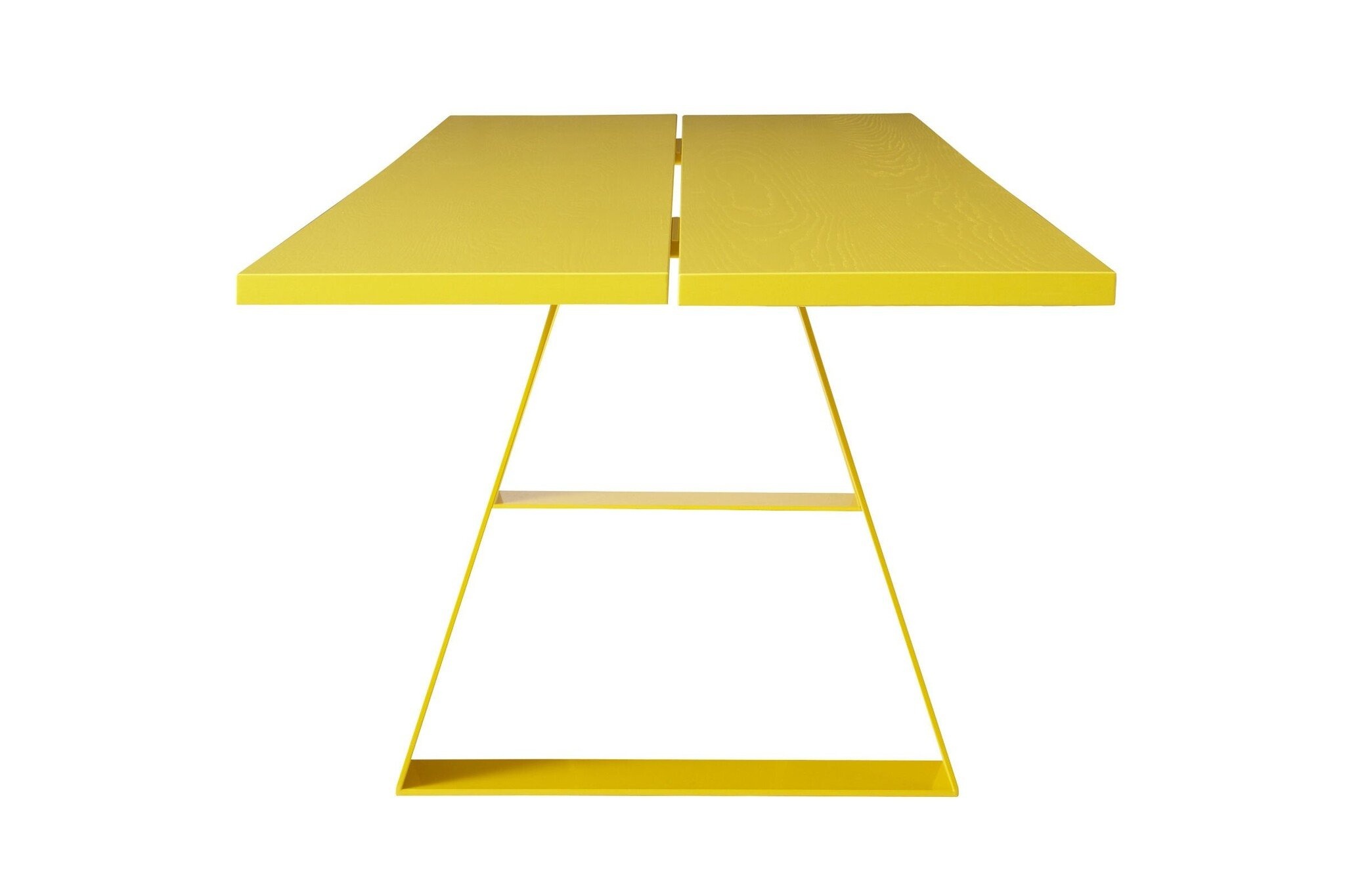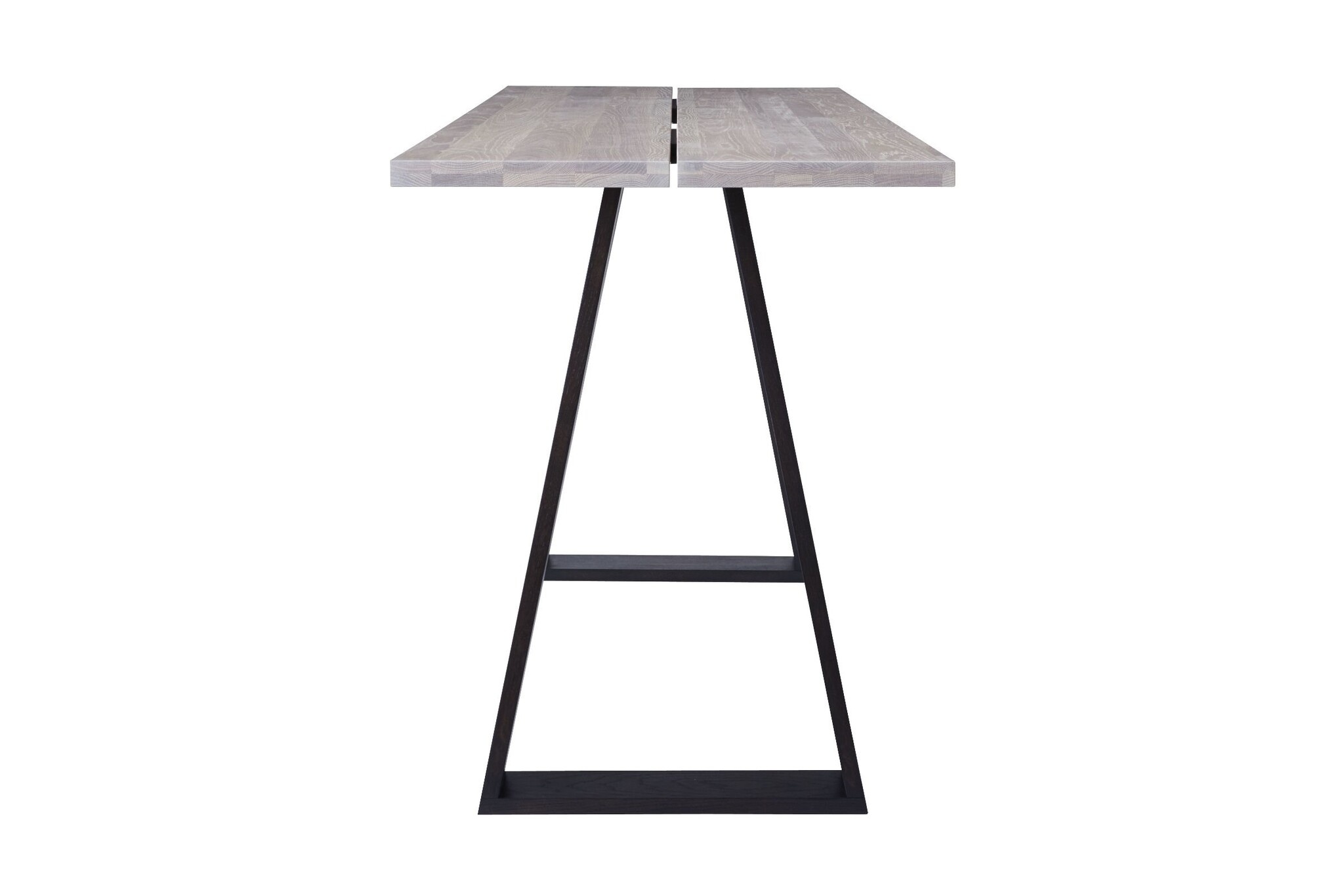 De tafel heeft een metalen onderstel of een eiken onderstel.