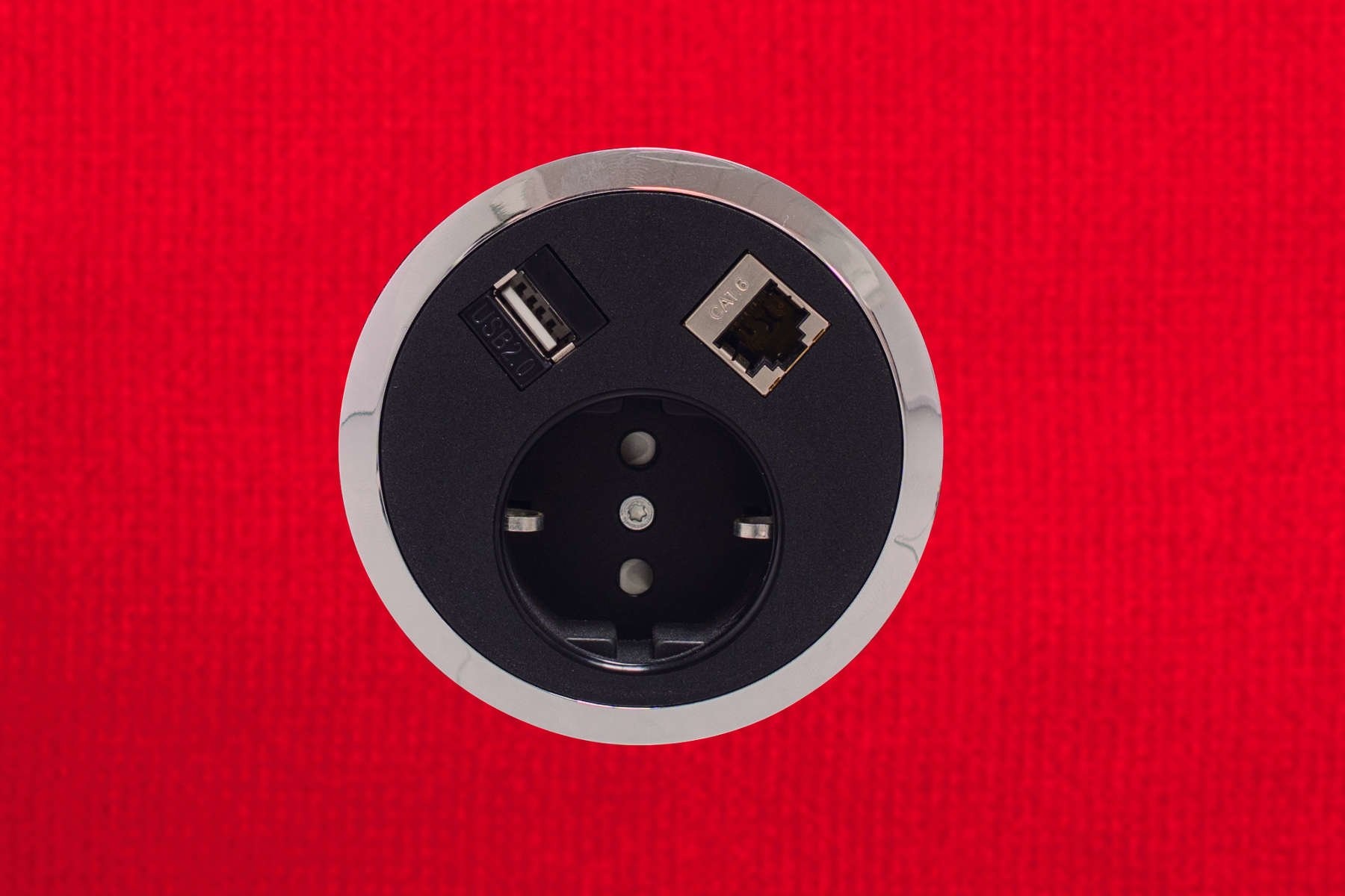 De Atelier fauteuil kan uitgerust worden met elektrificatie, waaronder een USB-ingang en een stopcontact. Hierdoor kunt u tijdens het werken uw laptop of telefoon opladen.