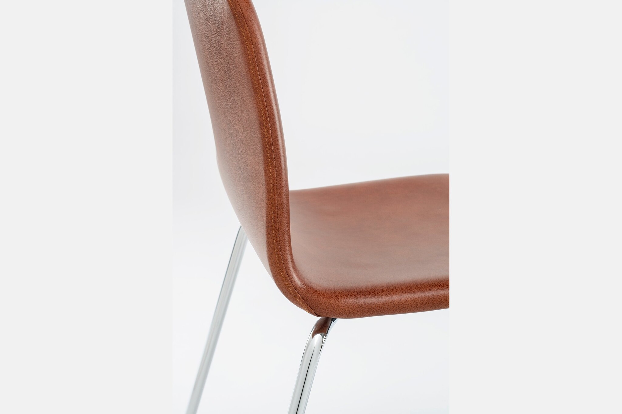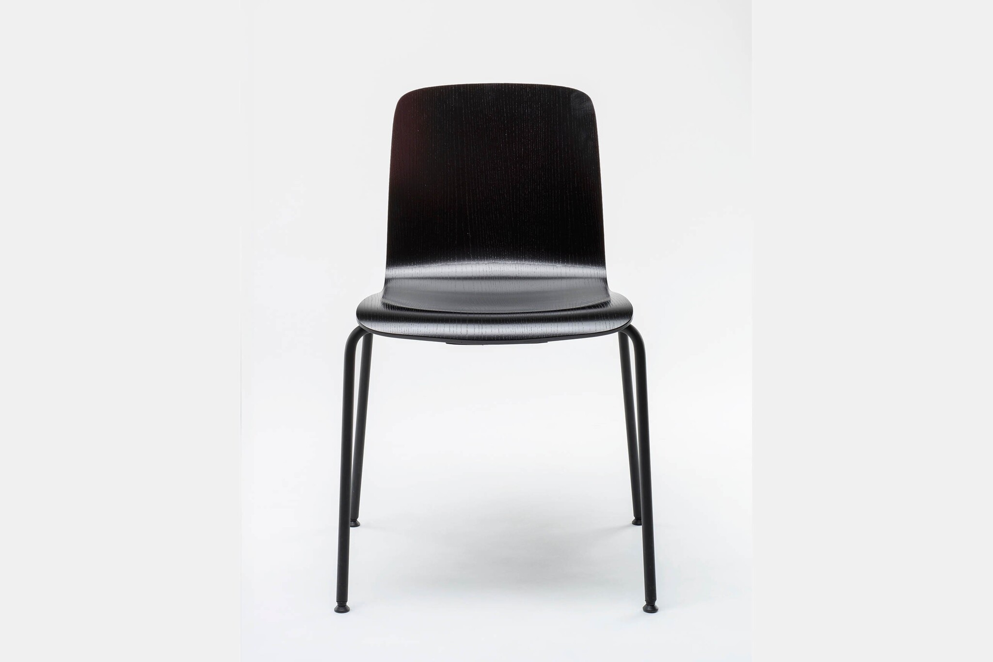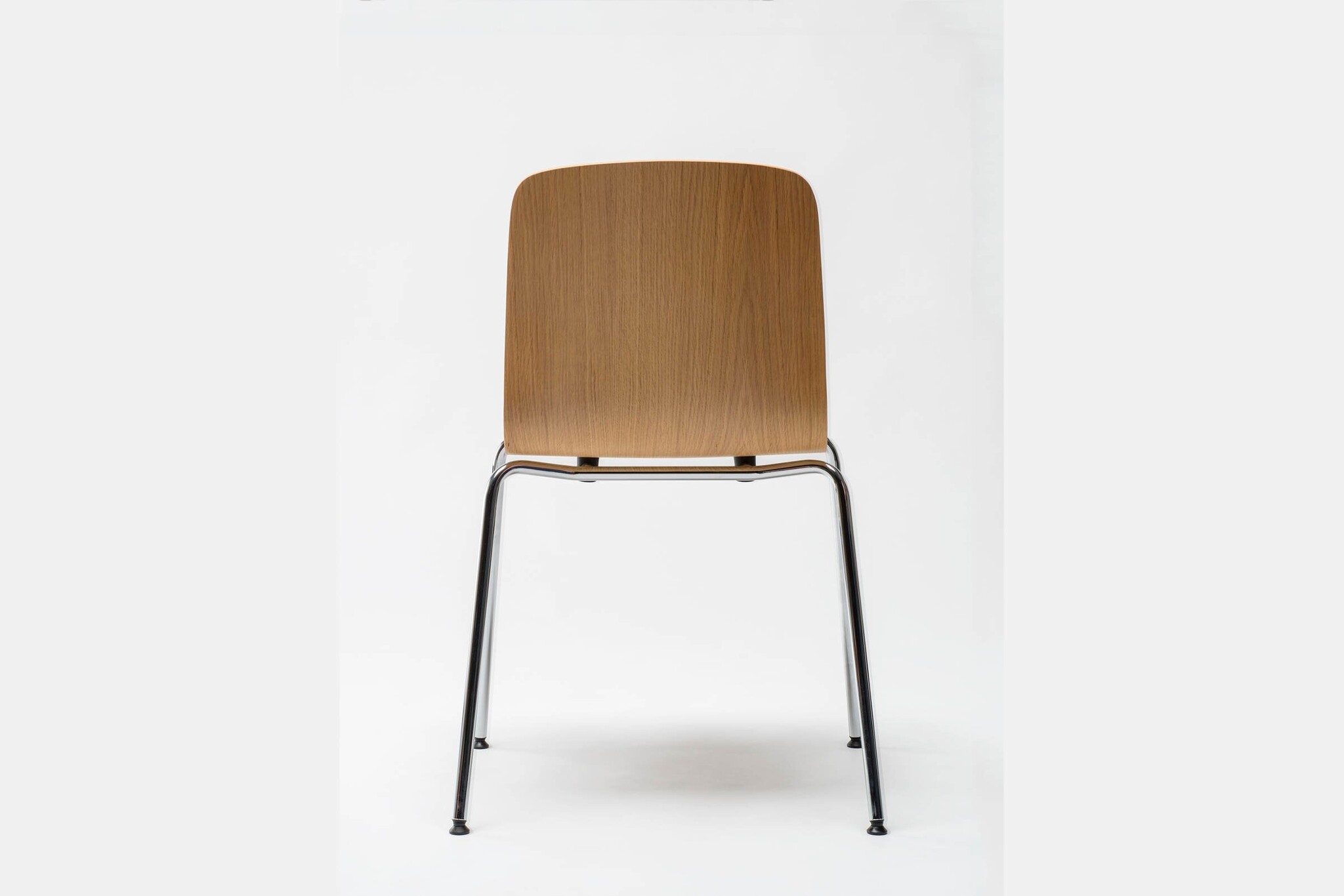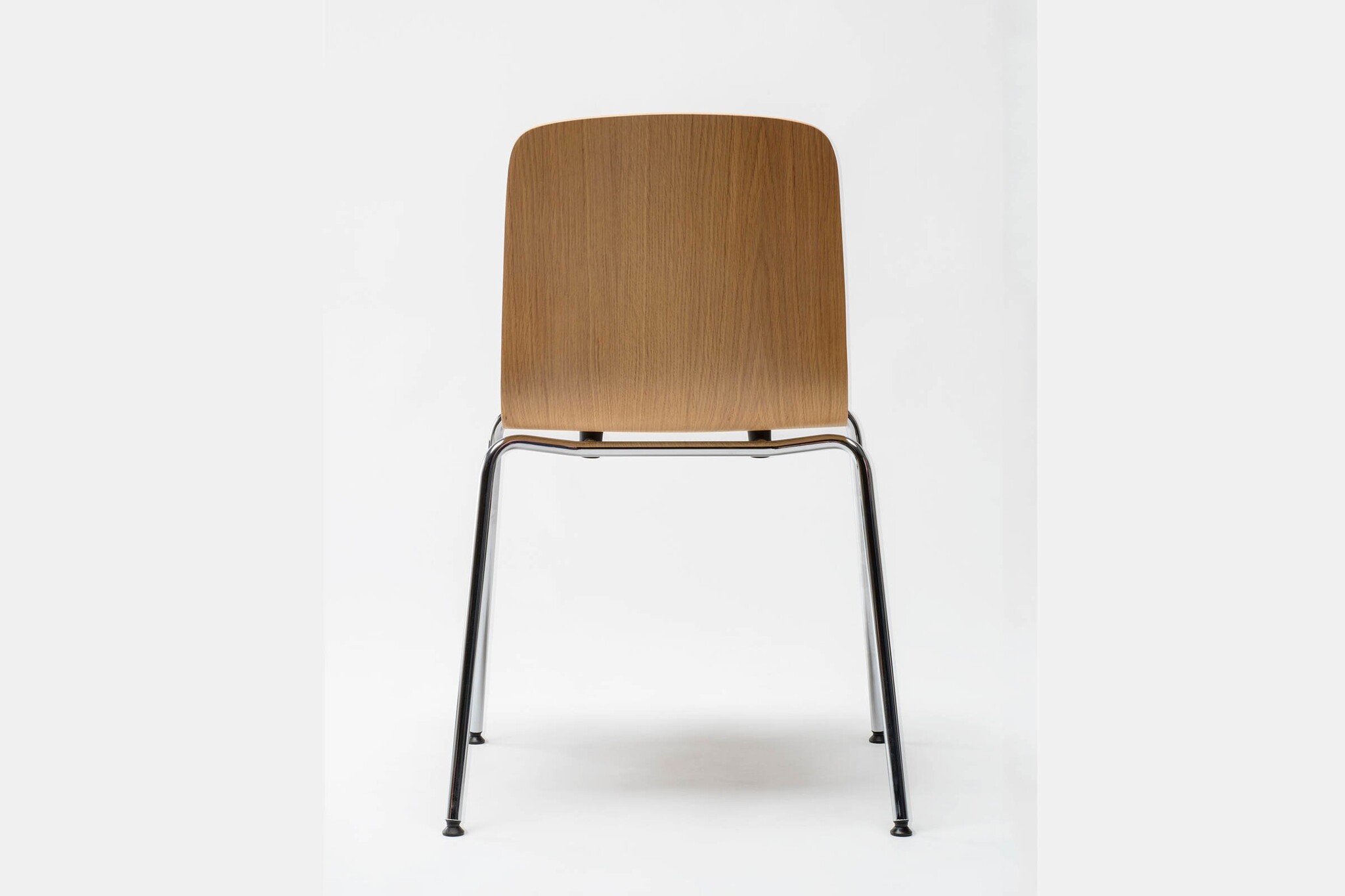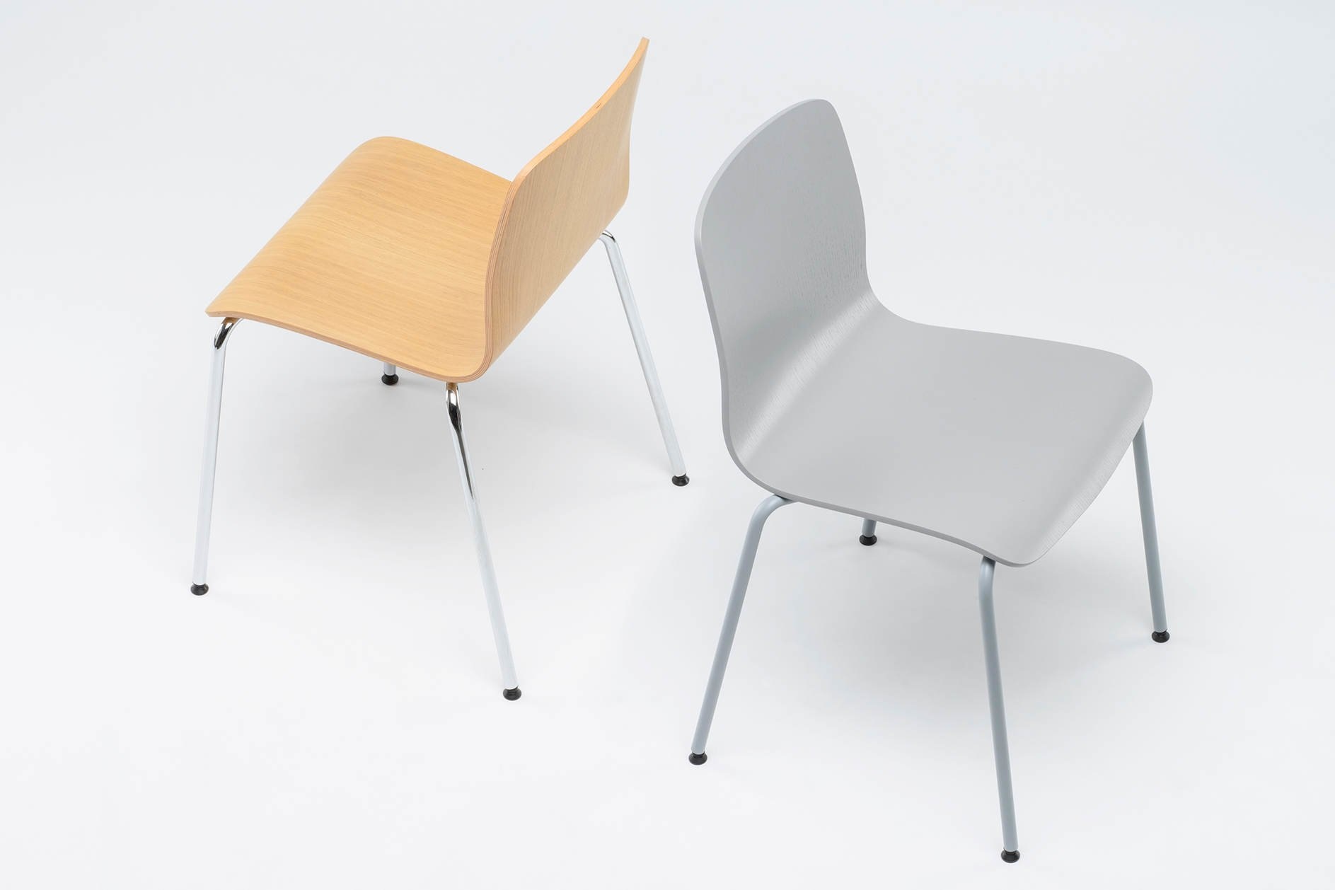 De stoel brengt comfort en elegantie samen. De zacht gebogen zitting is van hout gemaakt en is voorzien van een slank stalen frame die de stoel ondersteund. De stoel is ook standaard te leveren in de eerdergenoemde materialen. Daarentegen zijn er wel nog extra opties om de stoel te personaliseren. Indien u meer dan 50 stoelen bestelt, mag u zelf de kleur van het frame en de zitting kiezen.