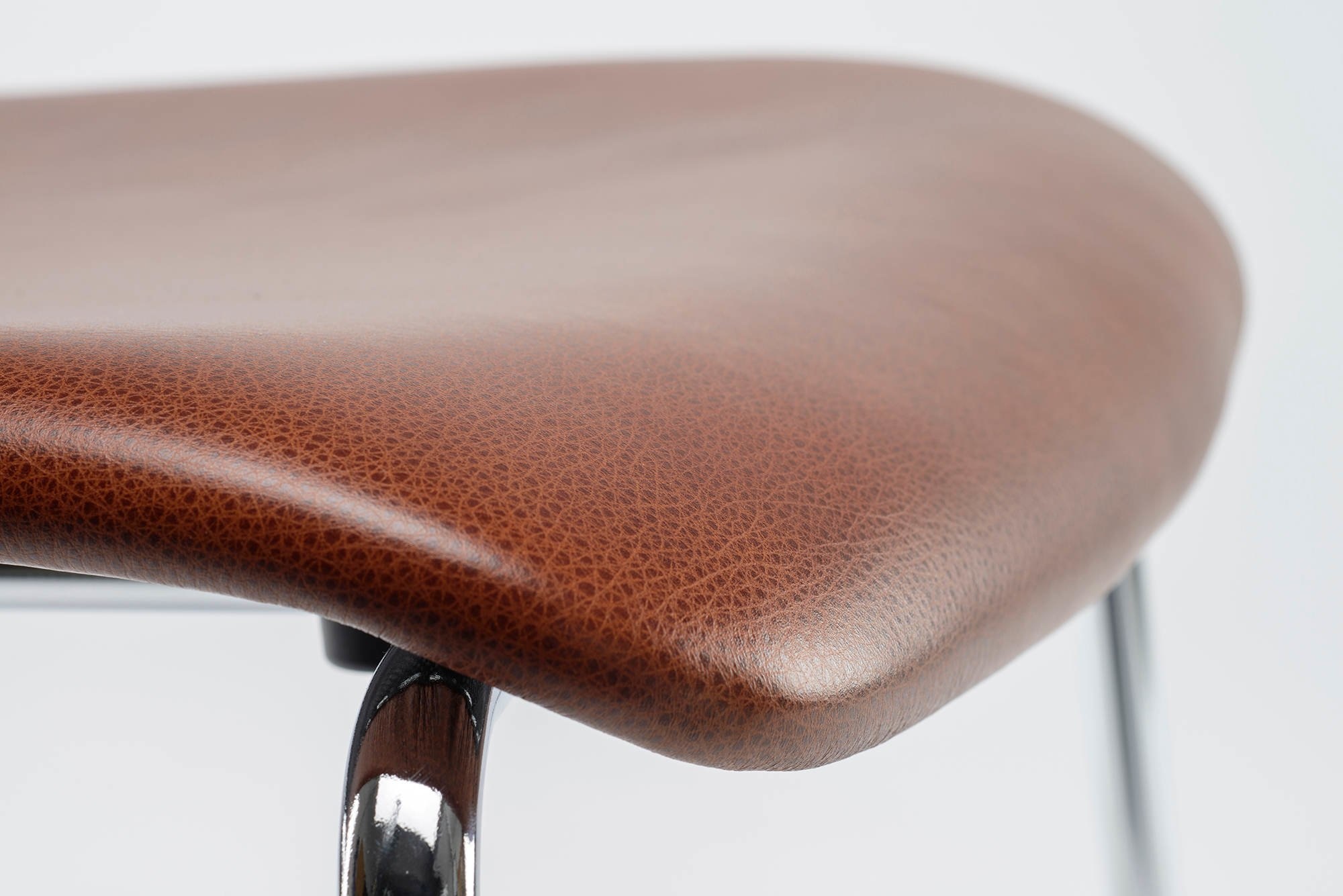 De stoel is standaard te leveren met een houten zitting en een stalen frame