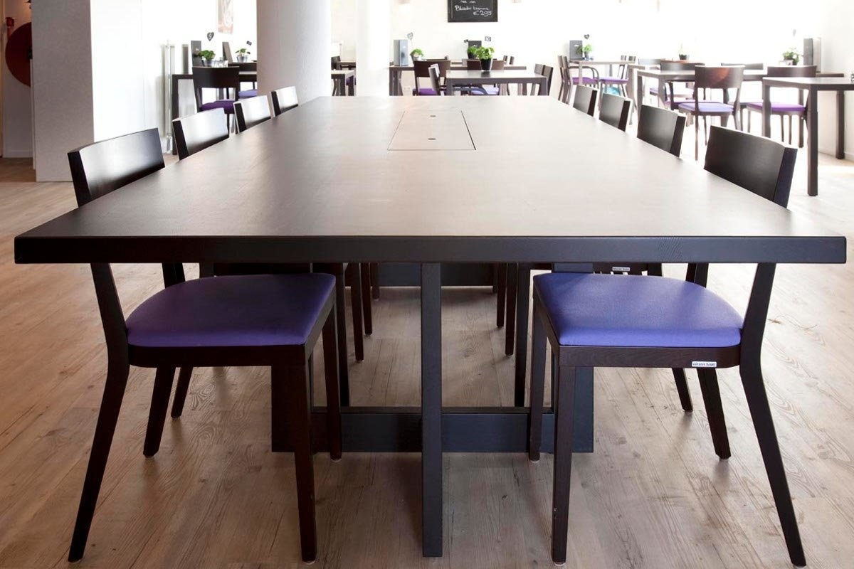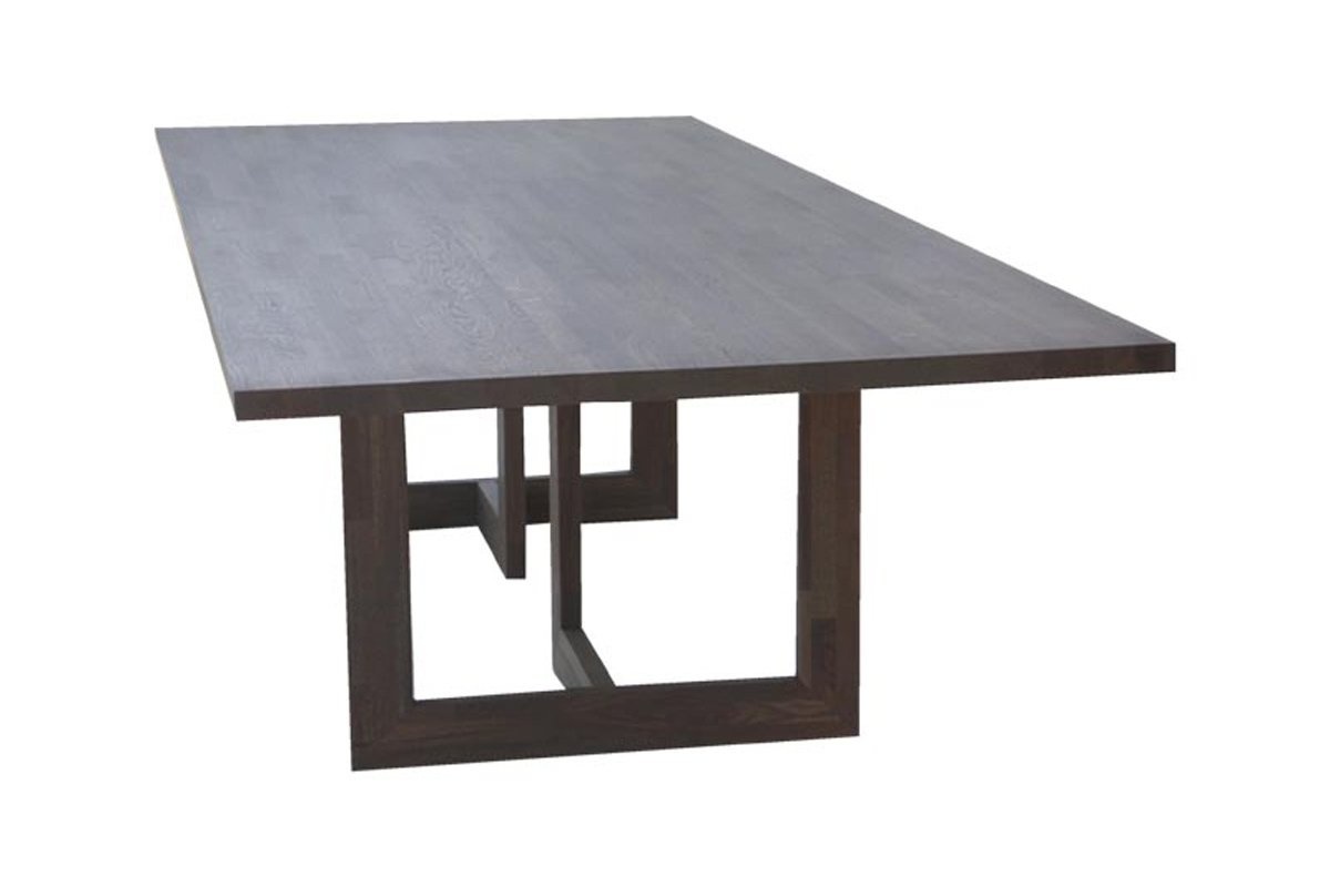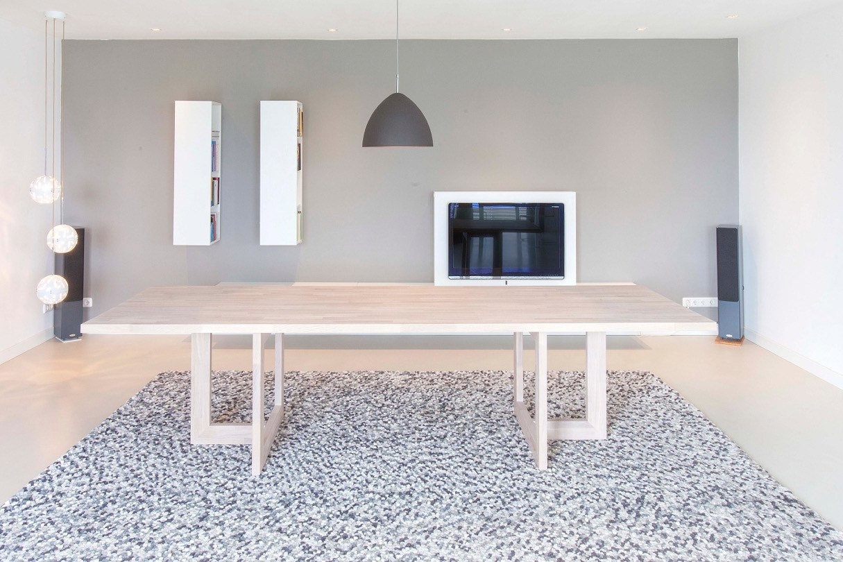 De All Size tafel van Dutchglobe is een indrukwekkende tafel die gemaakt is van 40 mm eikenhout met een rechte randafwerking. De massief eiken tafel is extreem stabiel en heeft veel ruimte voor benen en stoelen vanwege het centraal geplaatste frame. De standaard afwerking van de houten tafels van Dutchglobe is 2 componenten lak. Dit is veel makkelijker in onderhoud. De olie is nog wel mogelijk als afwerking, echter droogt het hout sneller uit en kan dit gaan scheuren wanneer het niet goed wordt onderhouden.De tafel is te gebruiken in de kantine, bedrijfsrestaurant of andere horecagelegenheden, maar ook als vergadertafel met een robuuste uitstraling.