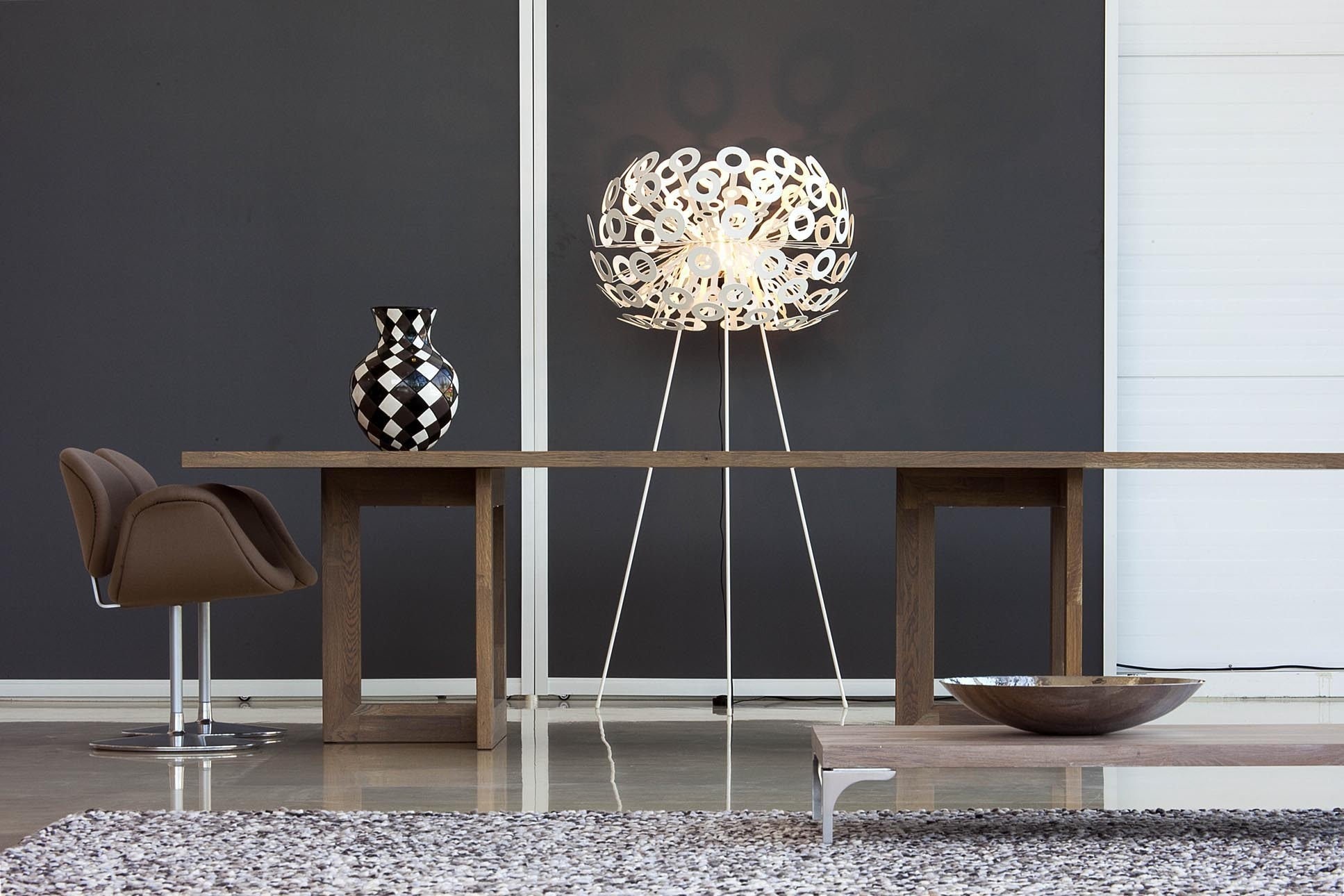De materialen zijn duurzaam en hoogwaardig. Gevingerlast eiken en gepoedercoat metaal voor de tafels en aluminium voor de verlichting.