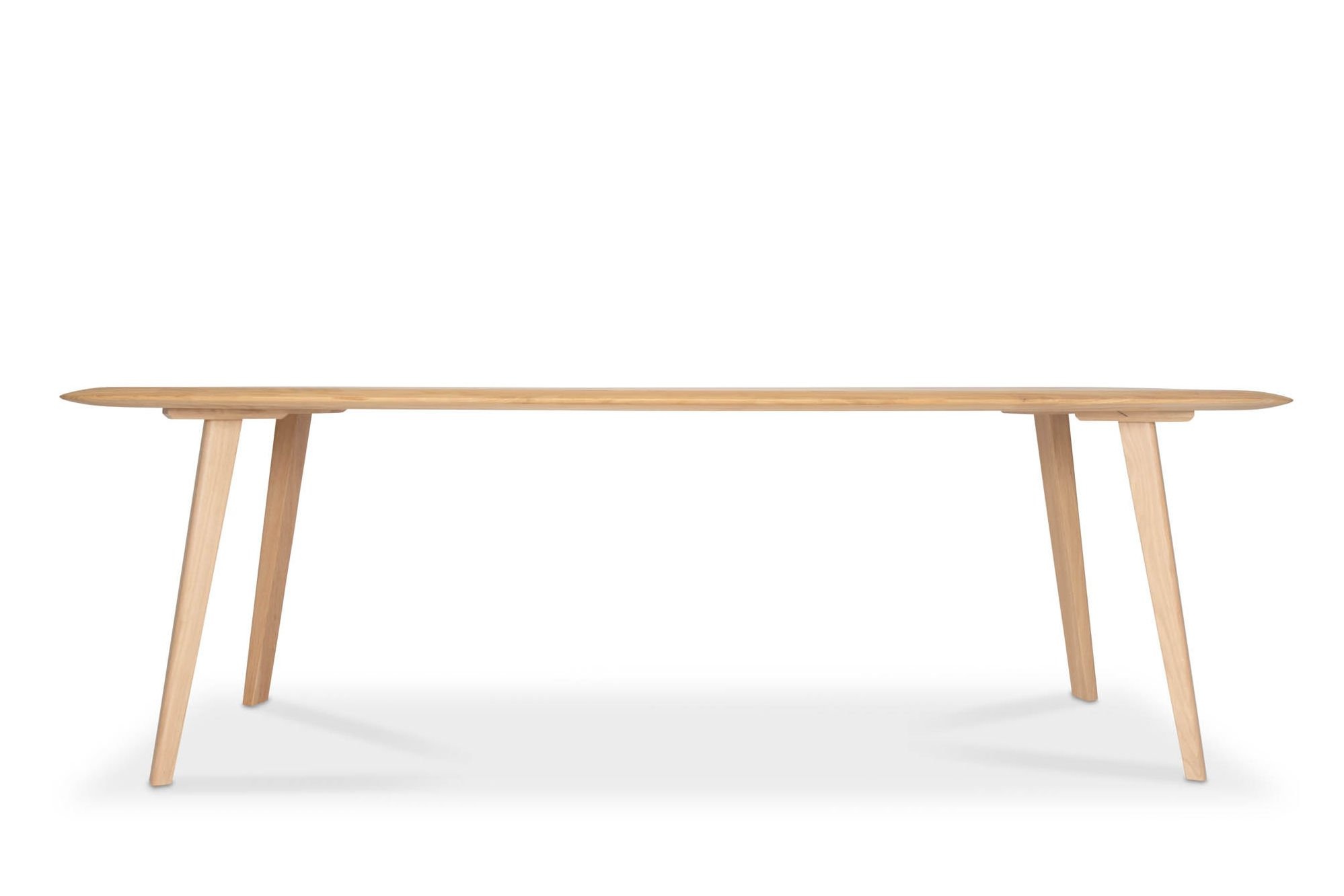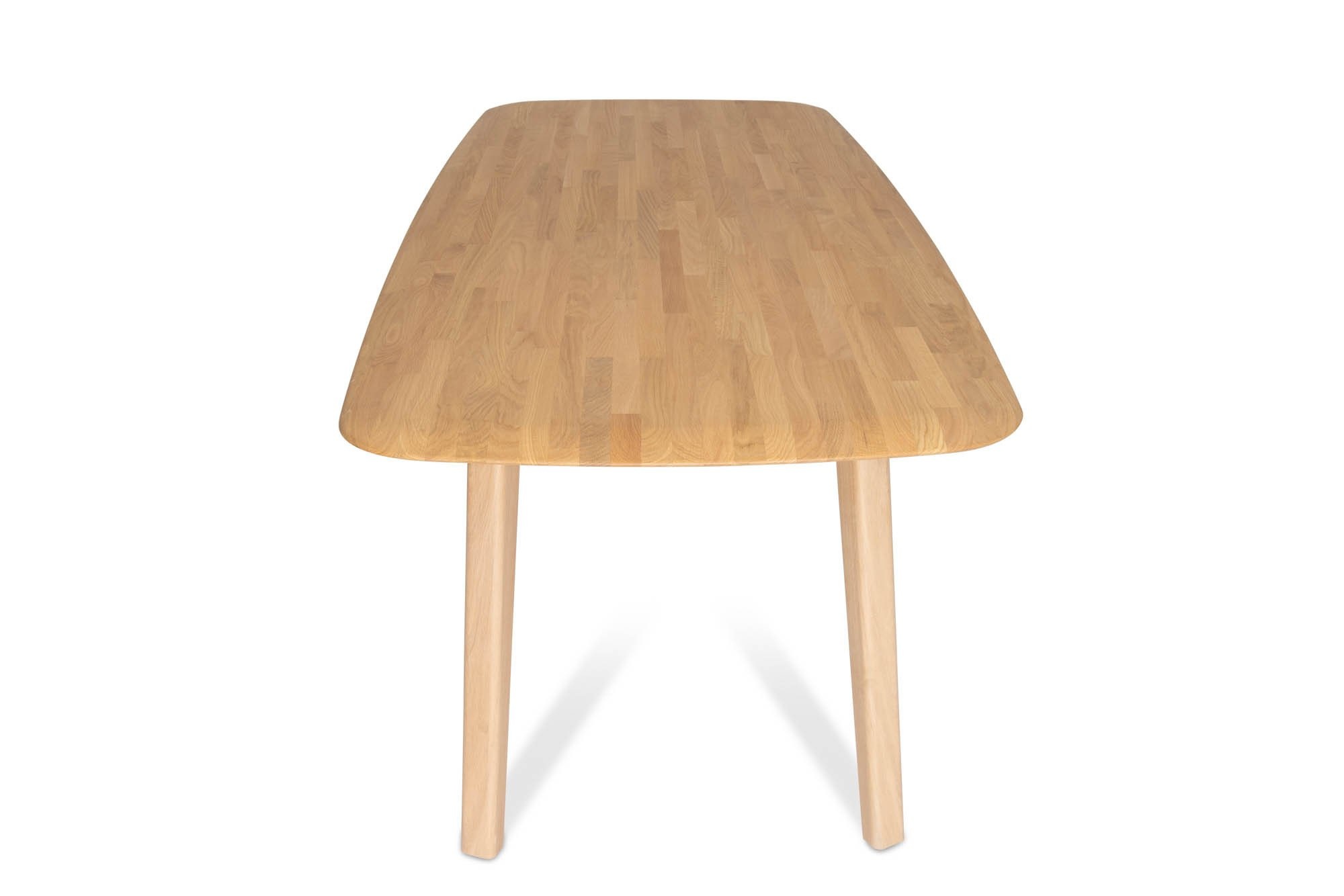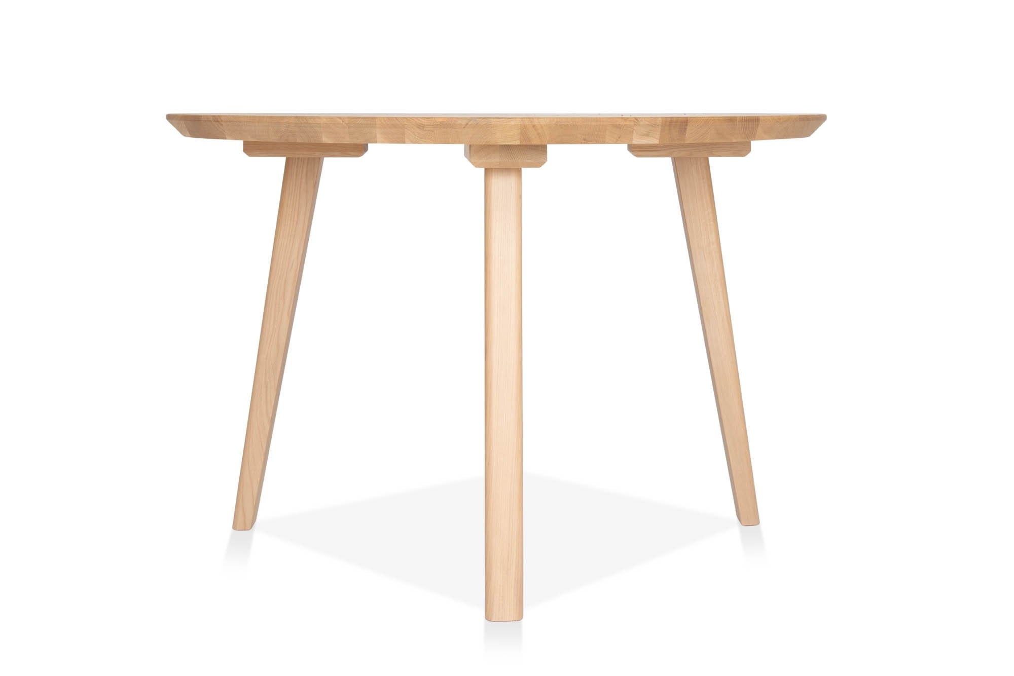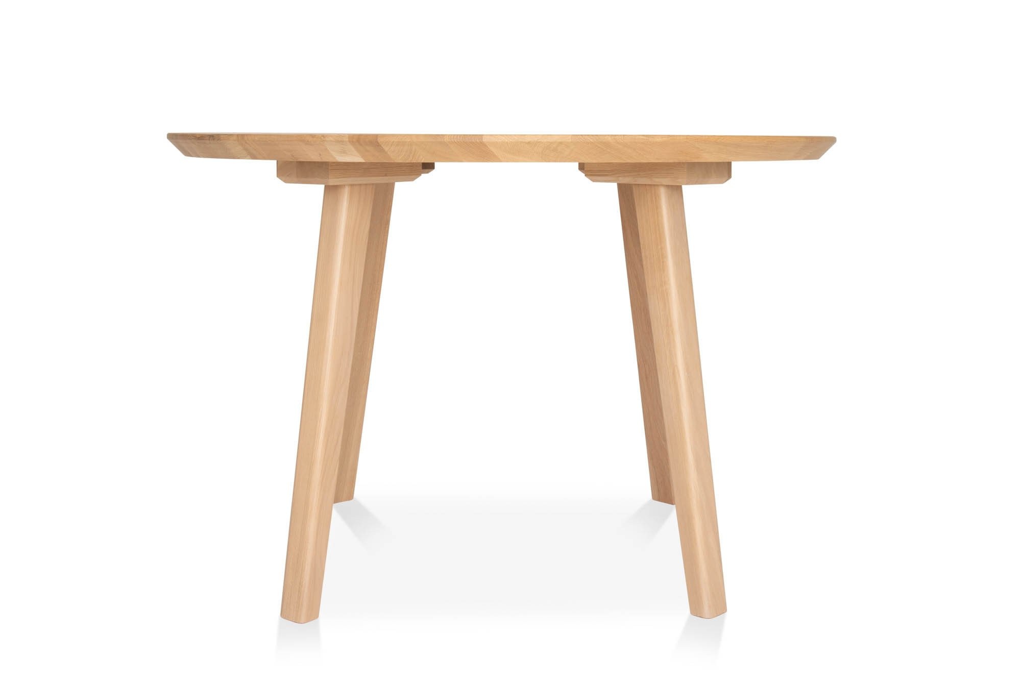Heeft een massieve eiken poot met houten koppelingsplaat die gedeeltelijk in de houten top is gezonken.