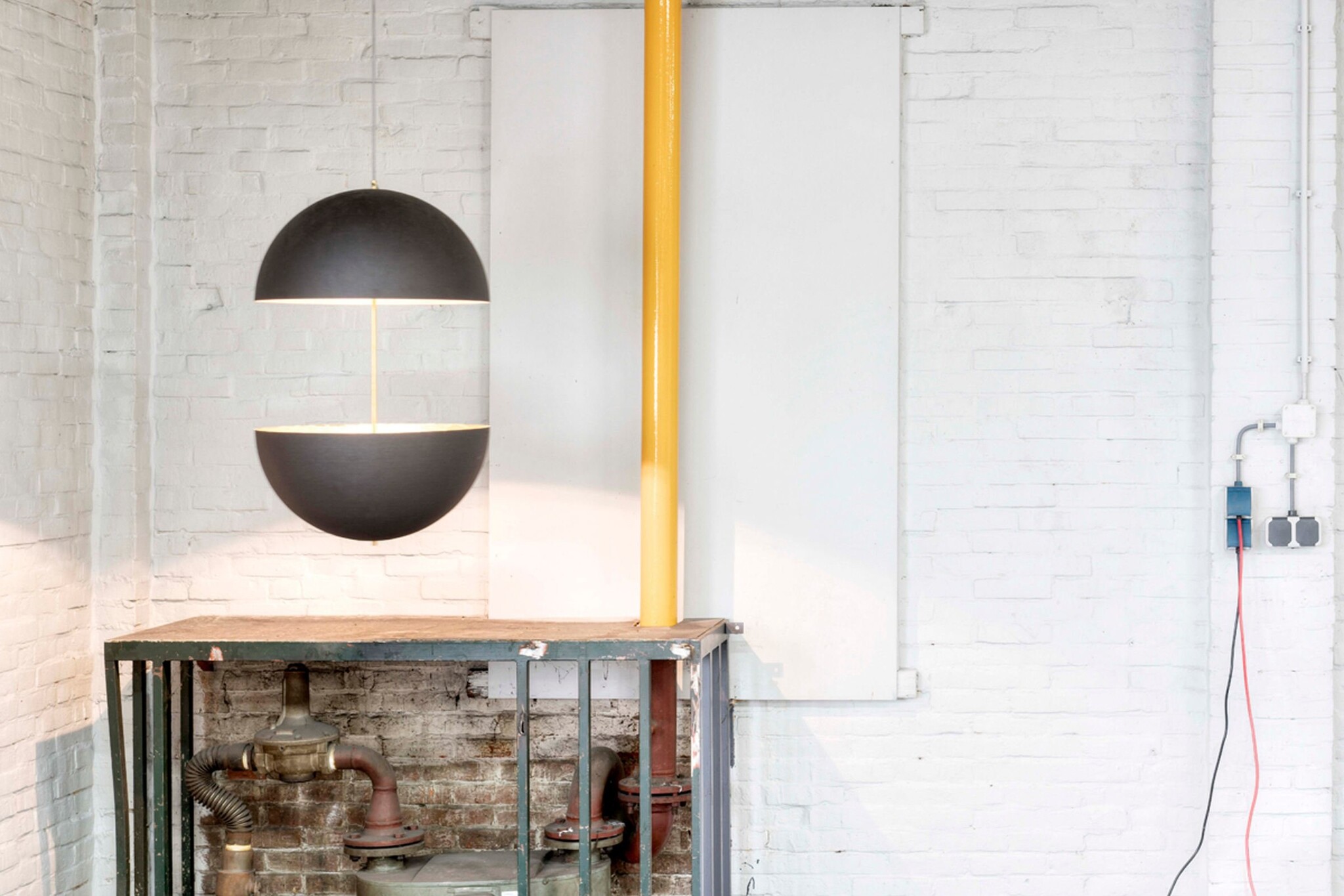 Gevingerlast eiken en gepoedercoat metaal voor de tafels en aluminium voor de verlichting.