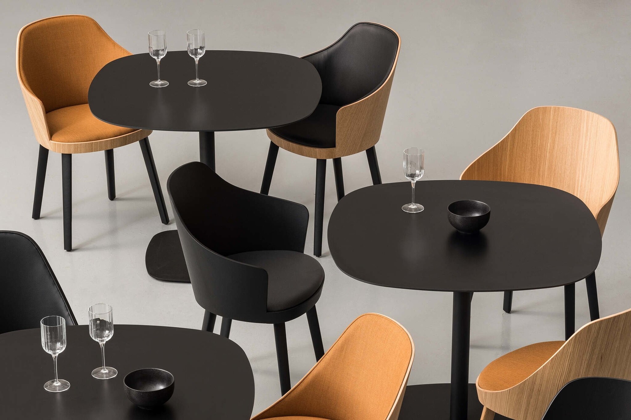 De stoel is gemaakt van een subtiel gelakt multiplex-eik en een omhullende vorm die een gevoel van intimiteit biedt.