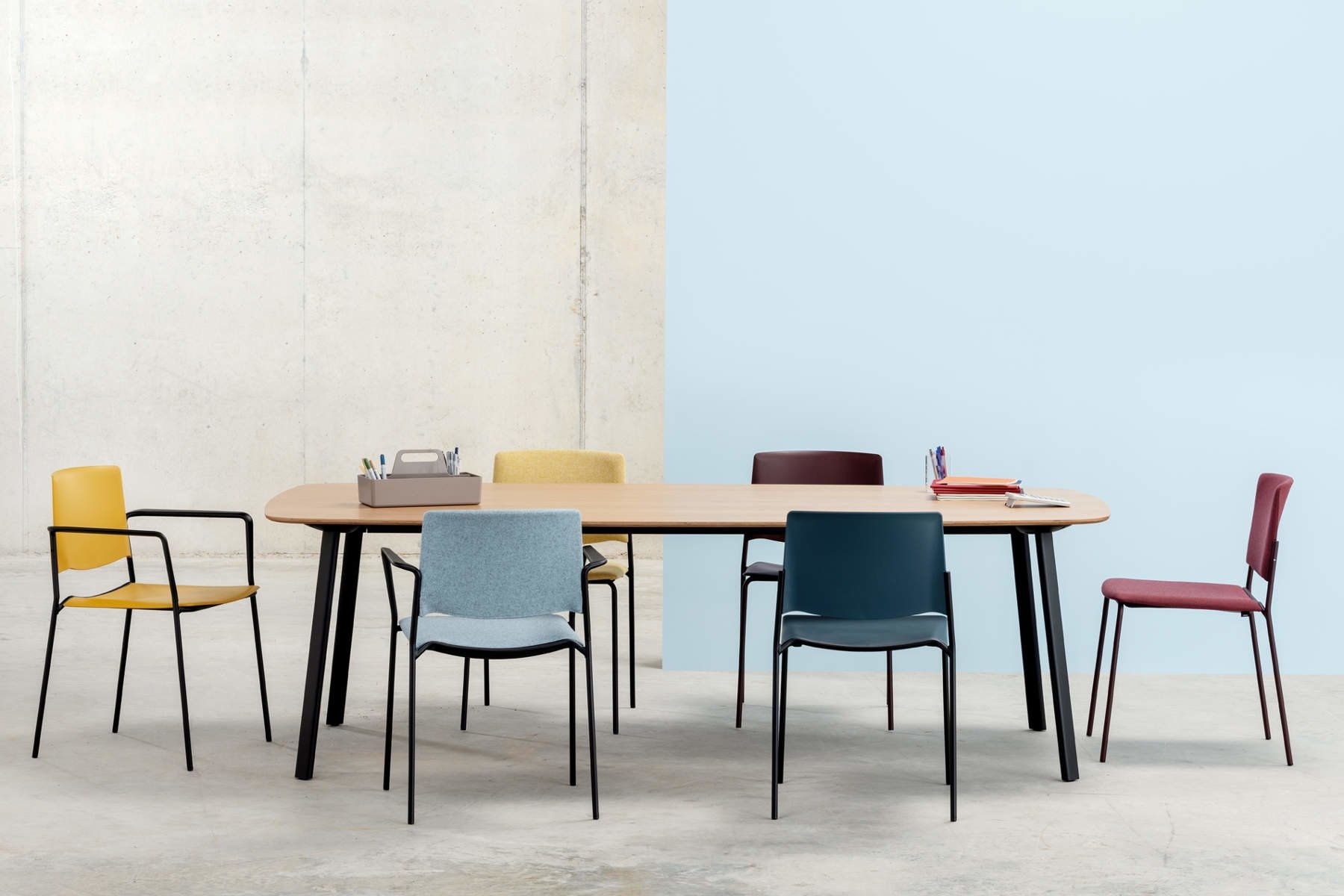 De tafel is verkrijgbaar in 12 kleuren en heeft 2 soorten basismaterialen waar u uit kunt kiezen: Hout of aluminium.