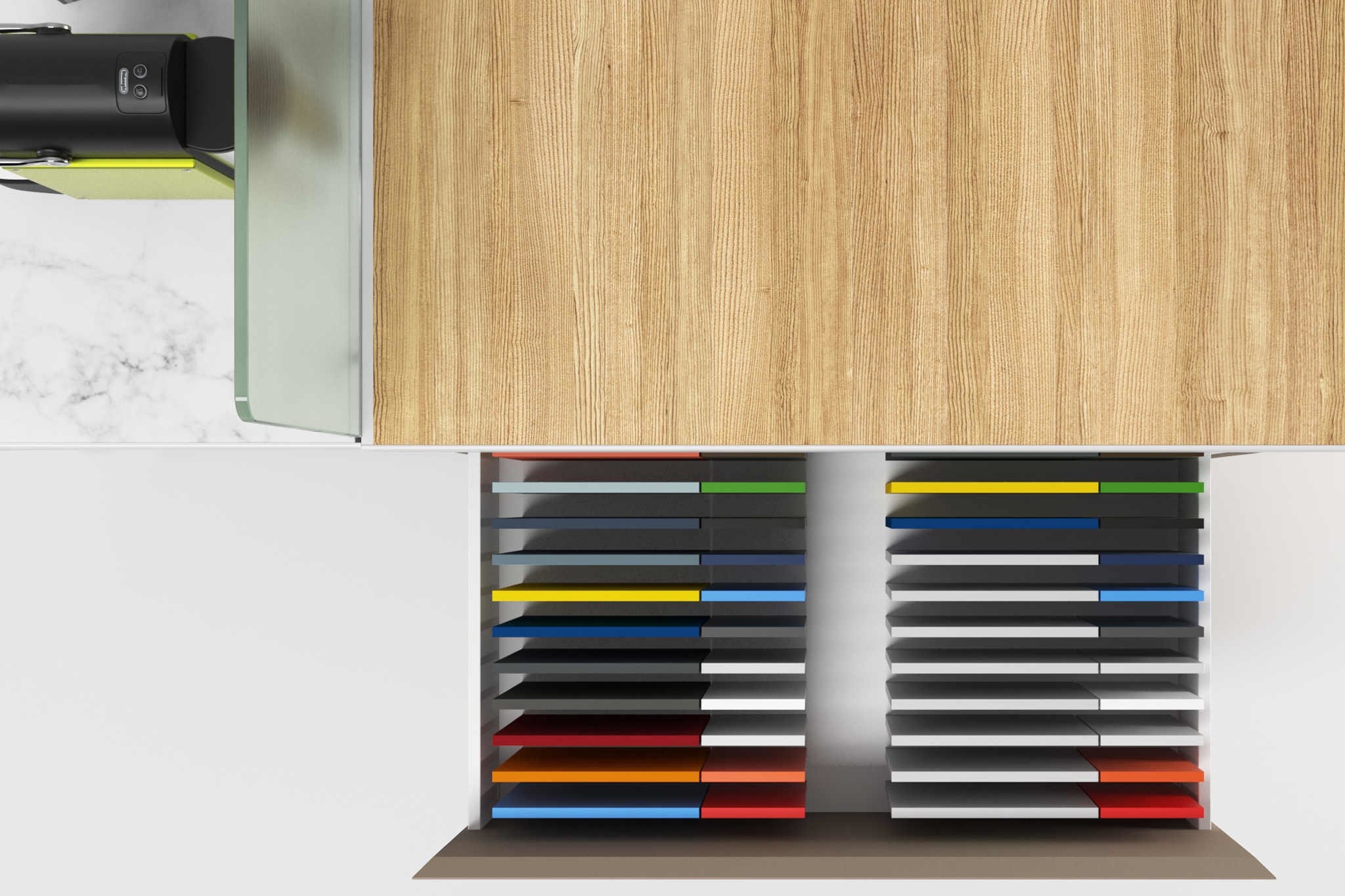 Voorzien van opbergruimte en hangelementen (voor het ophangen van stoffenstalen).