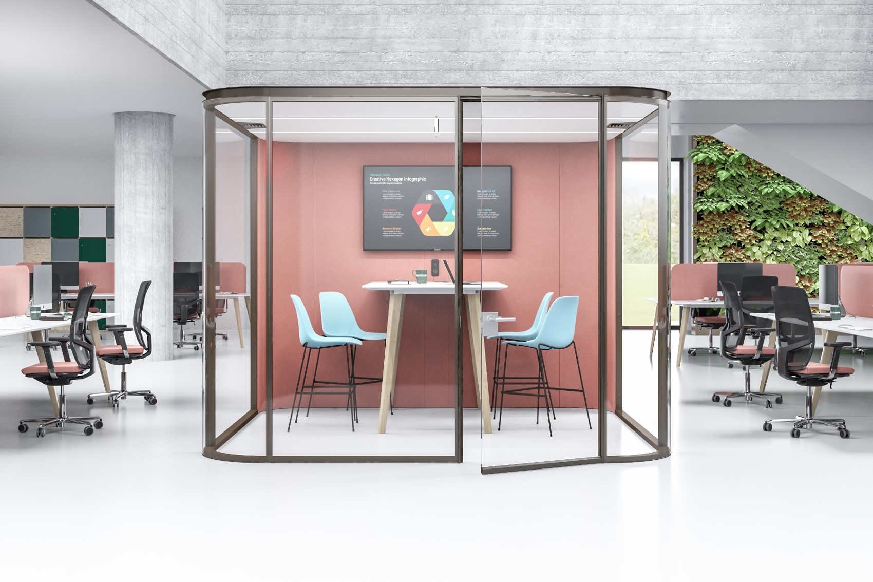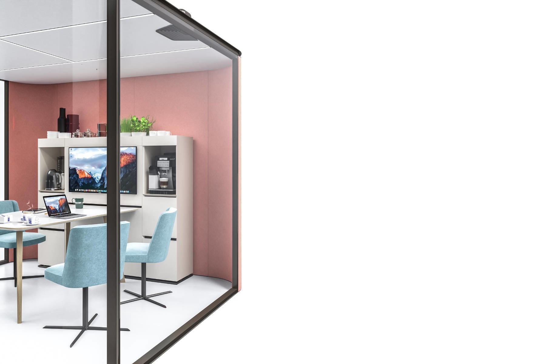 Ideaal om de akoestiek in uw open ruimte te verbeteren: Estel Collaborative Room L. Deze ruimte kan voor diverse doeleinden worden gebruikt. Zo kan het dienen als vergaderruimte, maar ook als een mini-kantine om even een kop koffie of thee te halen, zonder de werkvloer te verlaten. Estel Collaborative Room L kenmerken